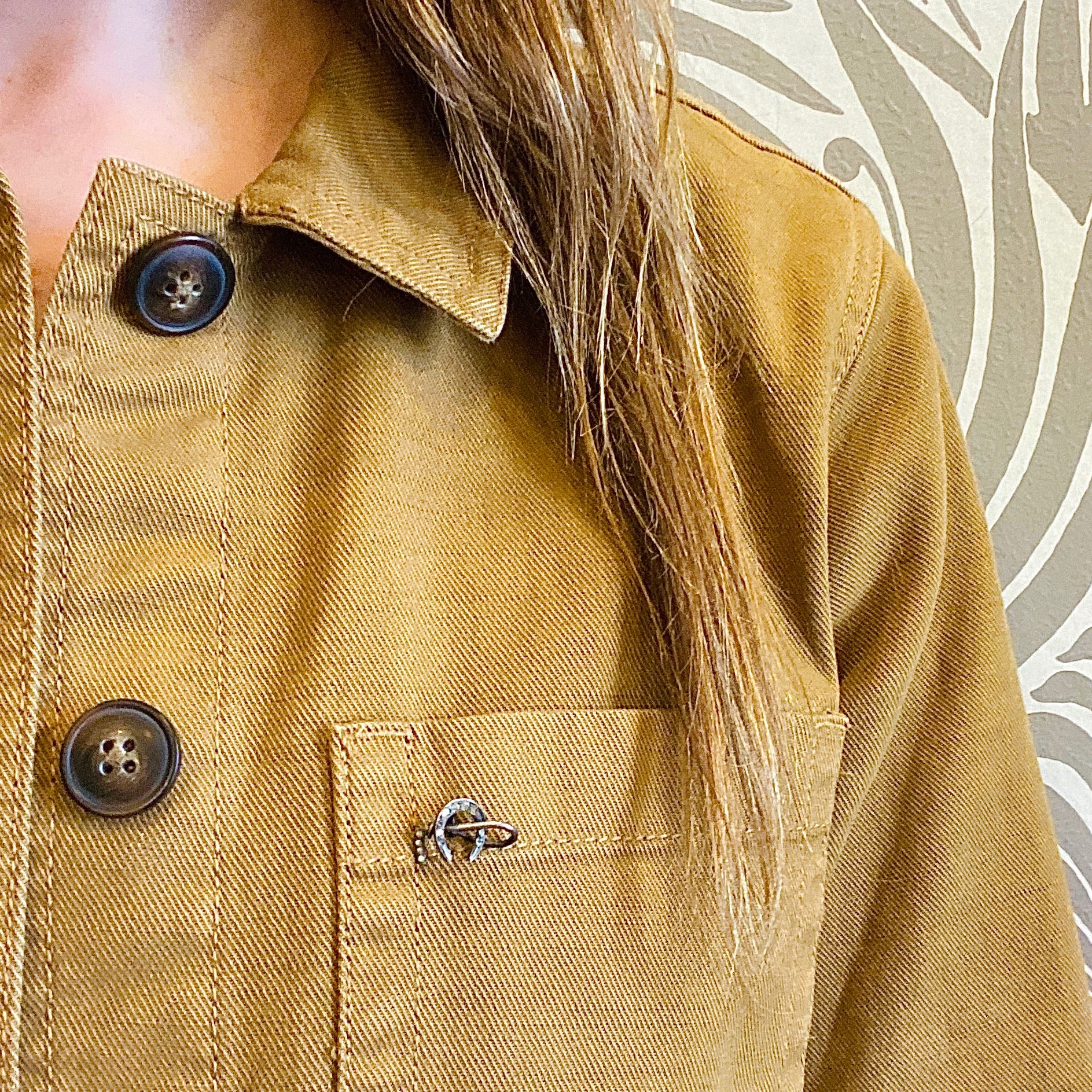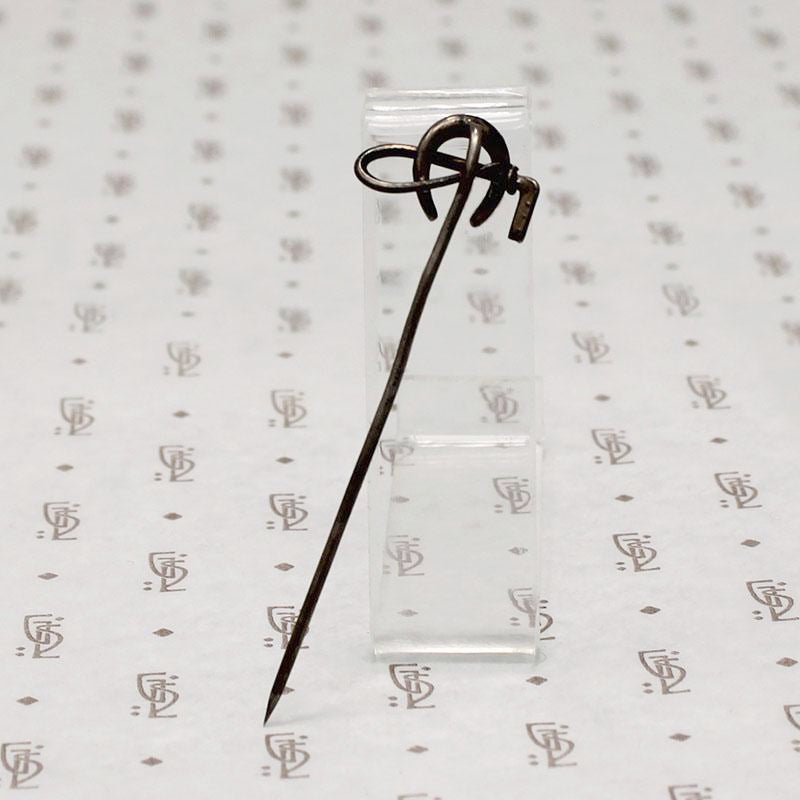 A charming 1920s stick pin. Sterling silver has been rendered into a horseshoe and riding crop, then set with white paste stones. Sporting motifs, particularly equestrian motifs, were very fashionable in the 1920s.  Stick pins are equally fabulous on your lapel or scarf.