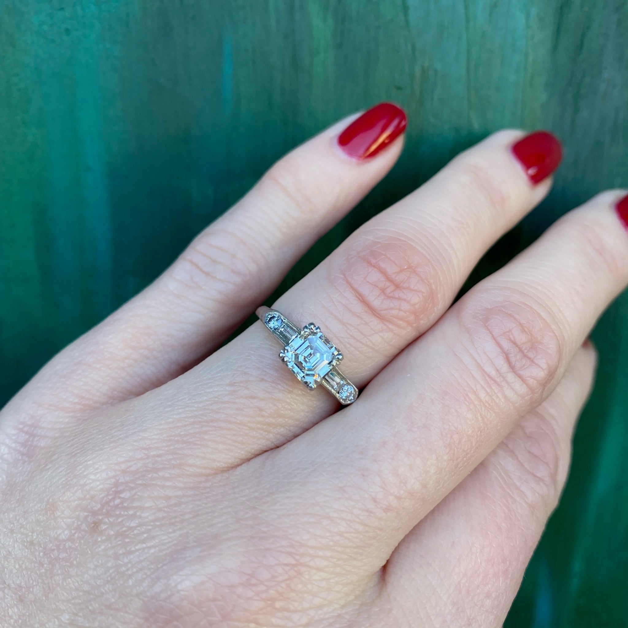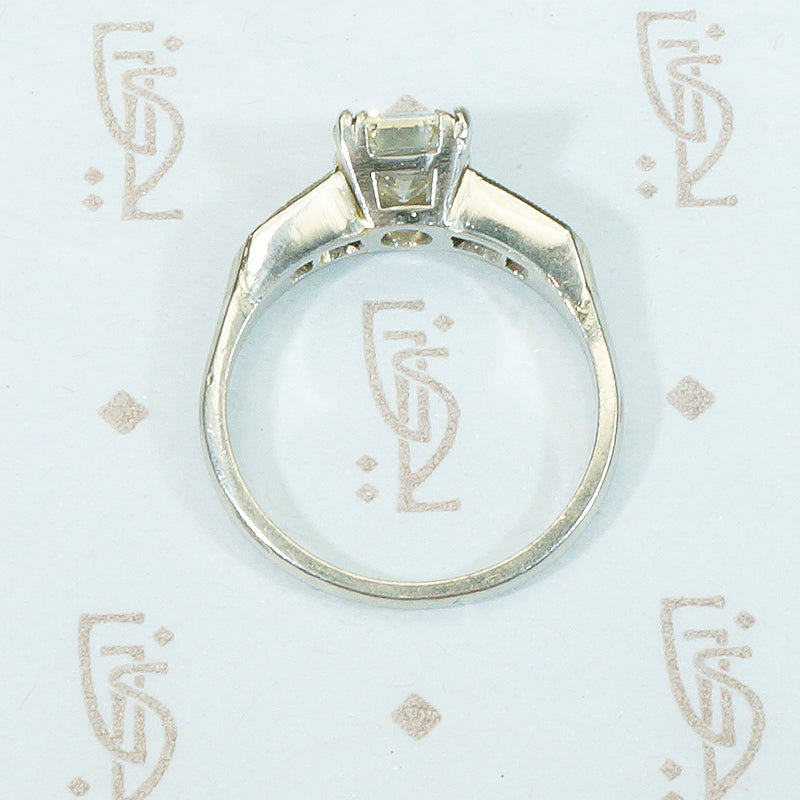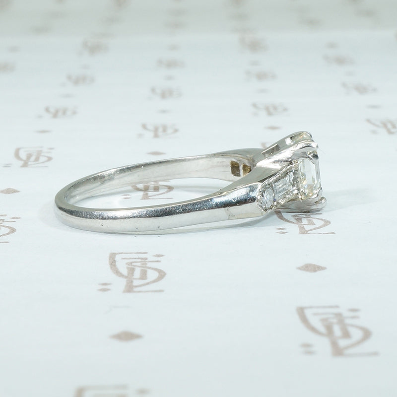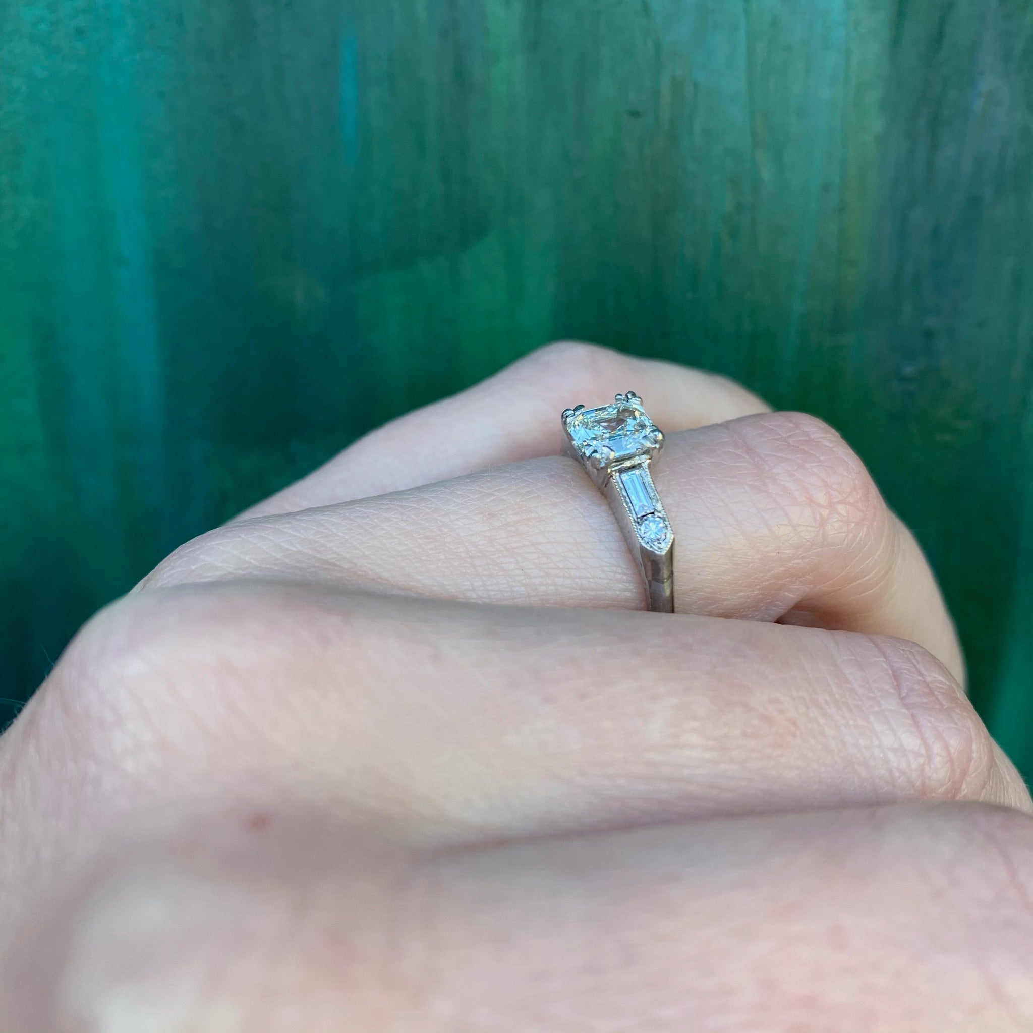 Diamond Details.....The center diamond is .93cts, Emerald Step Cut VS1-K. There are 2 baguettes .15tcw, and 2 tiny round diamonds. The center diamond comes with a GIA Report