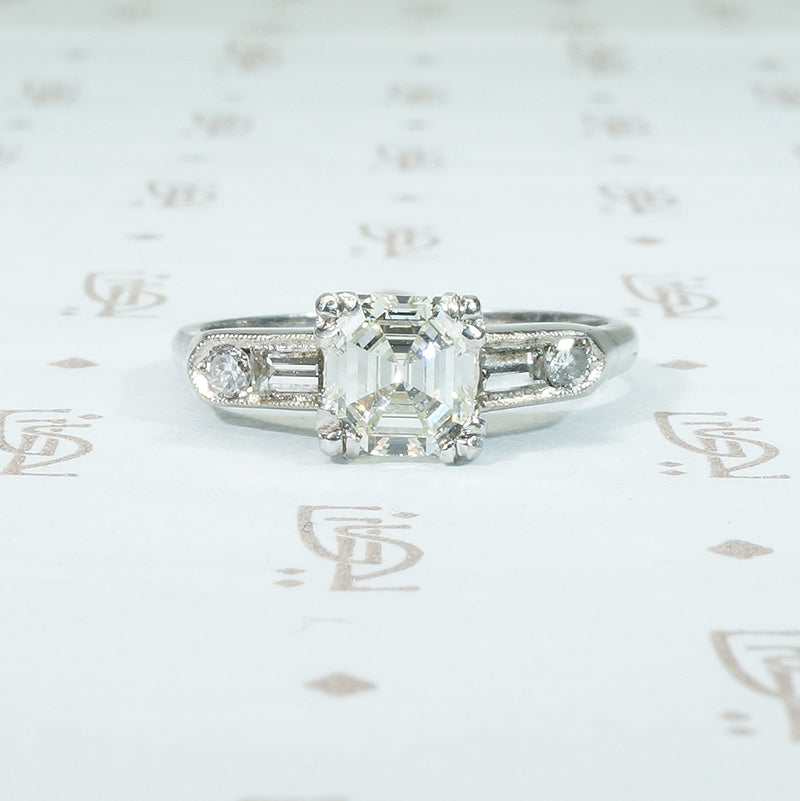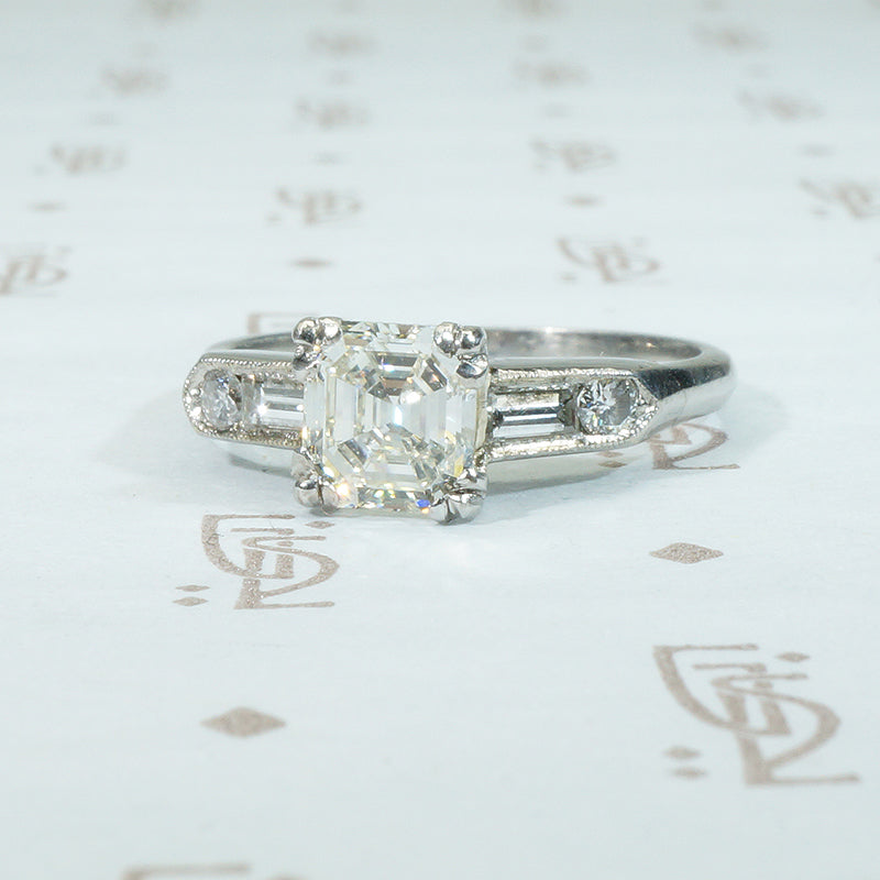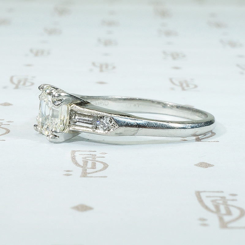 All the gorgeousness in a Platinum Engagement ring. This 1940's beauty is set with a stunning step cut diamond and has baguette and round diamonds channel set to either side of the center stone. The classic setting has a softened knife edge band. This timeless beauty is so good you will love it for a lifetime and then some.