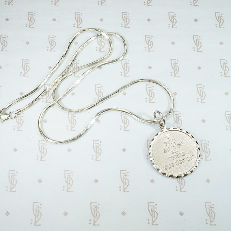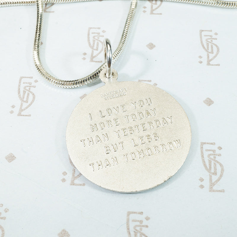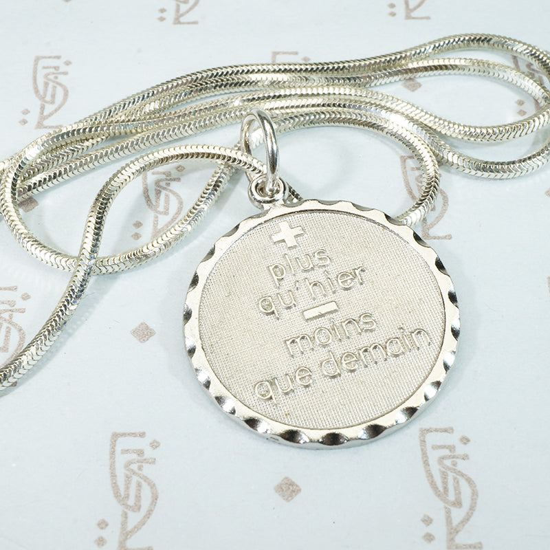 Plus qu'hier moins que demain, a phrase from a romantic French love poem, it translates to "I Love you more today than yesterday but not as much as tomorrow". The medallion dates from the 1950's, it is signed Danecraft and marked sterling. The chain is a geometric sterling snake chain.