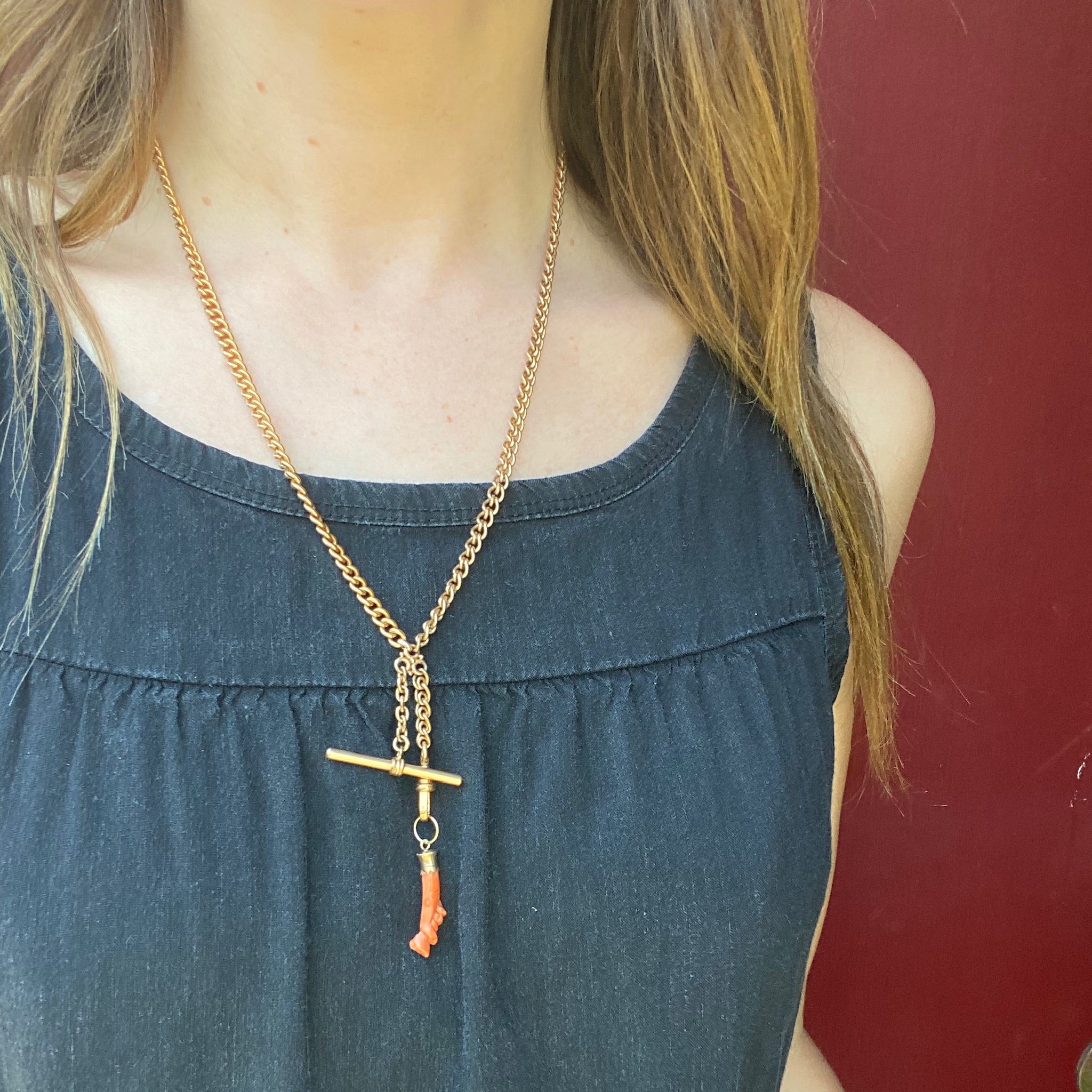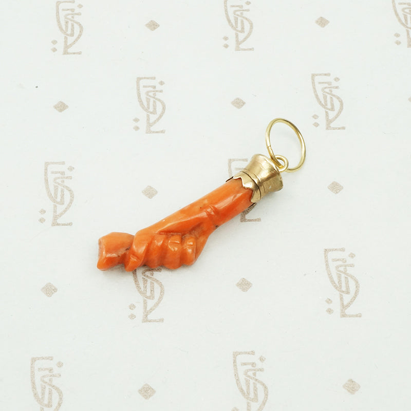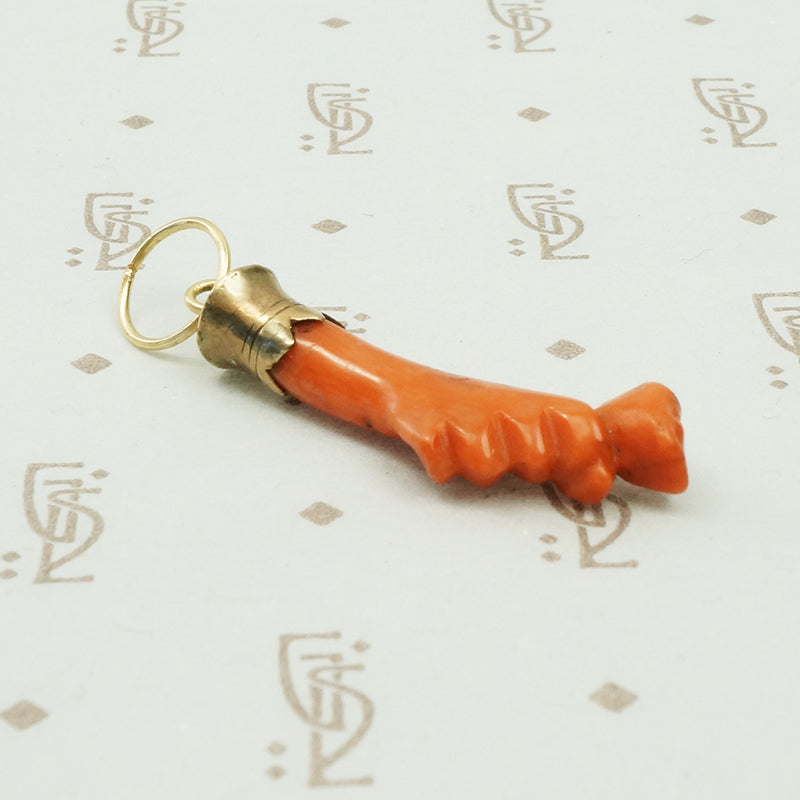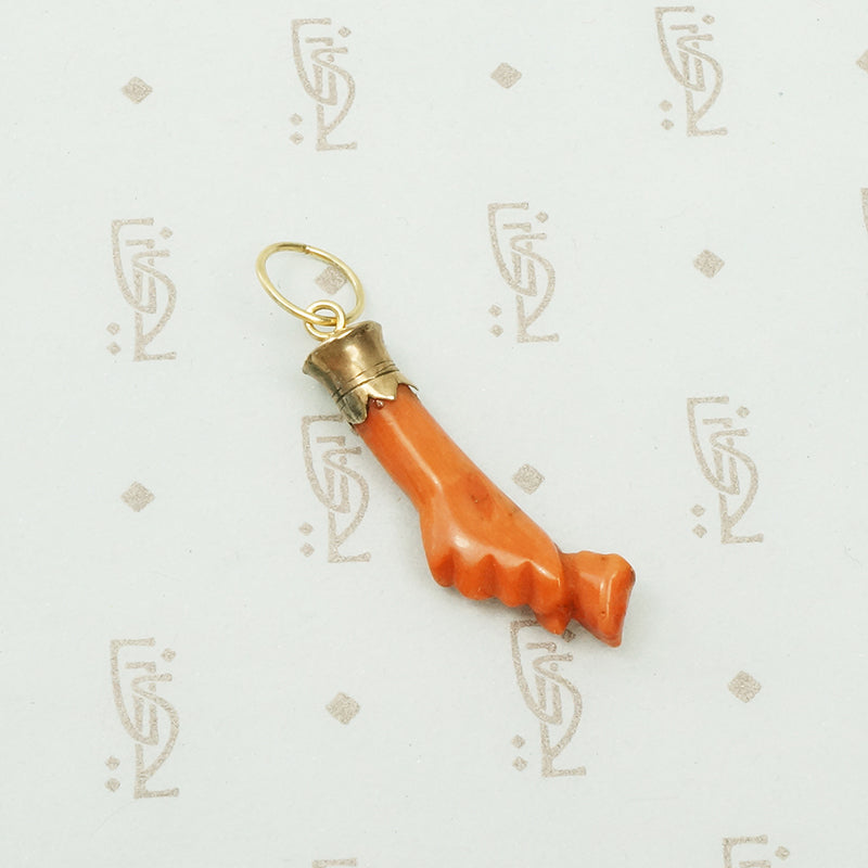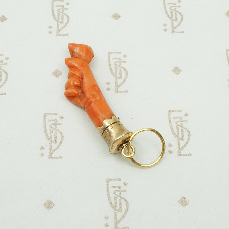 I love the Georgian and Victorian obsession with hands. This lovely charm is a hand holding a rosebud carved from natural red coral with a 12k yellow gold cuff. We added a large 14k yellow gold ring so you can easily slide this on a chain or a charm hook. Circa 1840.