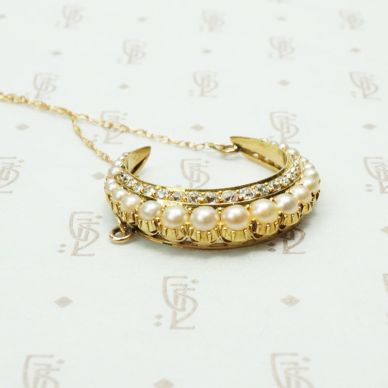 This gorgeous waning Crescent Moon Pendant is set with 1/2 carat of old mine cut diamonds cradled in a curve of creamy pearls. Lovely details abound on this beauty from the hand cut collets to the the delicate open work frame. The Moon is 15k gold and dates from circa 1890.