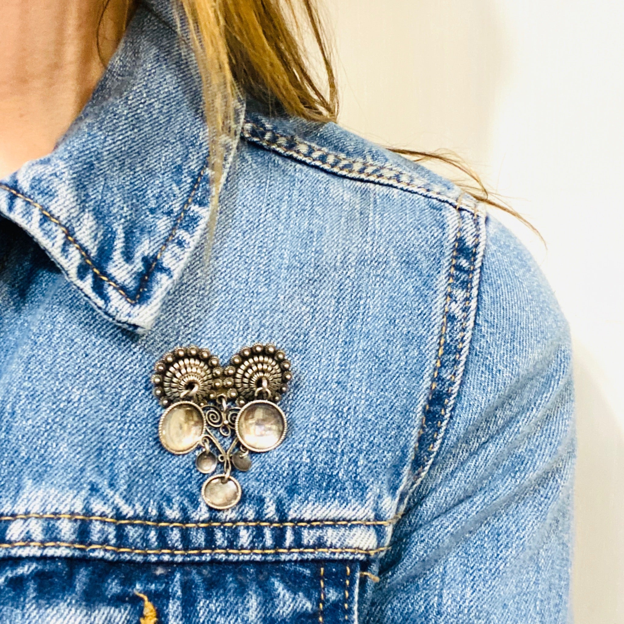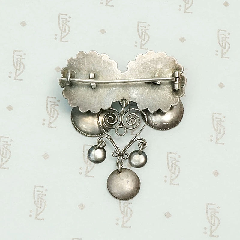 A beautiful antique Sølje brooch. This particular piece is an especially lovely example of Norway's traditional jewelry. 830 grade silver is hand wrought into exquisite designs, and the mirror discs twinkle and shine. Circa 1890.