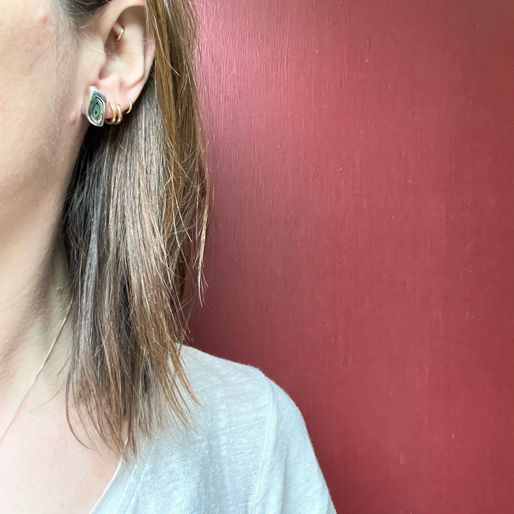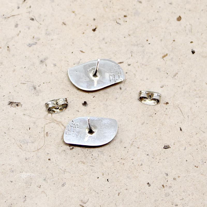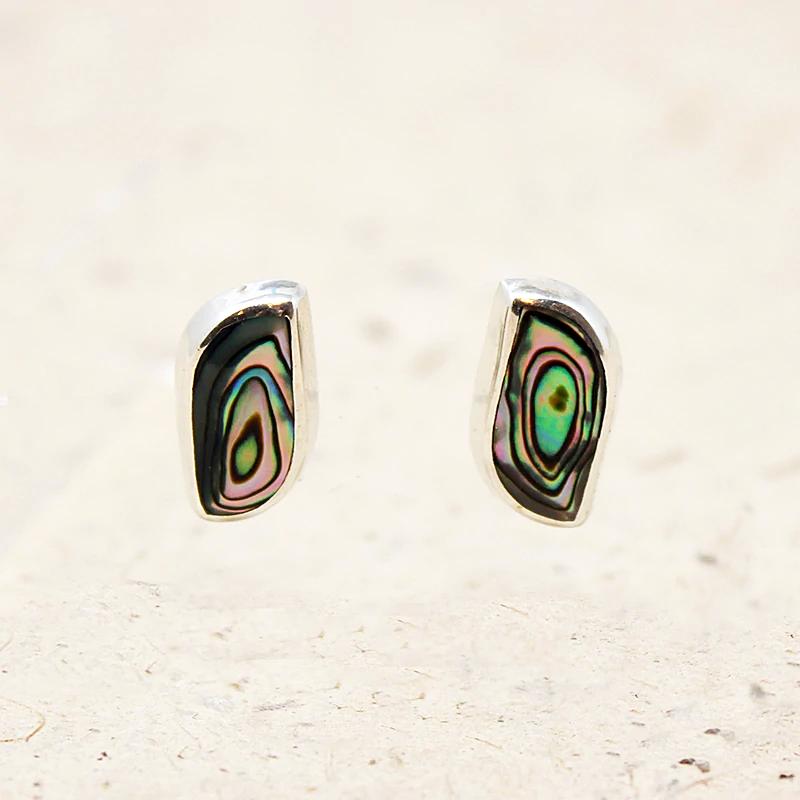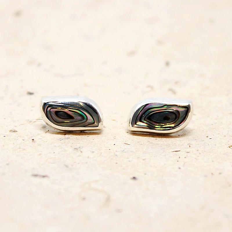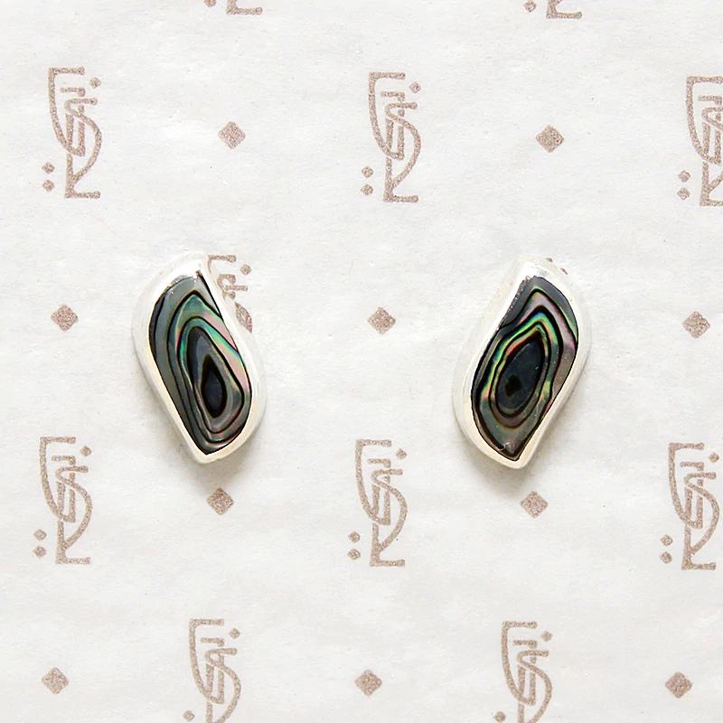 Mexican sterling silver studs inlaid with dreamy waves of abalone. The sleek silver studs are shaped like chubby tildes (~). The iridescent abalone resembles Buddha's eyes, that symbol of The Buddha's ultimate wisdom. The backs are stamped with Taxco makers marks. Comfortable to wear with no prongs to catch your hair. Circa 1980.