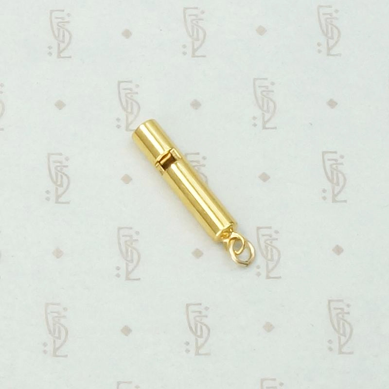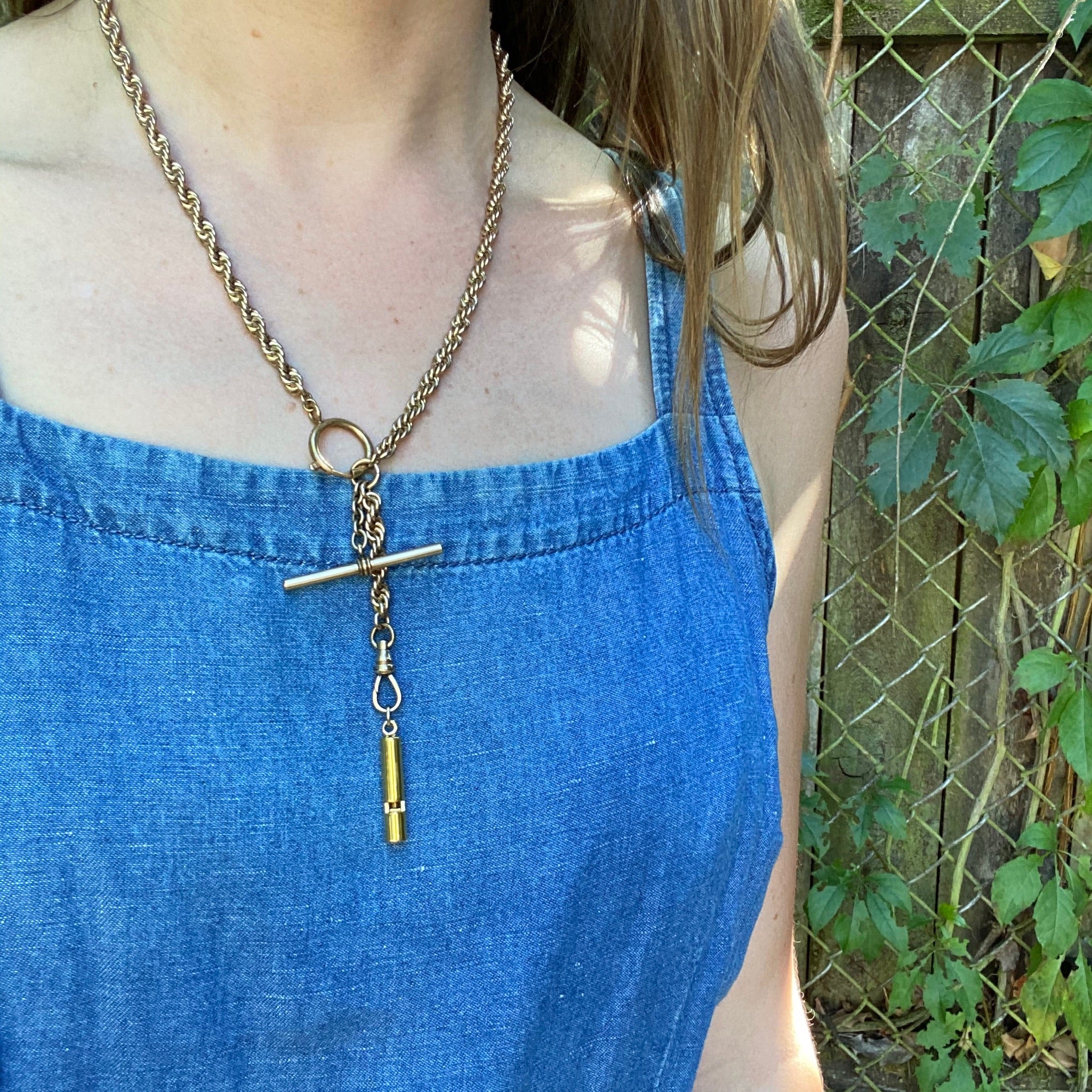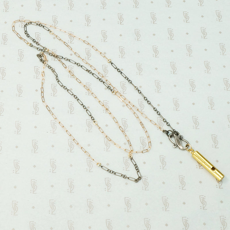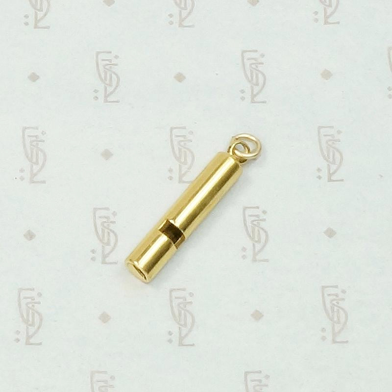 We love this adorable whistle charm. The gold plated whistle really works. Don't worry, we have sterilized it thoroughly. The whistle hangs by a jump ring, making it easy to attach the charm from anything you like. The whistle pendant is pictured here on one of our married chains, a perfect compliment to the piece and sold separately. Circa 1960.