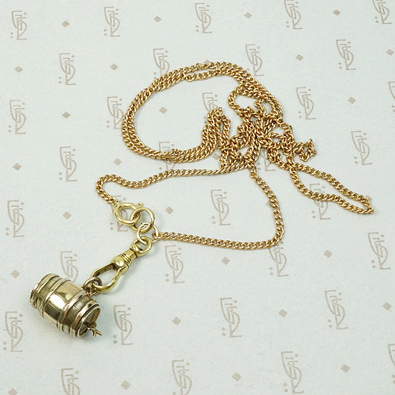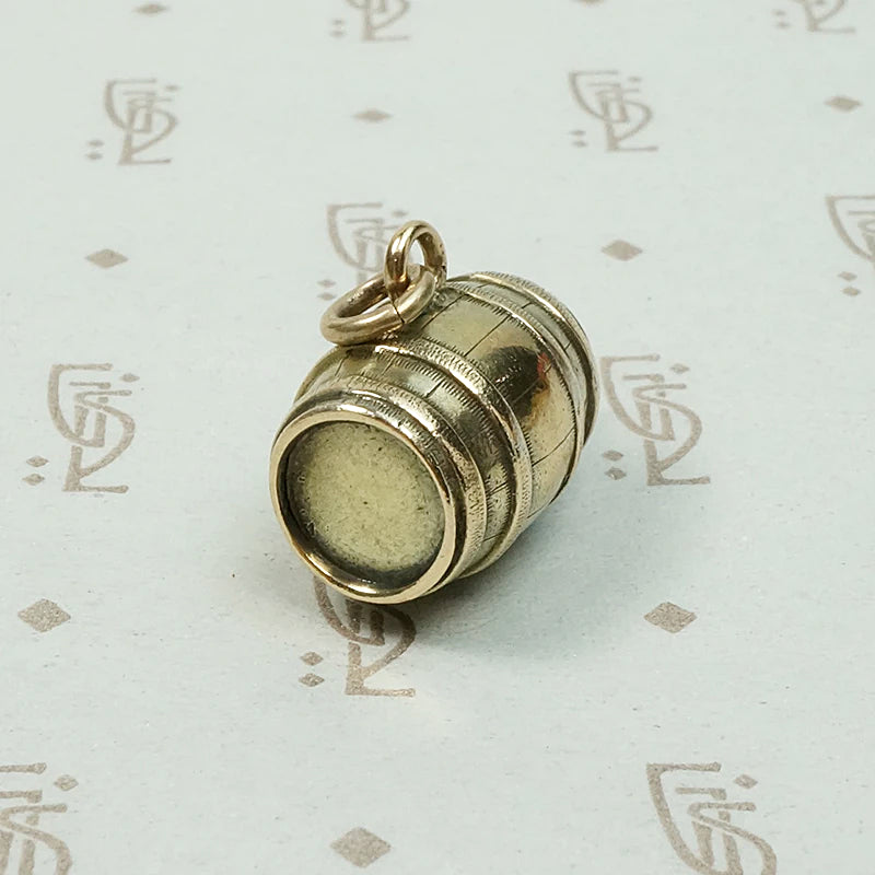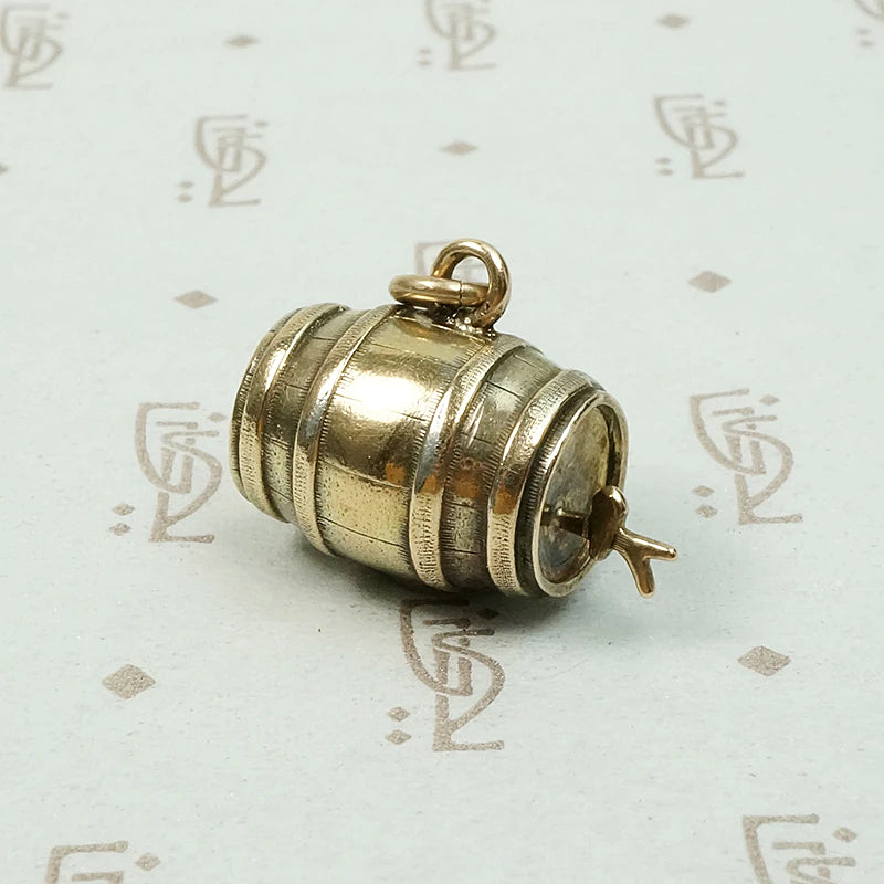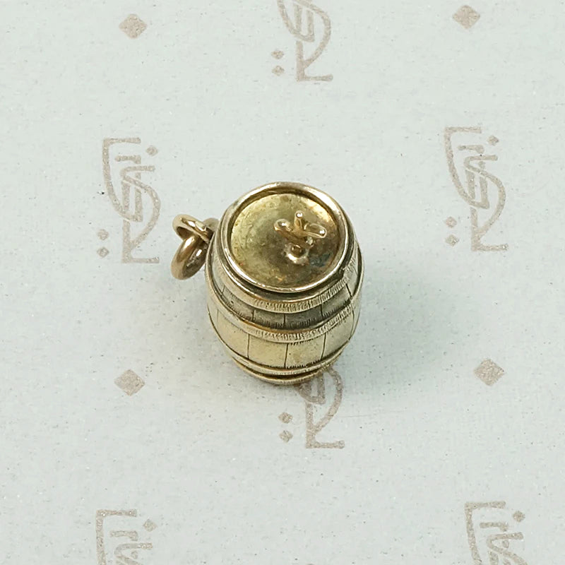 The detail is incredible on this adorable antique keg charm. The silver gilt barrel is slatted and strapped, with a tiny spigot. A heavy jump ring is attached making it easy to wear the charm on a variety of hooks and chains. A perfect talisman for anyone who loves tasty brewed or distilled adult beverages, or any jewelry loving cooper. Circa 1890-1900.