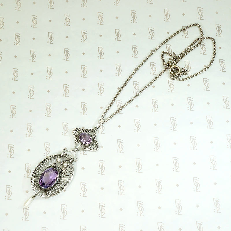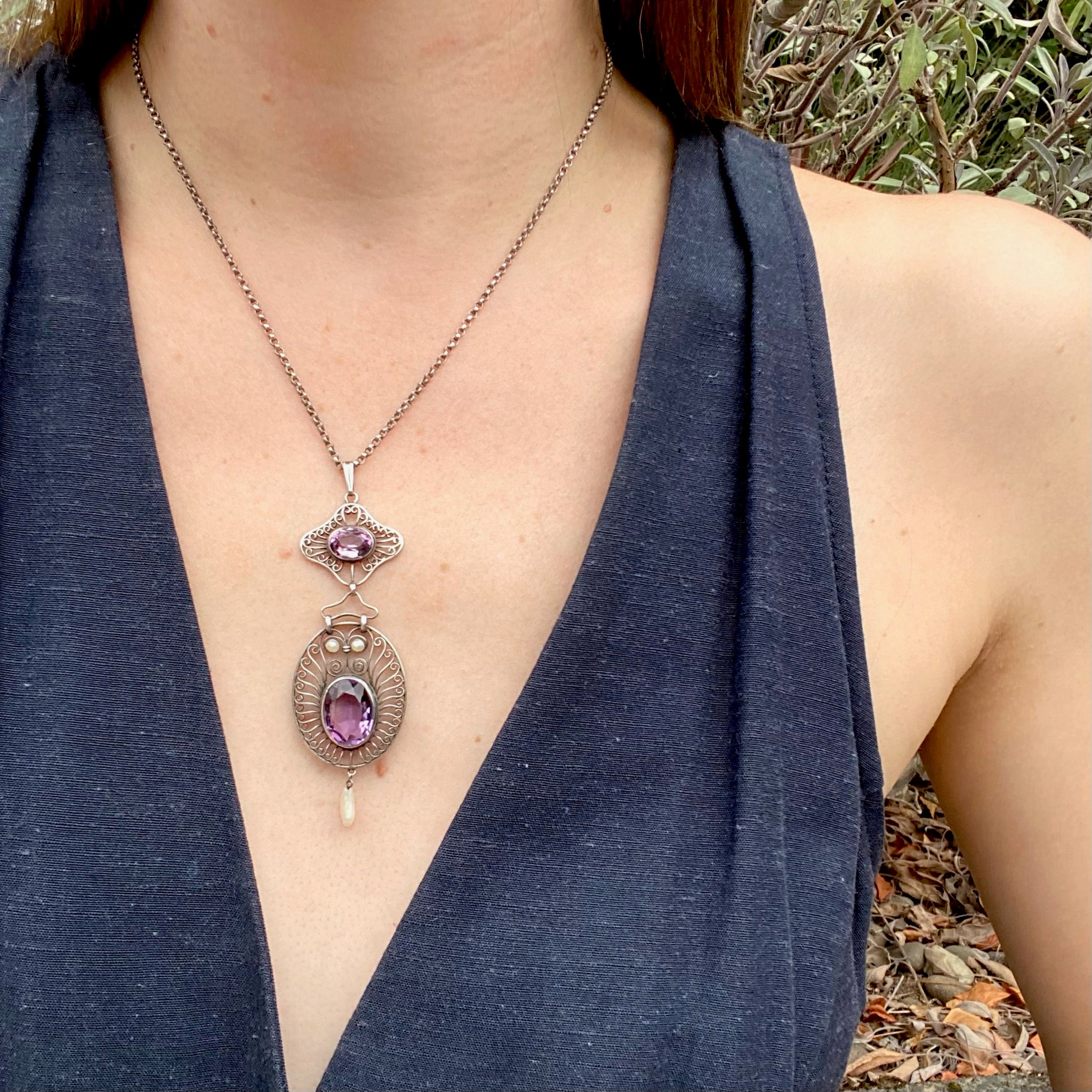 This dreamy Edwardian necklace is reminiscent of the lavalier necklaces popular during the turn of the 20th Century, with its delicate gemstone-set pendant and river pearl drop. Yet this piece was made on a more dramatic scale. The pendant is composed of two panels of scrolling sterling silver filigree, linked to create graceful movement. The silver is set with lovely Siberian amethyst and pearls, then finished with a river pearl drop at the bottom. The lacy filigree, delicate lavender color of the amethysts and the creamy glow of the pearls make this necklace so feminine and romantic. Circa 1910.