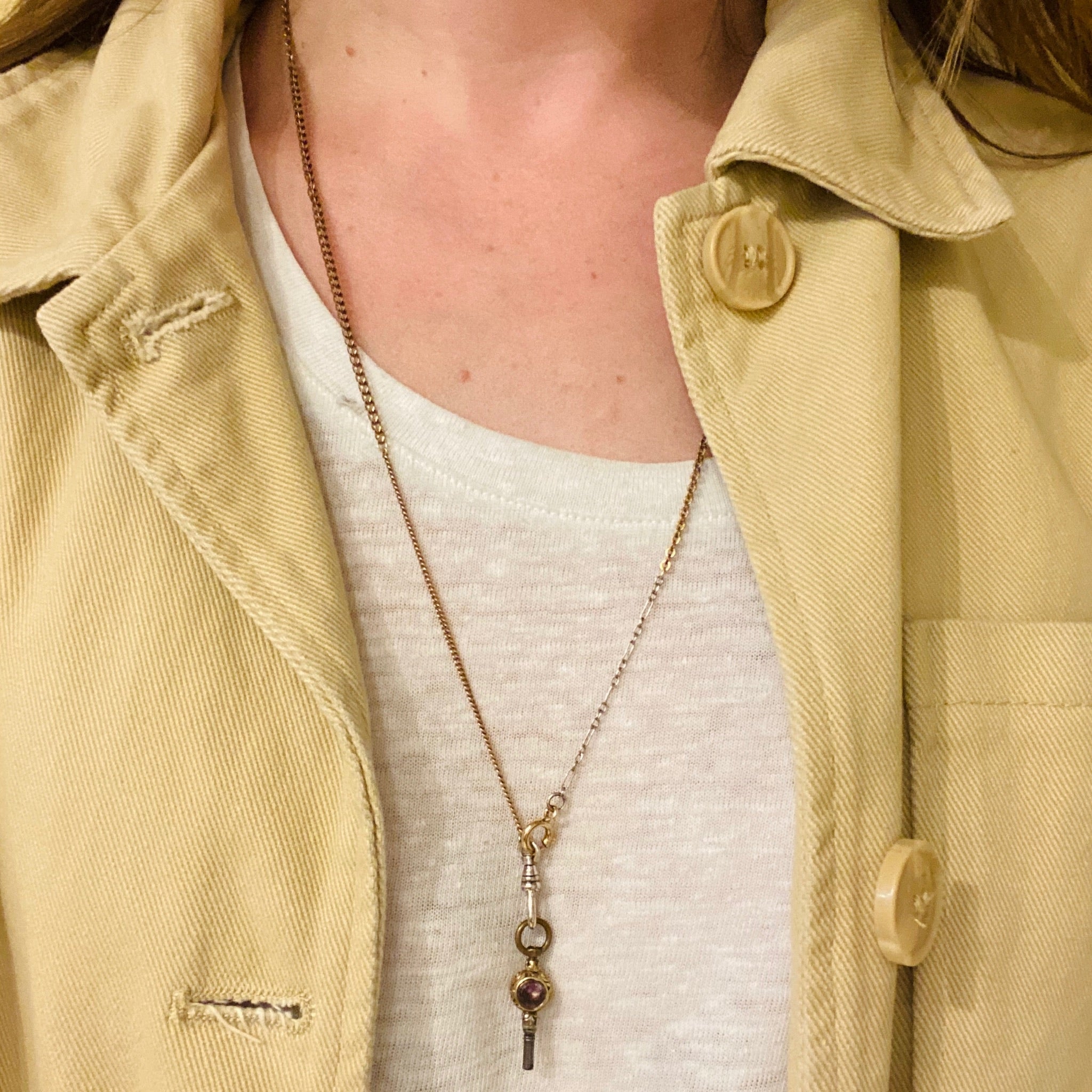 Before watches were wound by twisting the stem, a key (like this one) was fitted to a gear at the back of the watch to wind the piece. Since it was necessary to carry the key with the watch, these keys often took fanciful forms and were used as decorative fobs on the watch chains alongside the watches. Now we wear the lovely old watch keys as pendants.