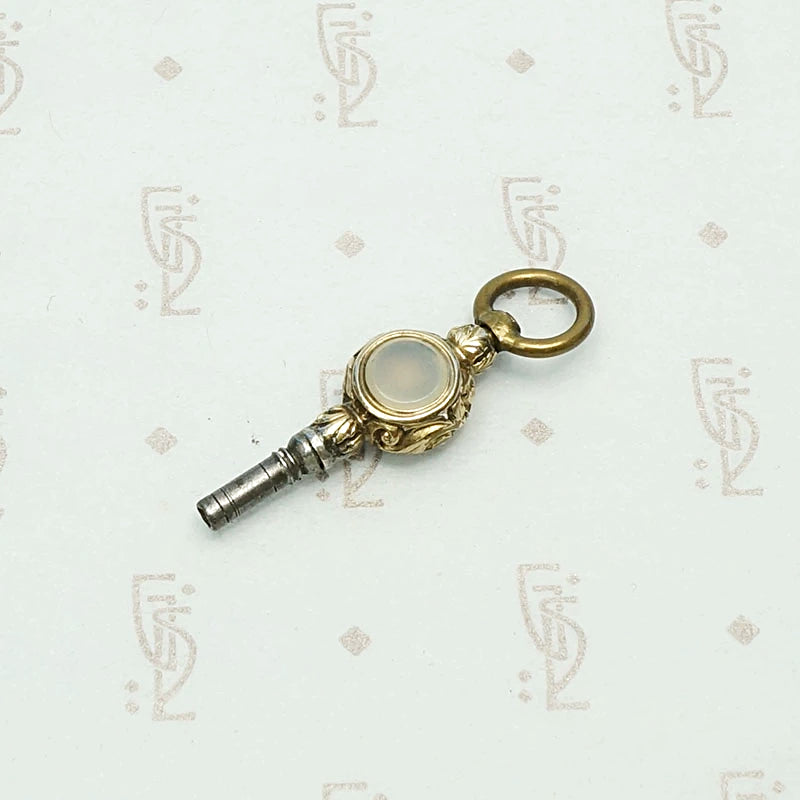This lovely gold sheeted watch key is set with chalcedony on one side and foiled amethyst on the other. The drum-style surround is engraved with a floral border. So very pretty. Circa 1840.