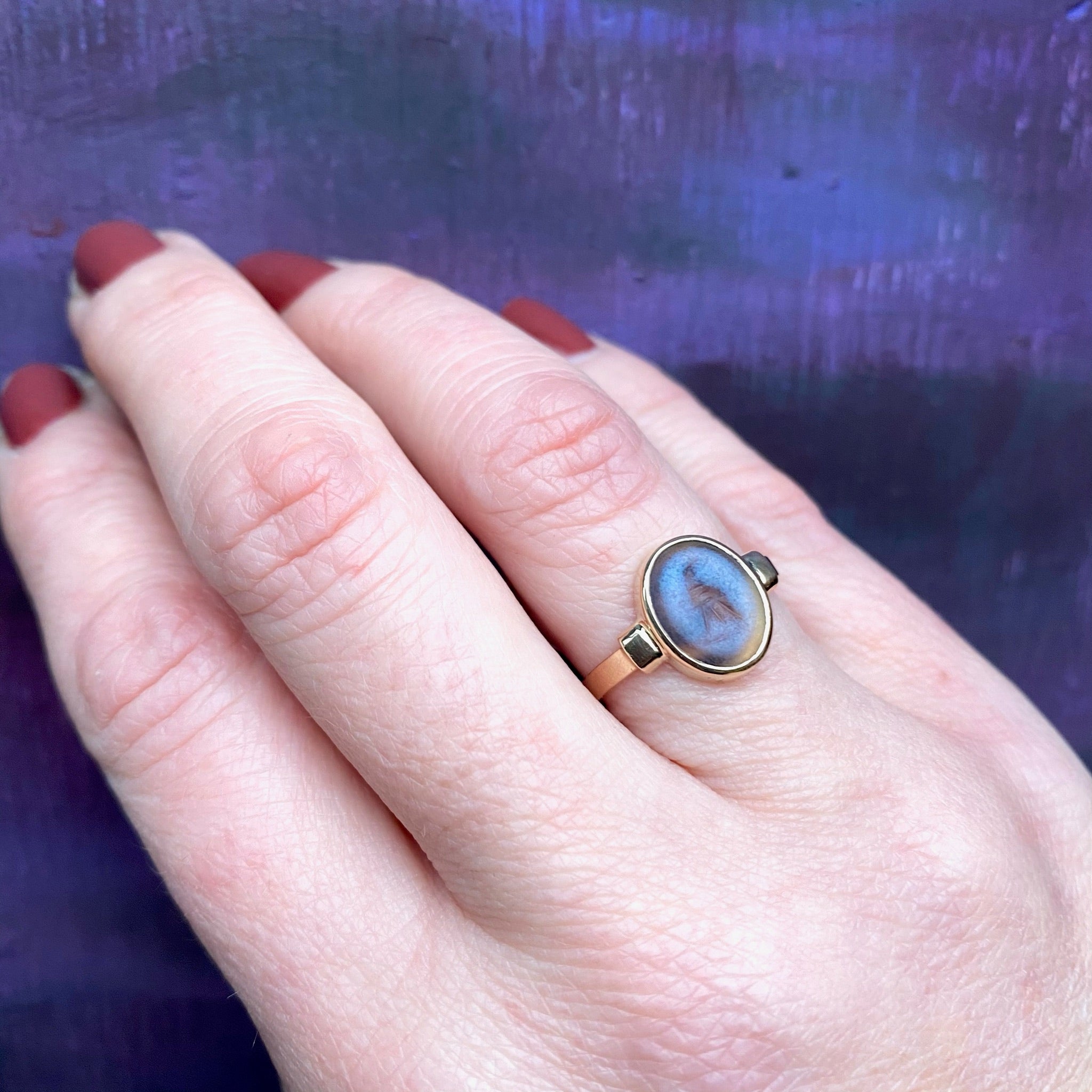 This is a really wonderful intaglio, the only Falcon in the group. The agate is banded in swirls of rootbeer brown and cream, the surface has the wonderful softness acquired thru a millennia. The intaglio is mounted in a hand crafted 14k yellow gold setting with a flat band and wrapped shoulders made especially for this gem.