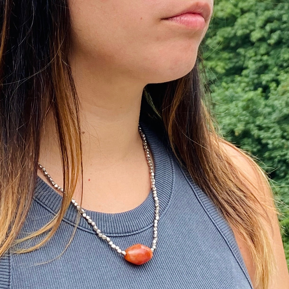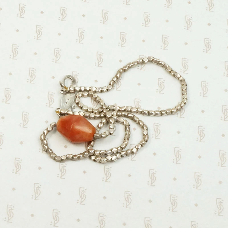A rich orangey-red ancient Roman carnelian bead is the centerpiece of this artisan necklace. The carnelian bead is strung upon silk along side heavy 980 grade silver beads, creating wonderful organic textures. The necklace is finished with a decorative silver clasp. The carnelian bead is 1500 years old, with a smooth time-worn surface. There is something lovely about wearing something so ancient.