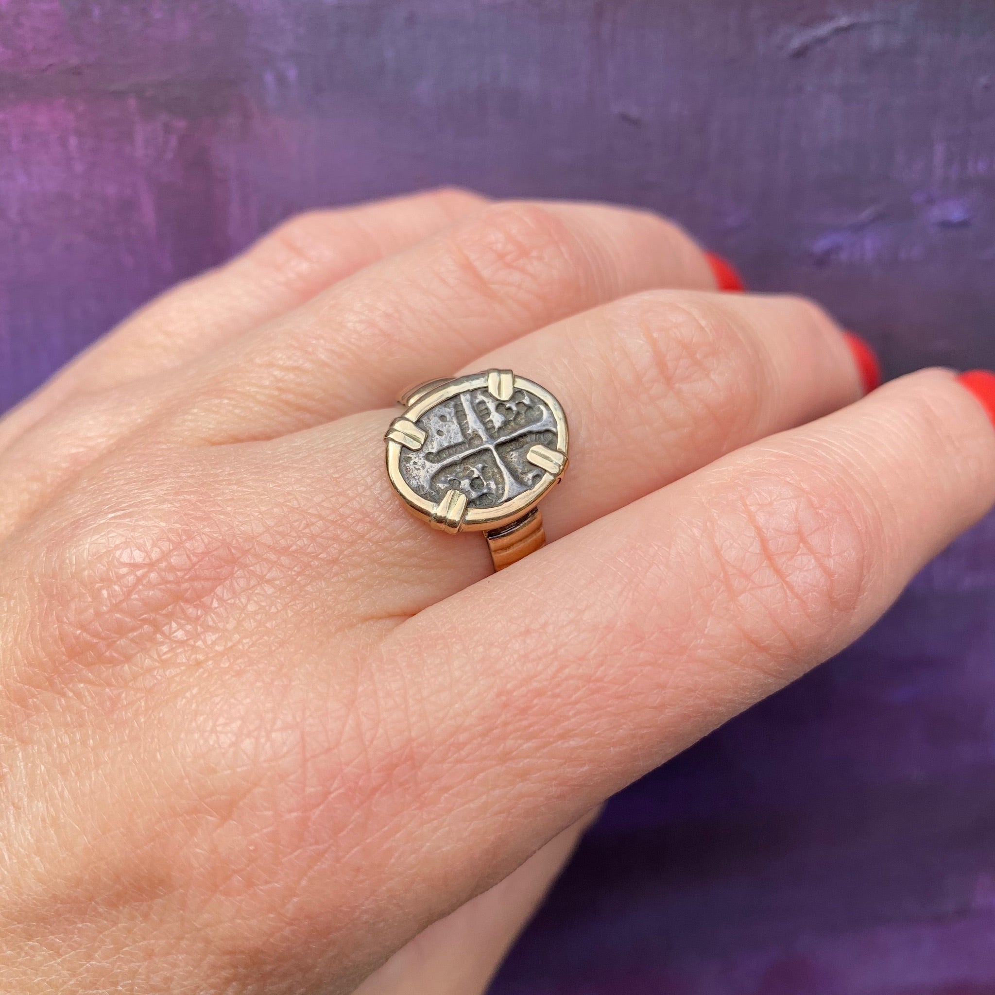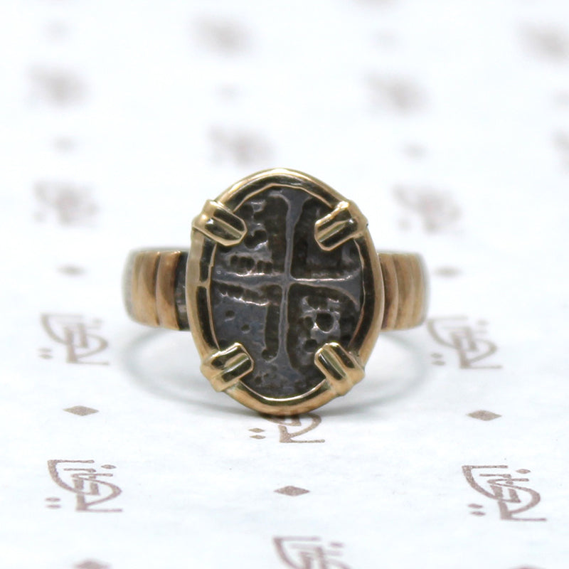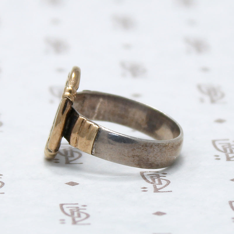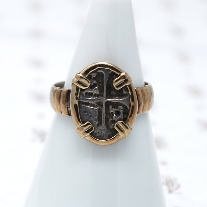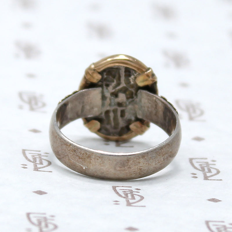 An antique coin is set in a gorgeous modern setting. We have not yet identified the coin but it closely resembles medieval European coins we have seen. The setting is sterling silver with a rich 14k gold yellow bezel and bands at the shoulders. This ring is both historically interesting and beautiful.