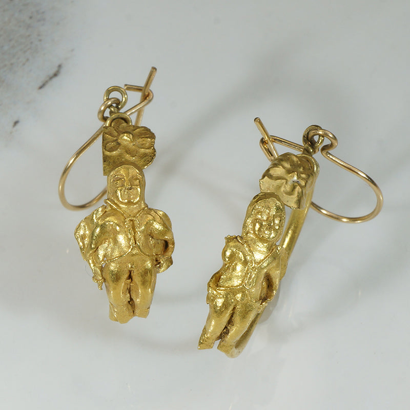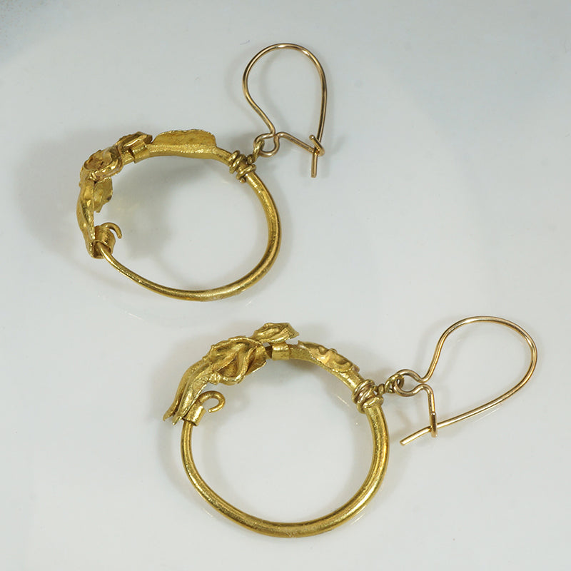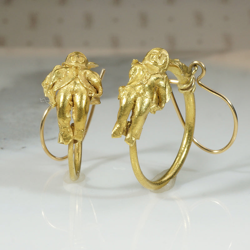 These Ancient Roman earrings are a wonderful glimpse into the life of a wealthy Roman woman. I can just imagine the fabulous Roman parties these Eros earrings witnessed. These wearable Ancient earrings date from the 2nd century CE. The gold tests at 22-23k; the hoops are twisted closed and suspended from 20thc ear wires in 14k gold. An incredible opportunity to own a piece of history.
