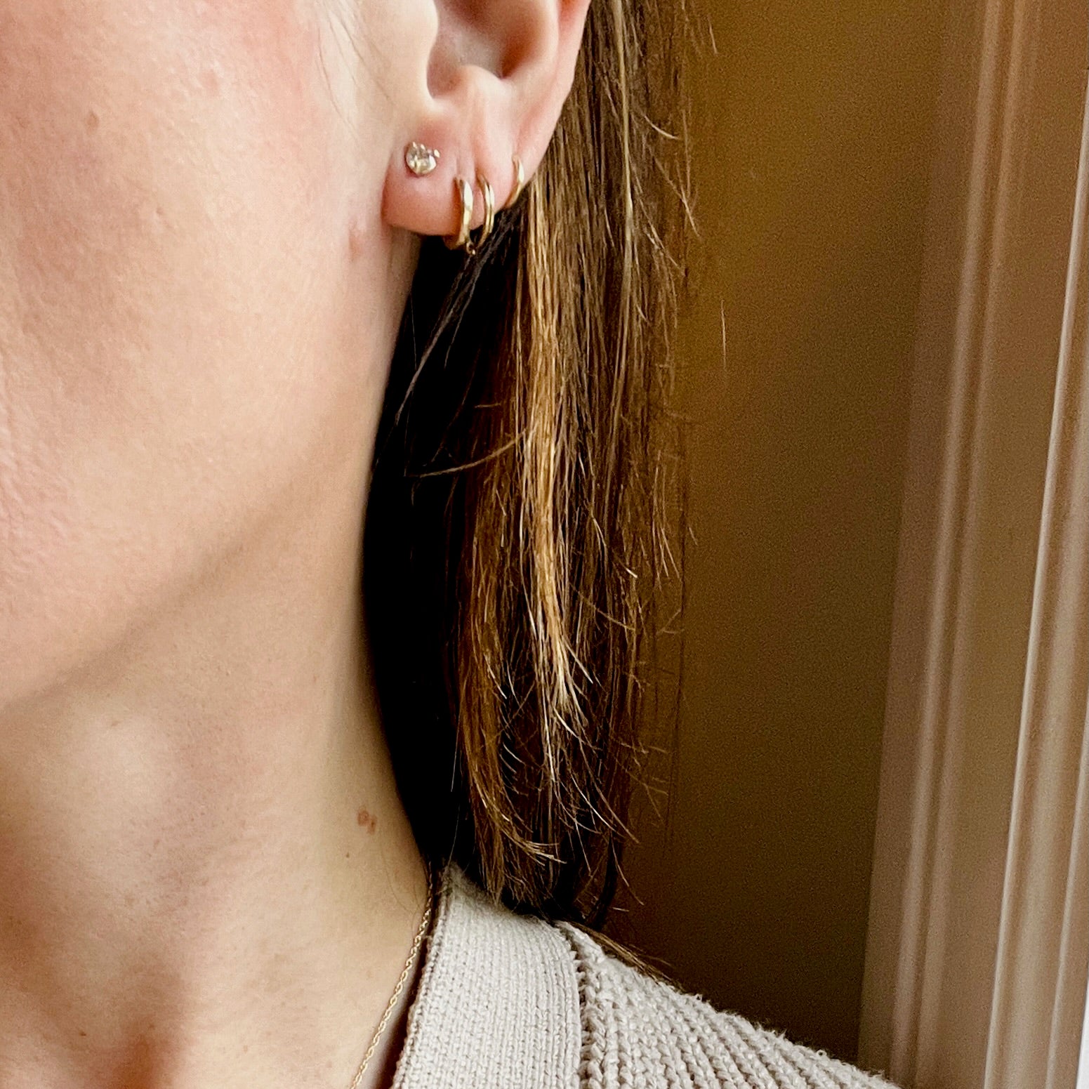 Idiosyncratic antique diamonds are set in recycled 14k gold stud earrings. The 0.47tcw old mine diamonds sparkle in three-prong martini basket settings. Old mine-cut diamonds have open culets, unique facet patterns, and a deep sparkle that sets them apart from modern diamonds. The diamonds date to the mid-1800s.