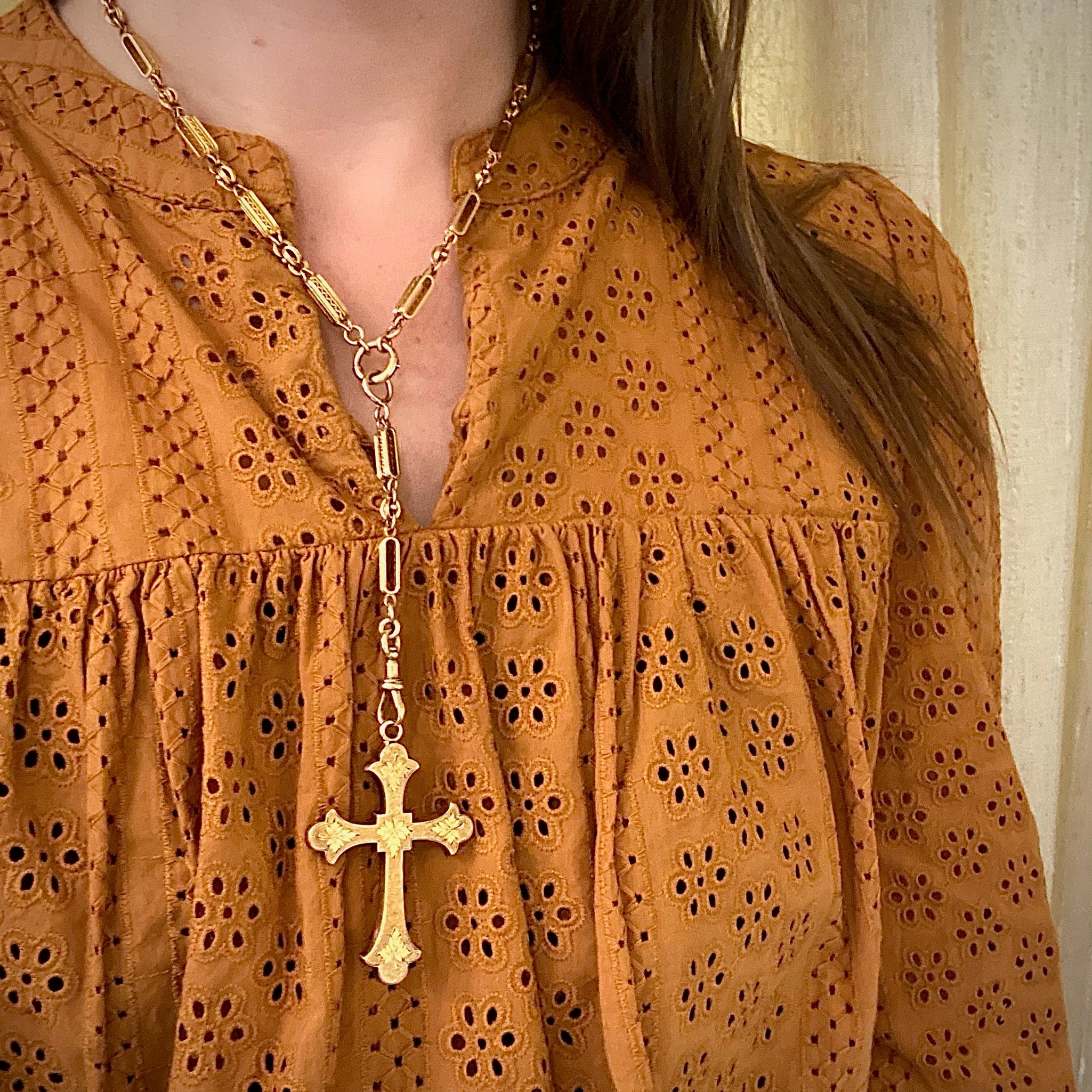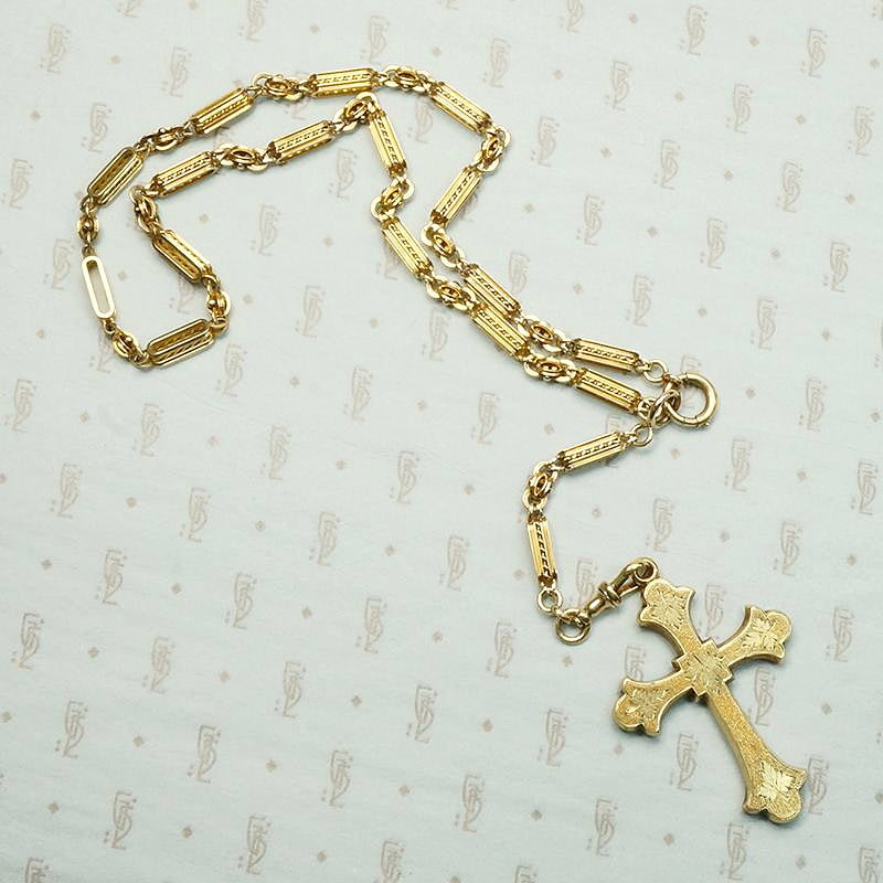 This cross is pictured here with an antique gold chain. The chain compliments the cross beautifully. The chain is available and sold separately.