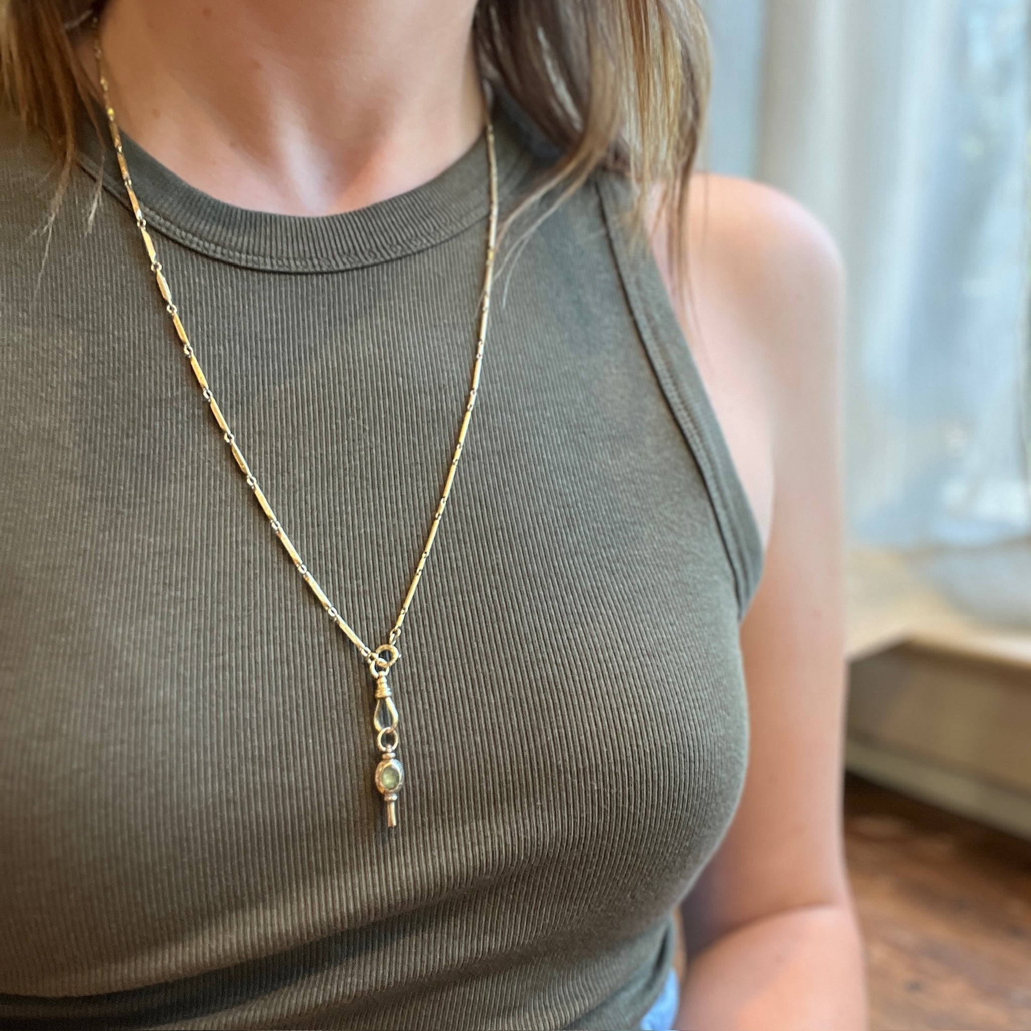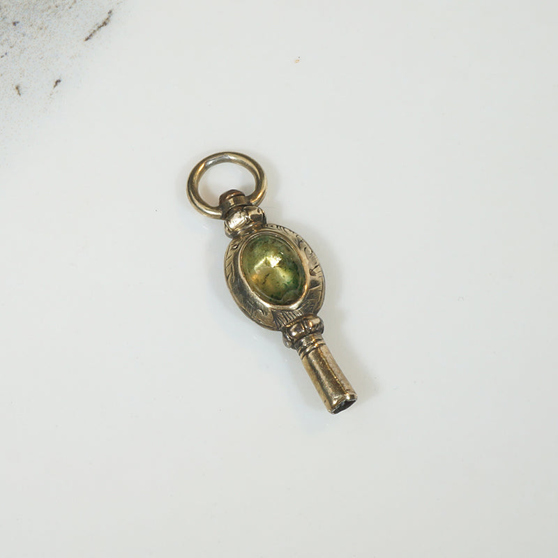This enchanting little watch key dates to the turn of the 19th Century. The gold-sheeted key is set with discs of bloodstone on one side and moss agate on the other. Gold is too soft for use in a winding tool; the winders were made of steel and then covered in a sheet of gold. The drum-style surround is engraved with a floral border and capped with a swiveling bale. A perfect pendant for our Ancient Influences married chains. Circa 1800.
