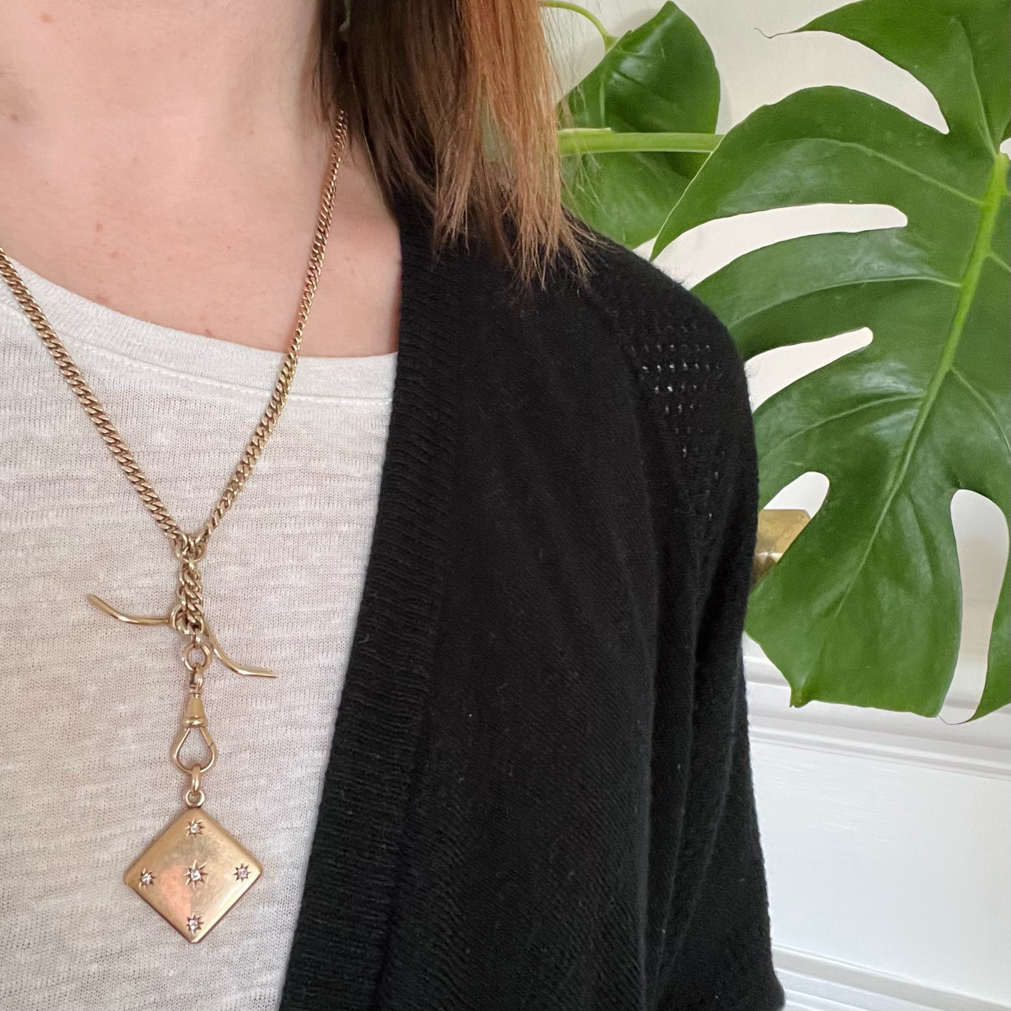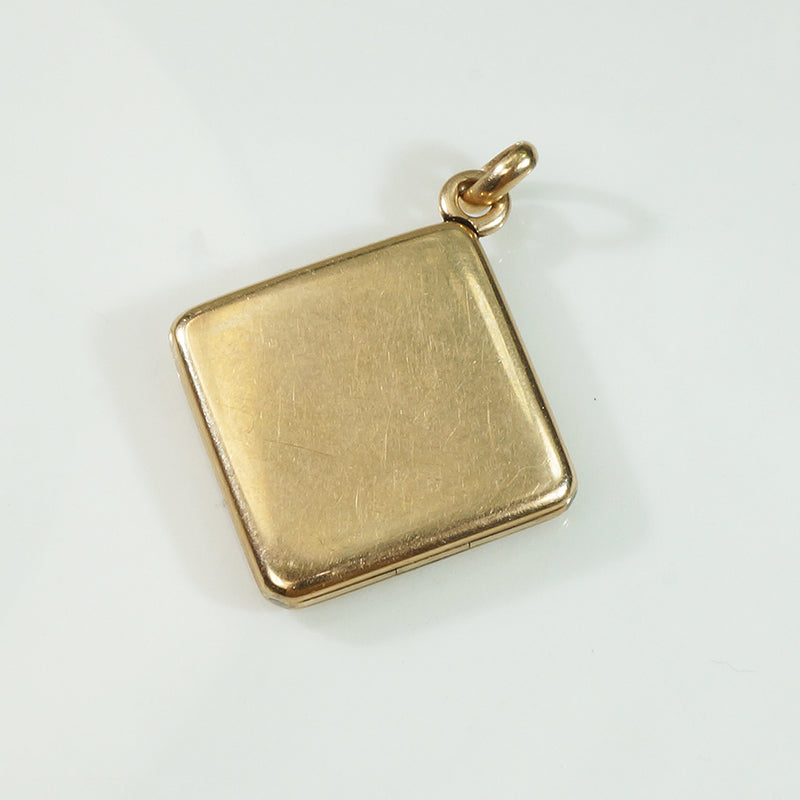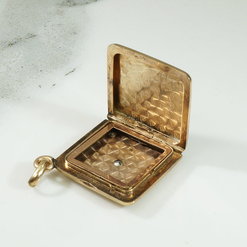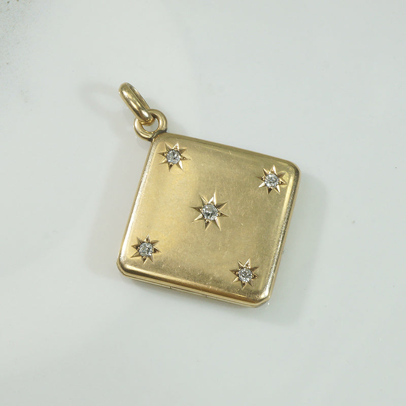 Five Old Mine Cut Diamonds are star set on the front of this lovely 14k mellow gold locket. The shape, a square hung on point, is a wonderful way to wear a locket. The inside of the locket has an engine turned design and is marked 14k. What a treasure this locket is Circa 1900.