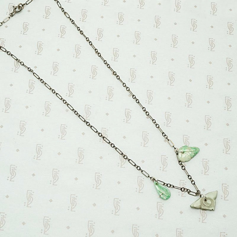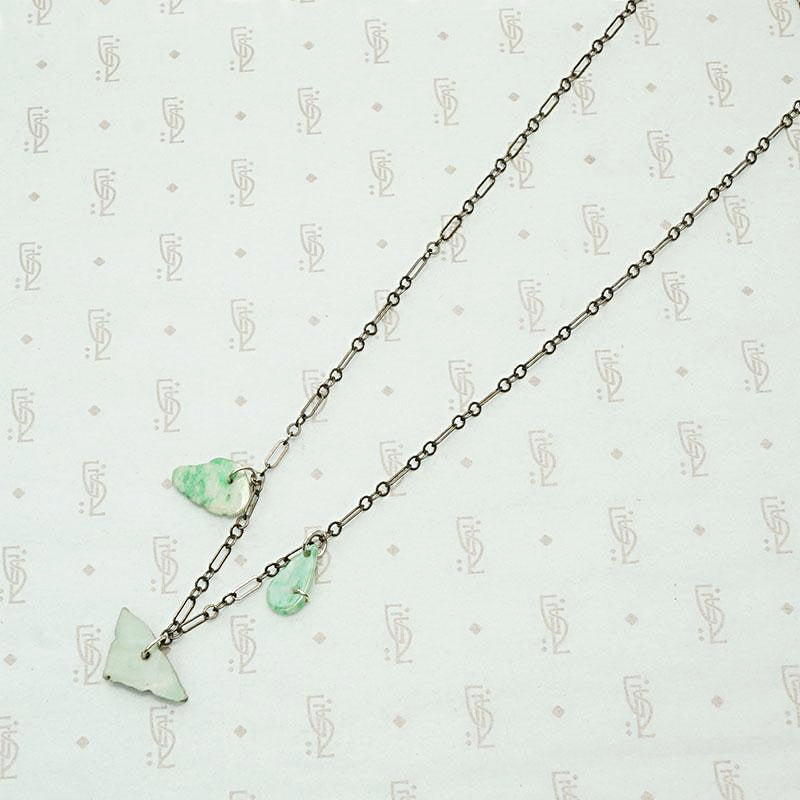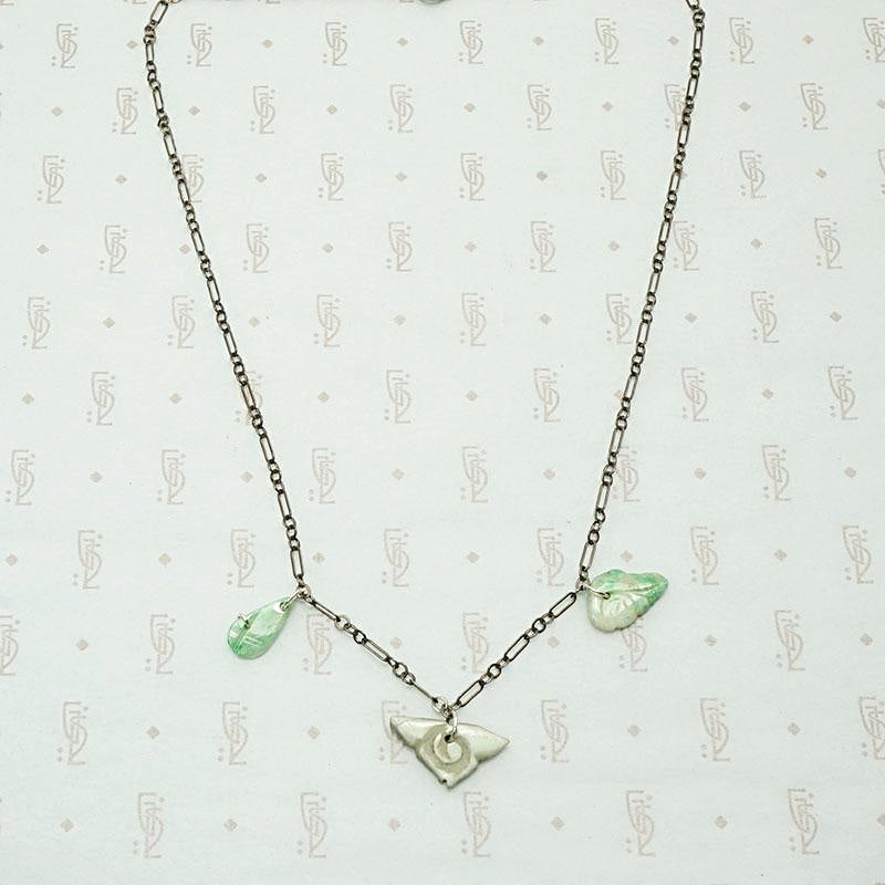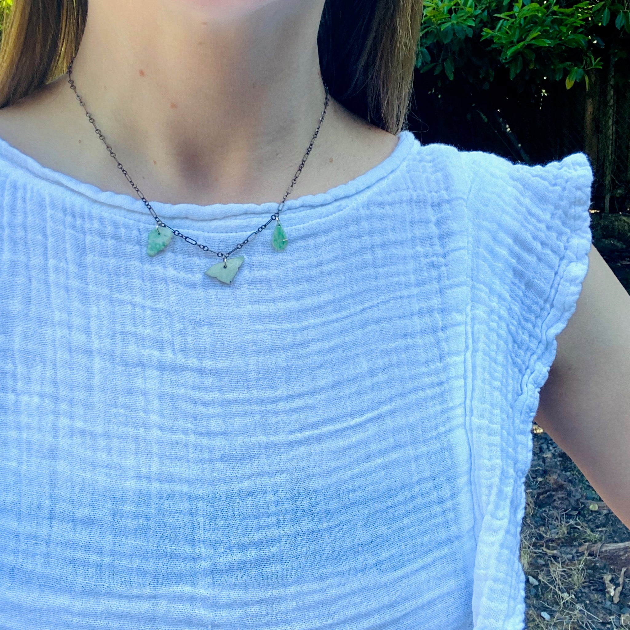 Three pieces of antique jade hang from a sterling silver figaro chain. The hand carved jade bits contrast attractively with the oxidized patina of the chain. This necklace is tactile and has a lovely movement.