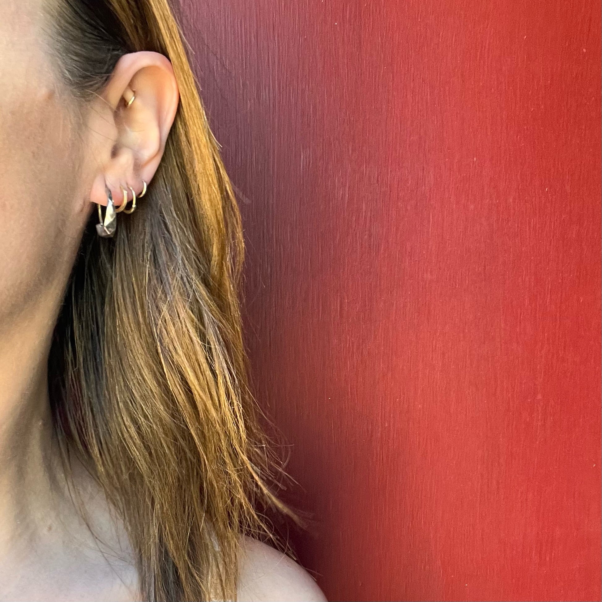 Sweet little Edwardian gold filled hoops. These antique hoops are a slim crescent of patina'd gold filled metal. The hoops are lightweight and comfortable to wear, with hinged tops. Rare to find little hoops from this era, and these are classic. Circa 1900.