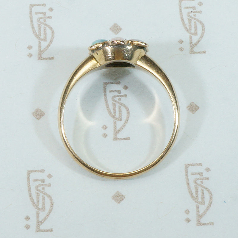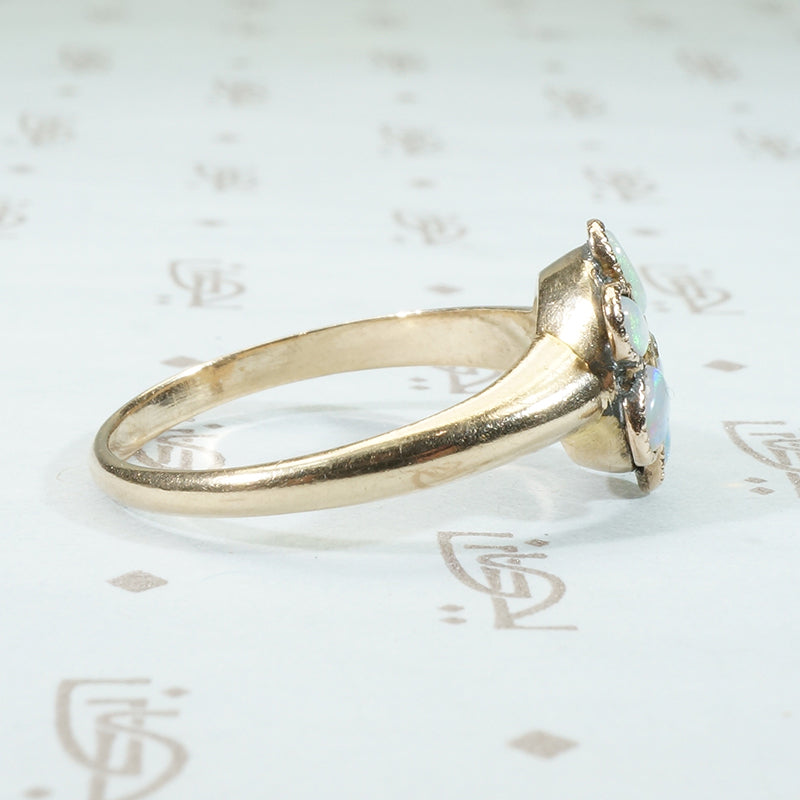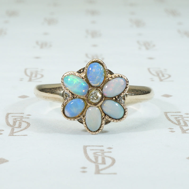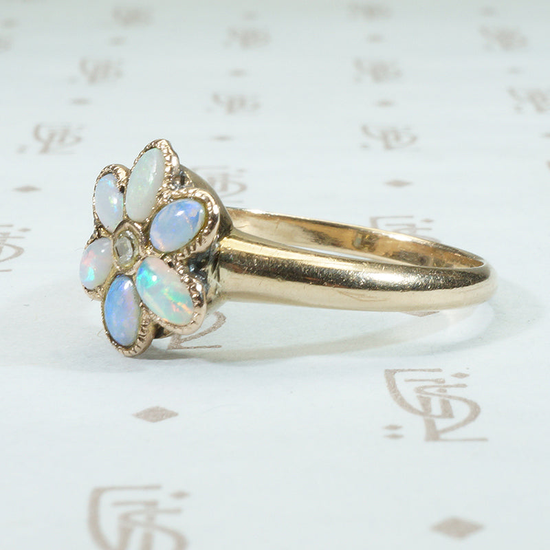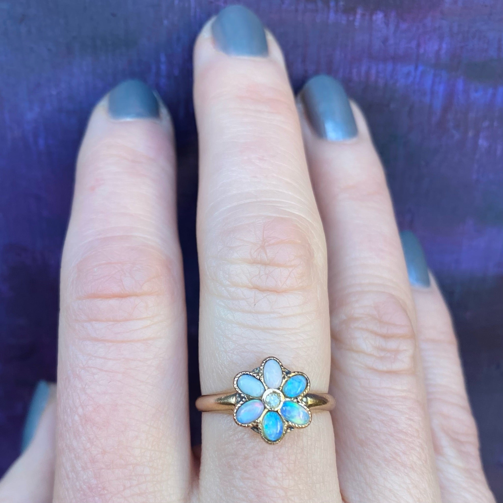 This unique natural opal and diamond flower ring is so pretty. The petals represented by oval opals and the center a small antique diamond. The gold has a slightly rosey cast and is 10. This pretty ring should be treated carefully and is not meant for constant wear.