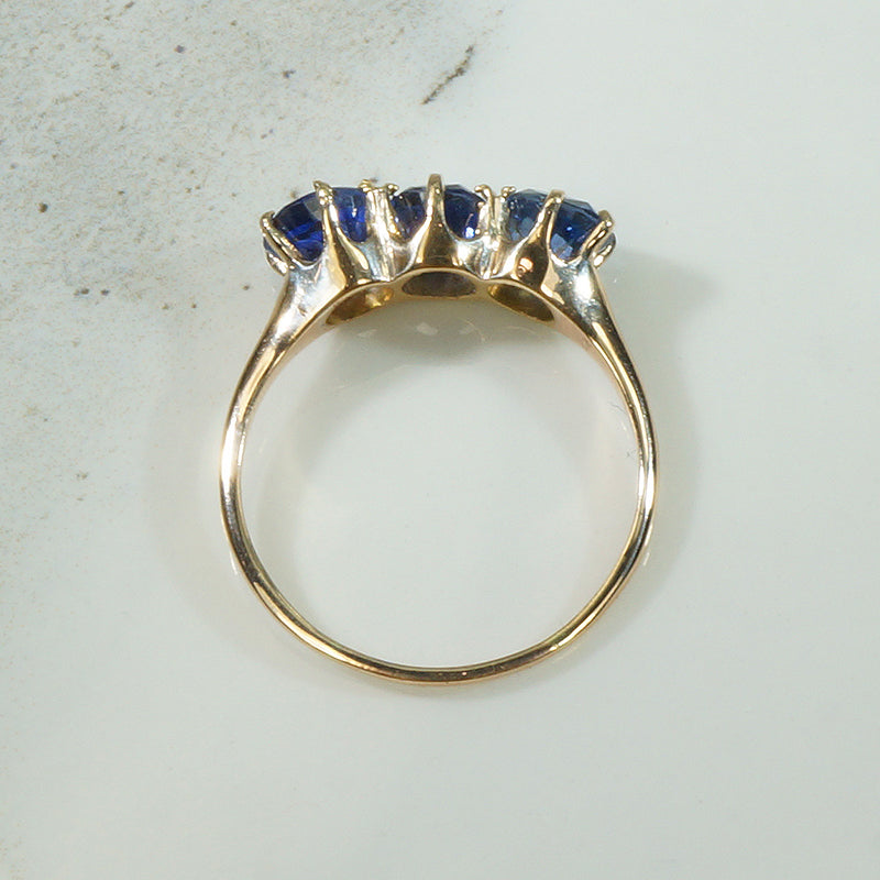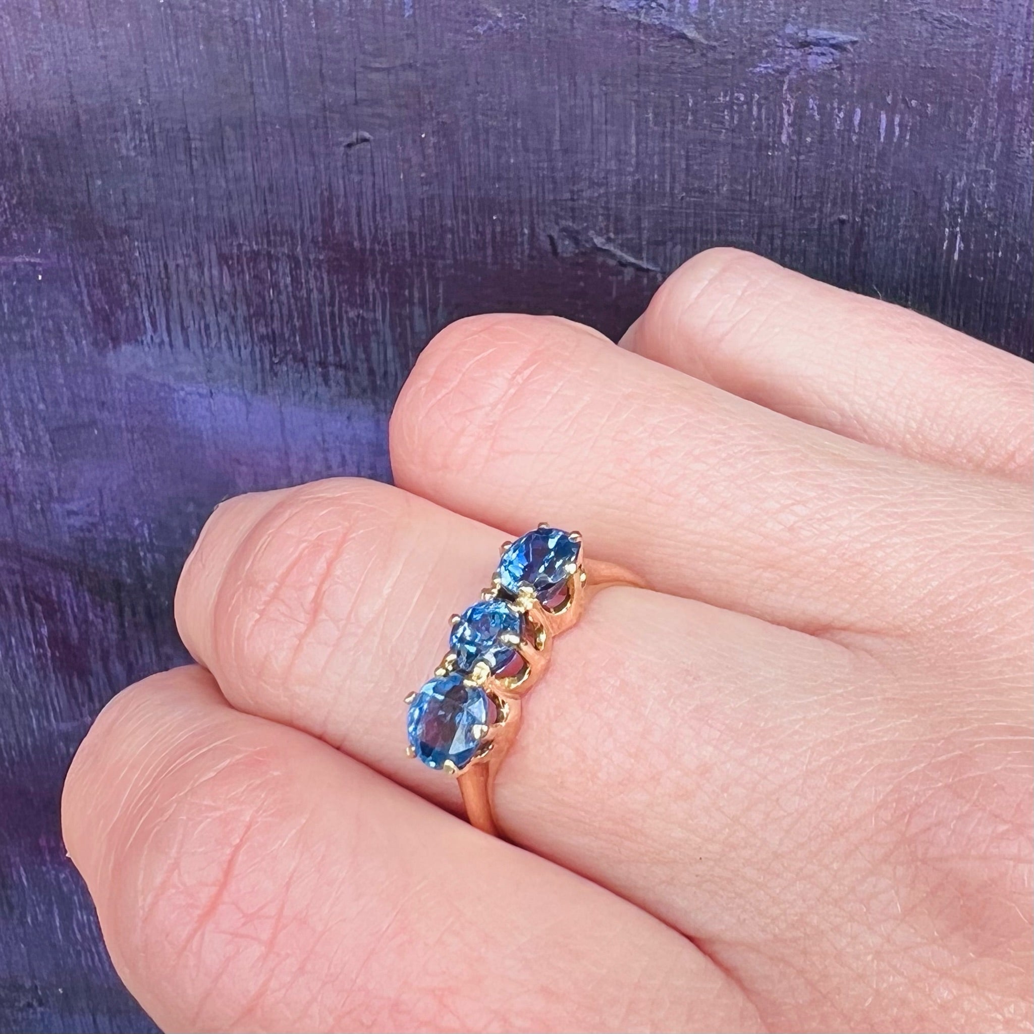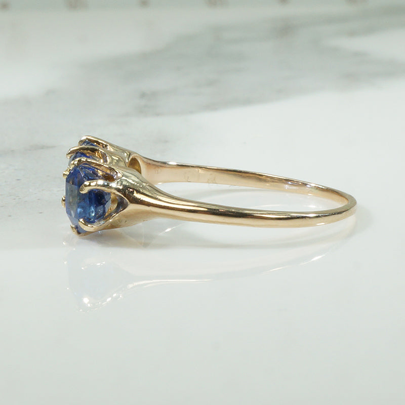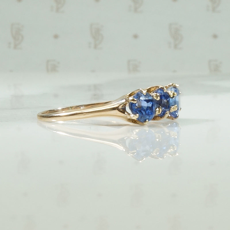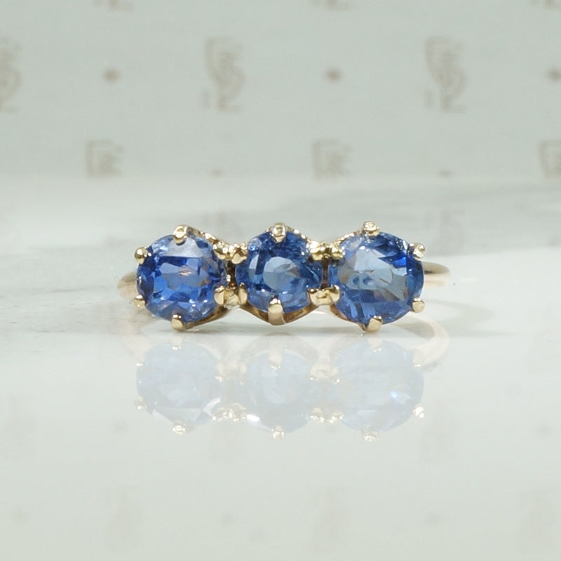A trio of early 19th-century denim blue sapphires is claw set in a 12k gold ring. The antique sapphires have square tables and that wonderful hand-cut charm. The natural 200 year old sapphires have a combined weight of 2.45 carats. Every time I look at this ring I smile, the gems are so lovely. What a unique one of a kind engagement ring this will make!