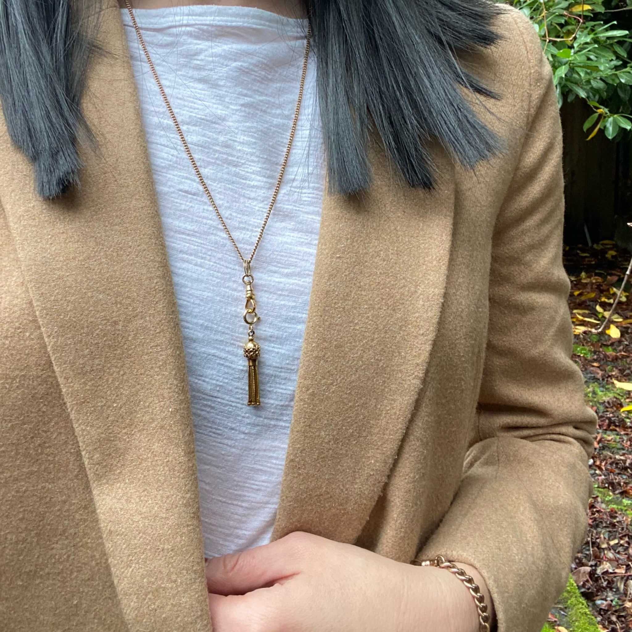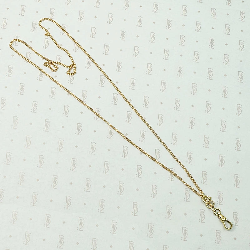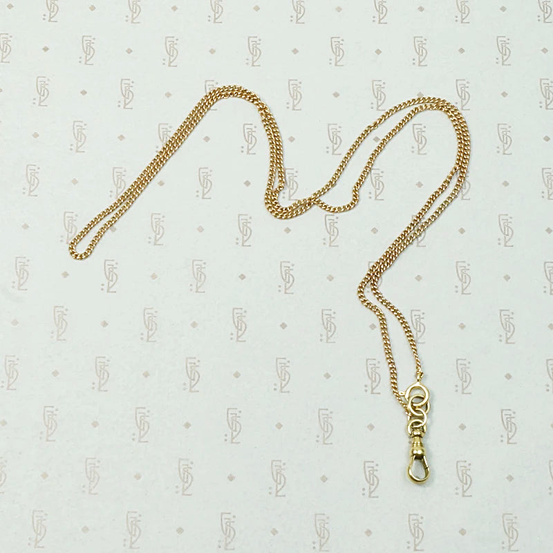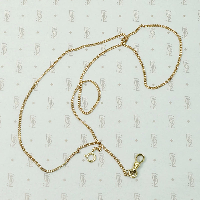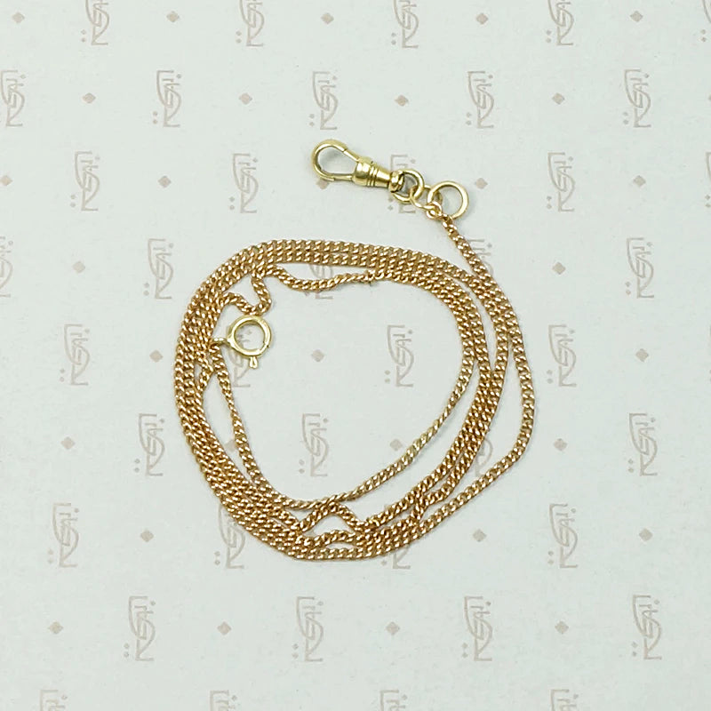Antique yellow and rose gold components give this married chain its subtle beauty. Victorian 9k rose gold flattened mini-curb chain is accented Edwardian 14k yellow gold findings. The chain clasps at the front with a spring ring and is finished with a watch hook on a split ring. The combination of yellow and rose gold is warm and lovely. The watch hook is perfect for displaying all of your favorite pendants, lockets and talismans. Raise your Chain Game.