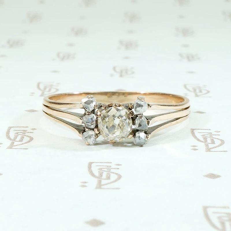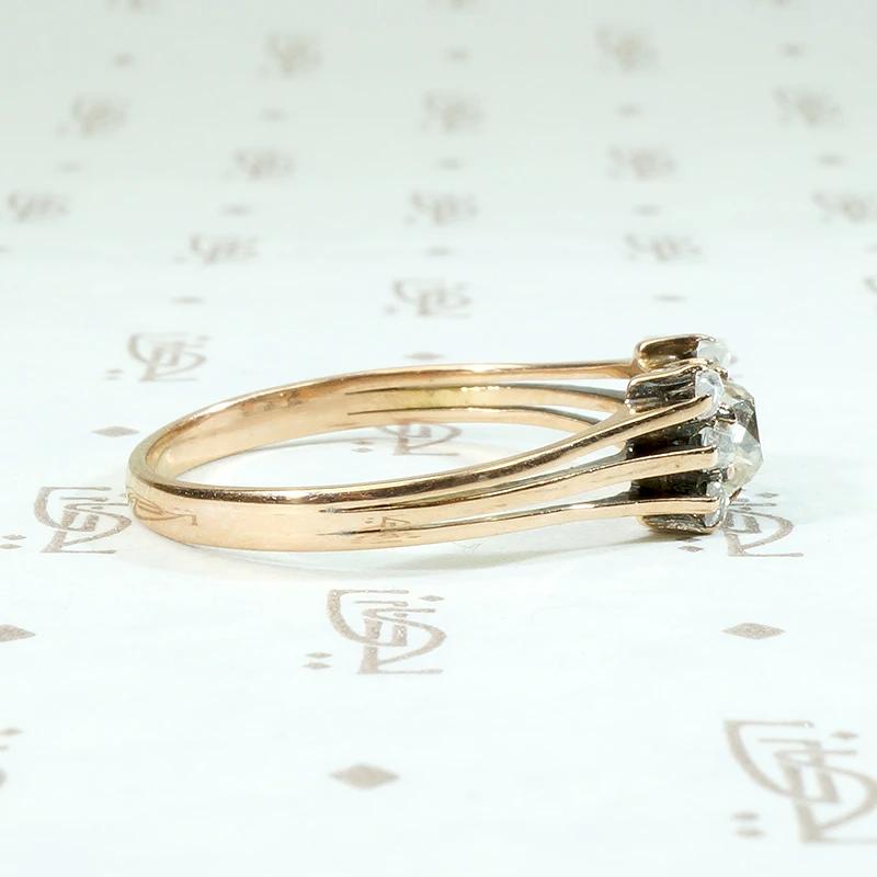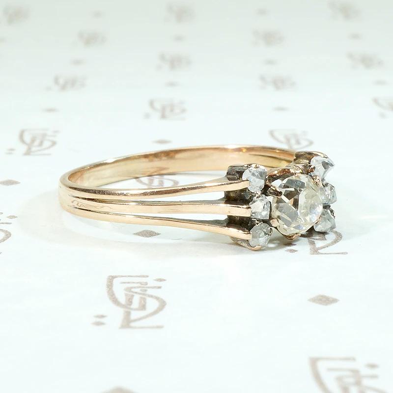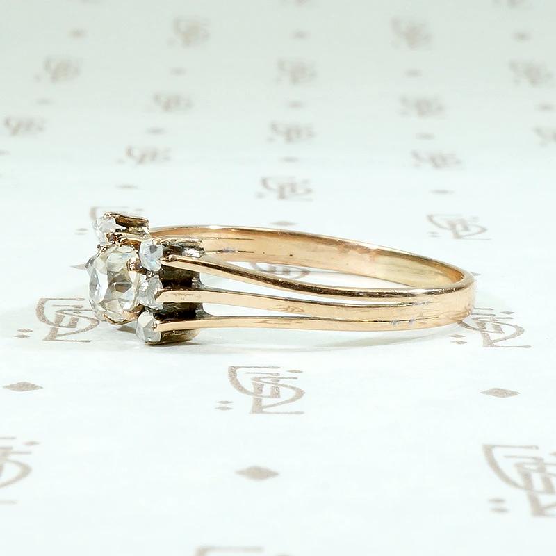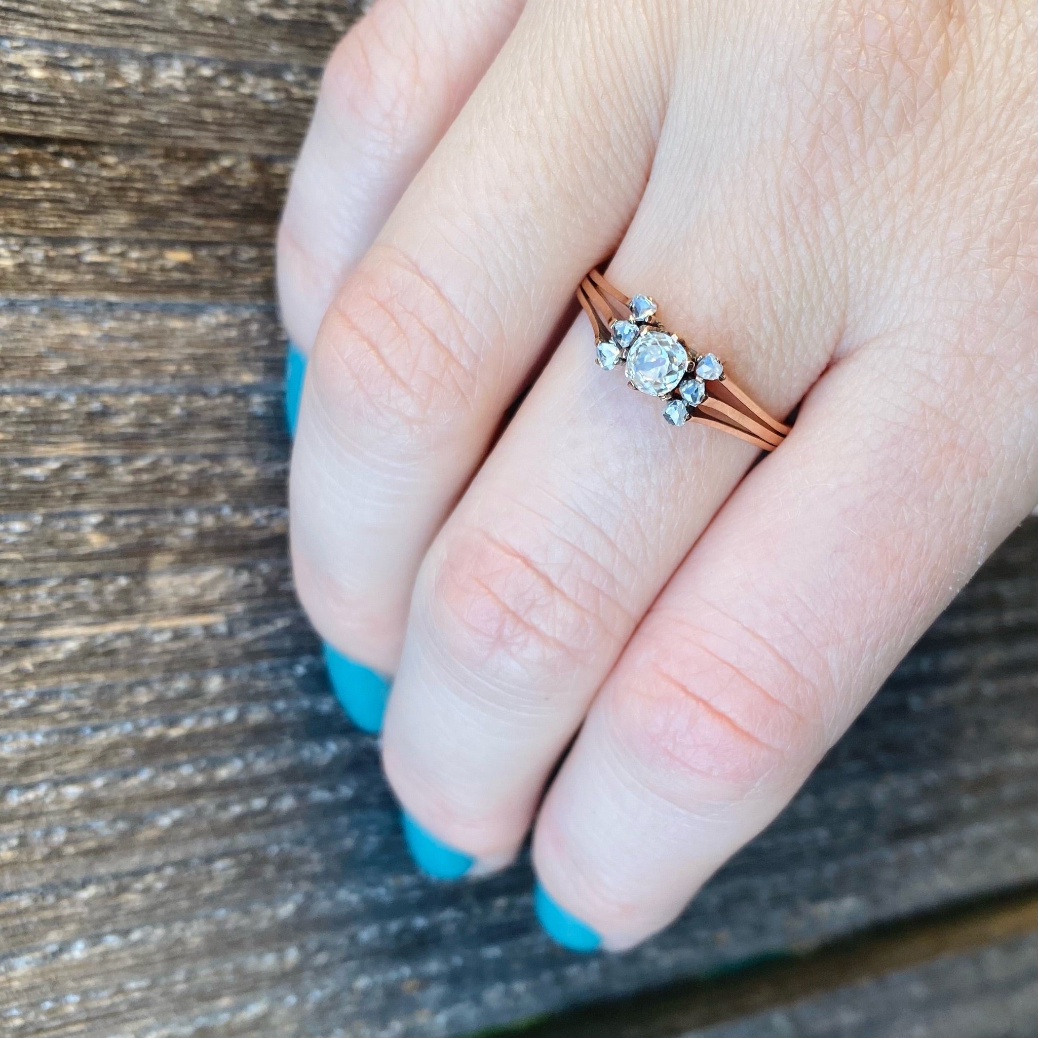 This Victorian 15k rosy gold ring is set with the most charming of antique diamonds. The center stone is a 0.45ct old mine cut diamond; a pale yellow color, chunky crown and slightly wonky culet give it its wonderful, funky character. The OMC is flanked on each side by three little rose cut diamonds. The 0.30tcw rose cuts are much whiter than the OMC, the contrast in color between the stones is fascinating. The diamonds sit above triple split shoulders that taper gracefully back into a narrow band. This unique antique diamond ring would make a really delightful engagement or commitment ring. Circa 1850-60.