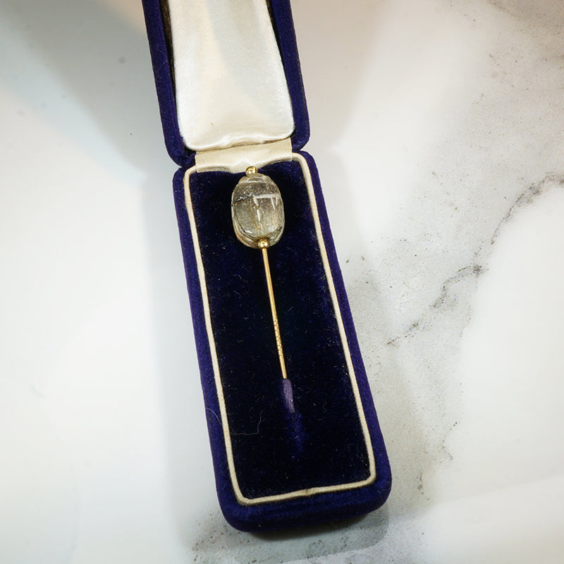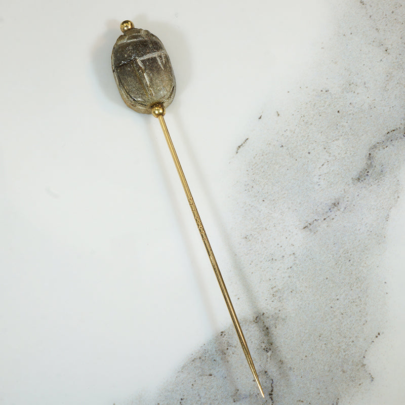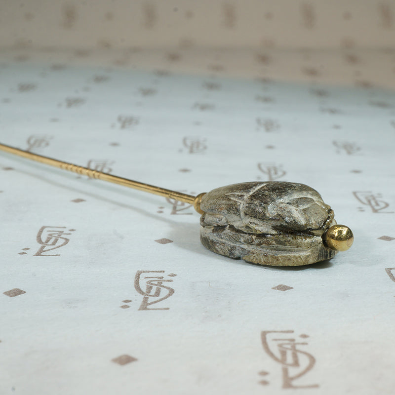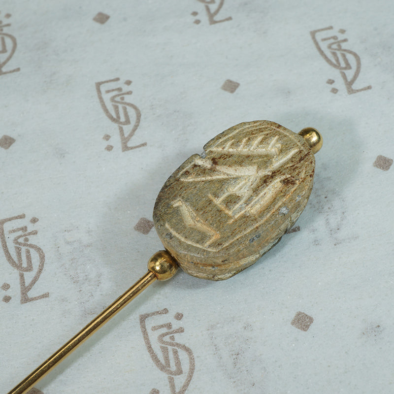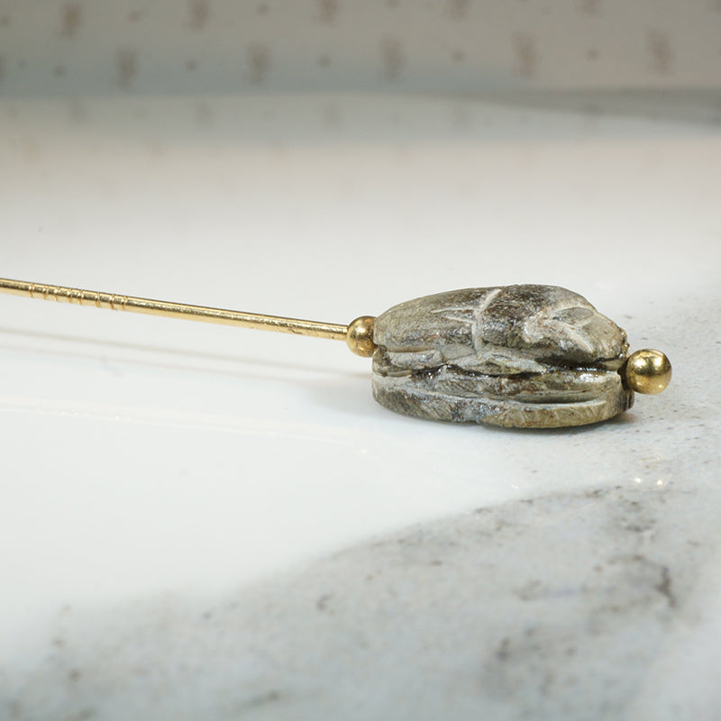A greyish steatite stone scarab is bead set on the stick pin. The Scarab has a group of hieroglyphs on the reverse, including the Falcon God Horus. The pin dates to the mid-20thc.