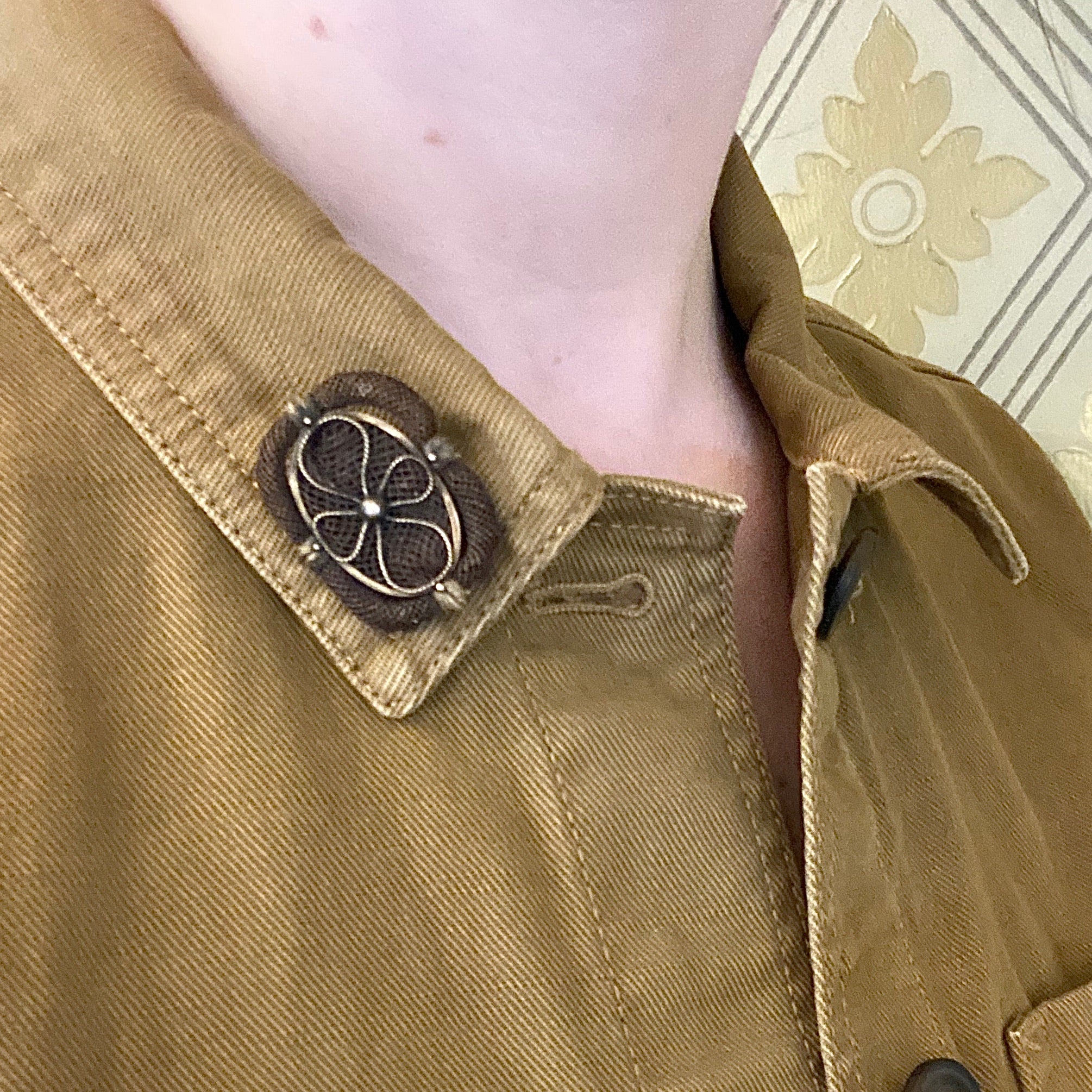 A lovely little antique pin made of woven human hair. The hair has been woven into mesh tubes and panels and finished with gold appointments. Very sweet, with the design of leaves and a daisy worked in. This pin is delicate and light weight. It secures with the C-clasp pin common to the era. Circa 1850.