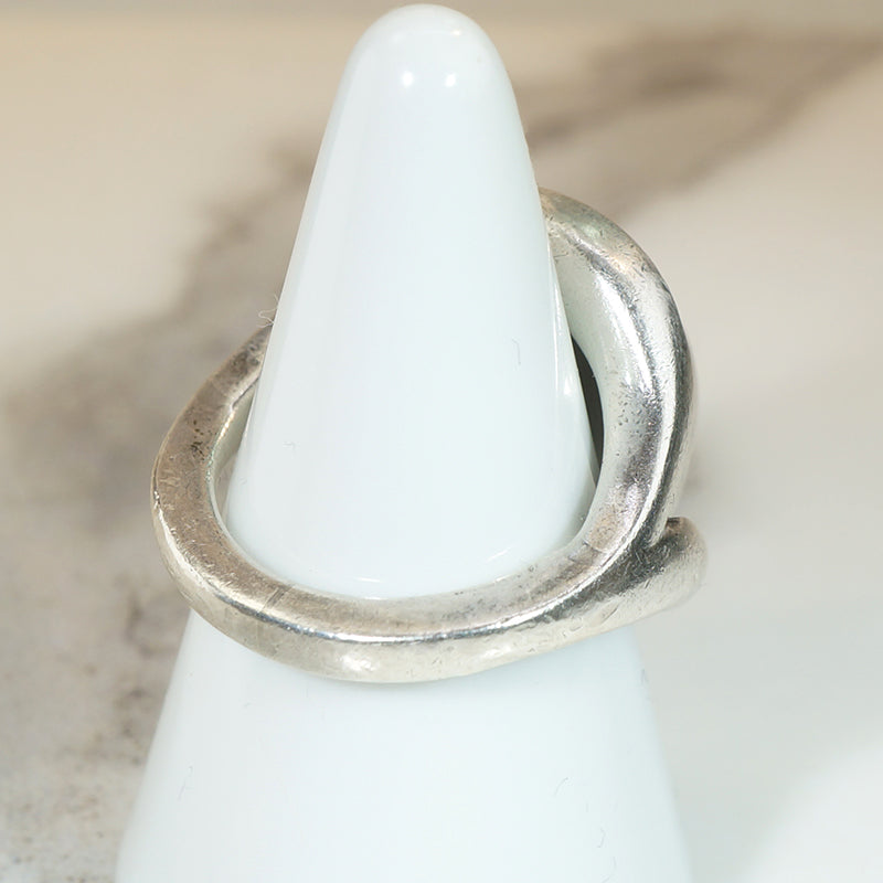 Antonio Pineda's work feels extremely modern; it's difficult to believe he was producing 80-something years ago in the mid-20th century. This gorgeous moonstone and 970-grade silver statement ring exemplifies his skill and vision. The mystical blue cabochon moonstone sits in a sleek bezel floating between two glossy, high-grade silver bands. The bands taper into split shoulders and the flat-edged half-round band. The dreamy moonstone captures the light, drawing the eye deeper and deeper into the stone's opalescent center. The underside of the ring is marked "Hecho en Mexico Silver 970," it bears the maker's mark Pineda began using in 1953 and Mexico's Eagle 1 mark. Circa 1950.