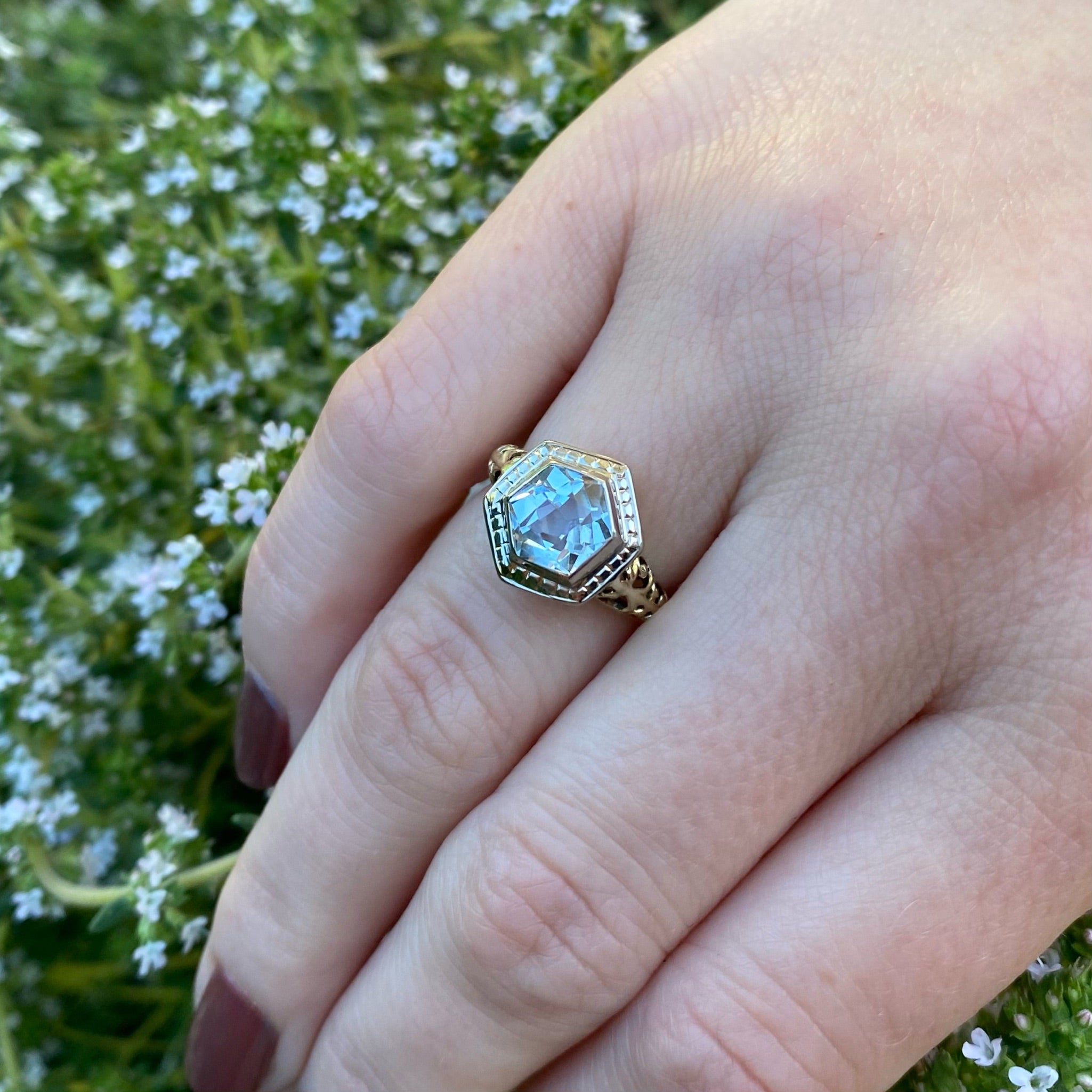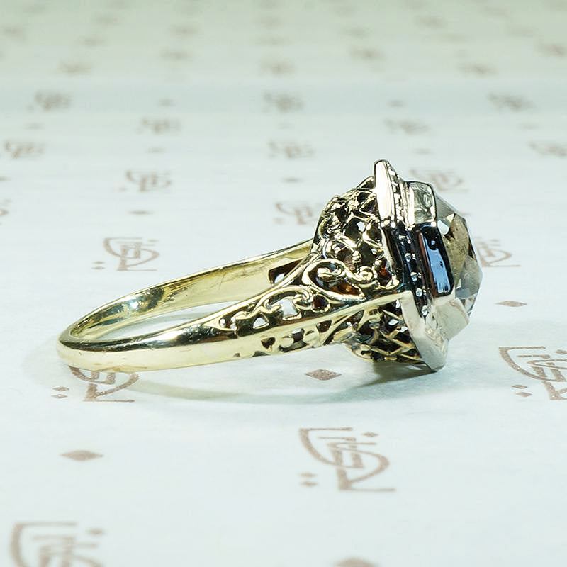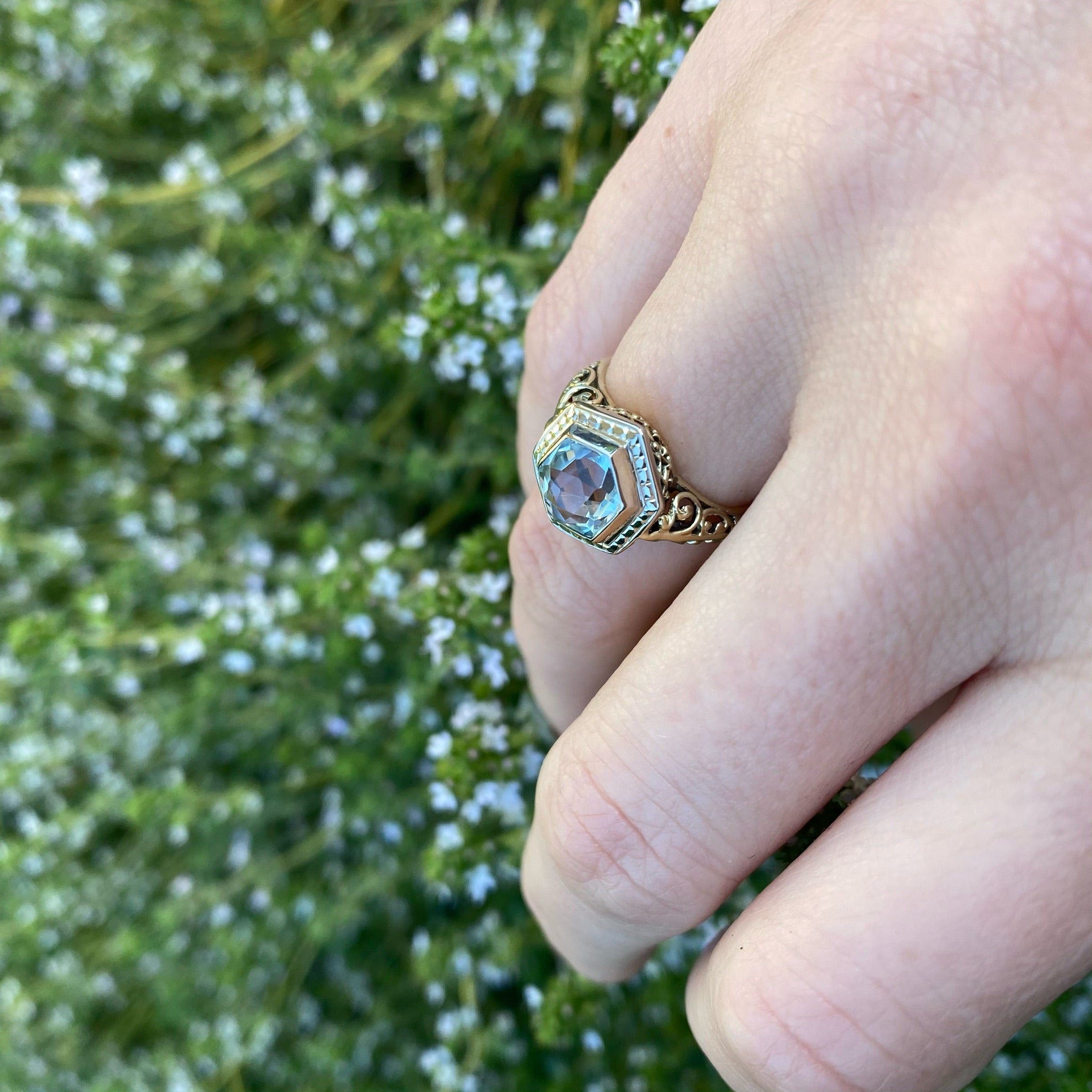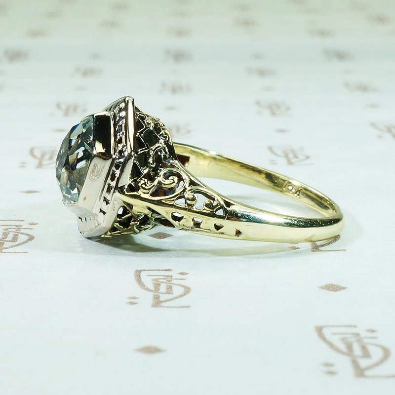 A limpid aquamarine shines in this classically Art Deco solitaire gemstone ring. The pale blue aquamarine is bezel set in a hexagon head of engraved white gold. The body of the ring is 14k yellow gold filigree, with lattice work and curling scrolls. The gallery of the ring stands proud and the shoulders taper significantly to a slim band. This ring would make a delightful alternative engagement ring or March birthstone ring. Circa 1920.