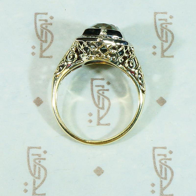 Details.....The ring is currently a size 5.25. We will size it up or down two sizes, free of charge. Please contact us if you need this ring sized more than two sizes, it may be possible for a small fee. The top of the ring measures 11.2mm by 12.4mm, the band tapers from 5mm to 1mm wide and the profile is 8.2mm tall. In Very Good Vintage Condition. You should always expect some wear on vintage and antique jewels, we consider it part of their charm.