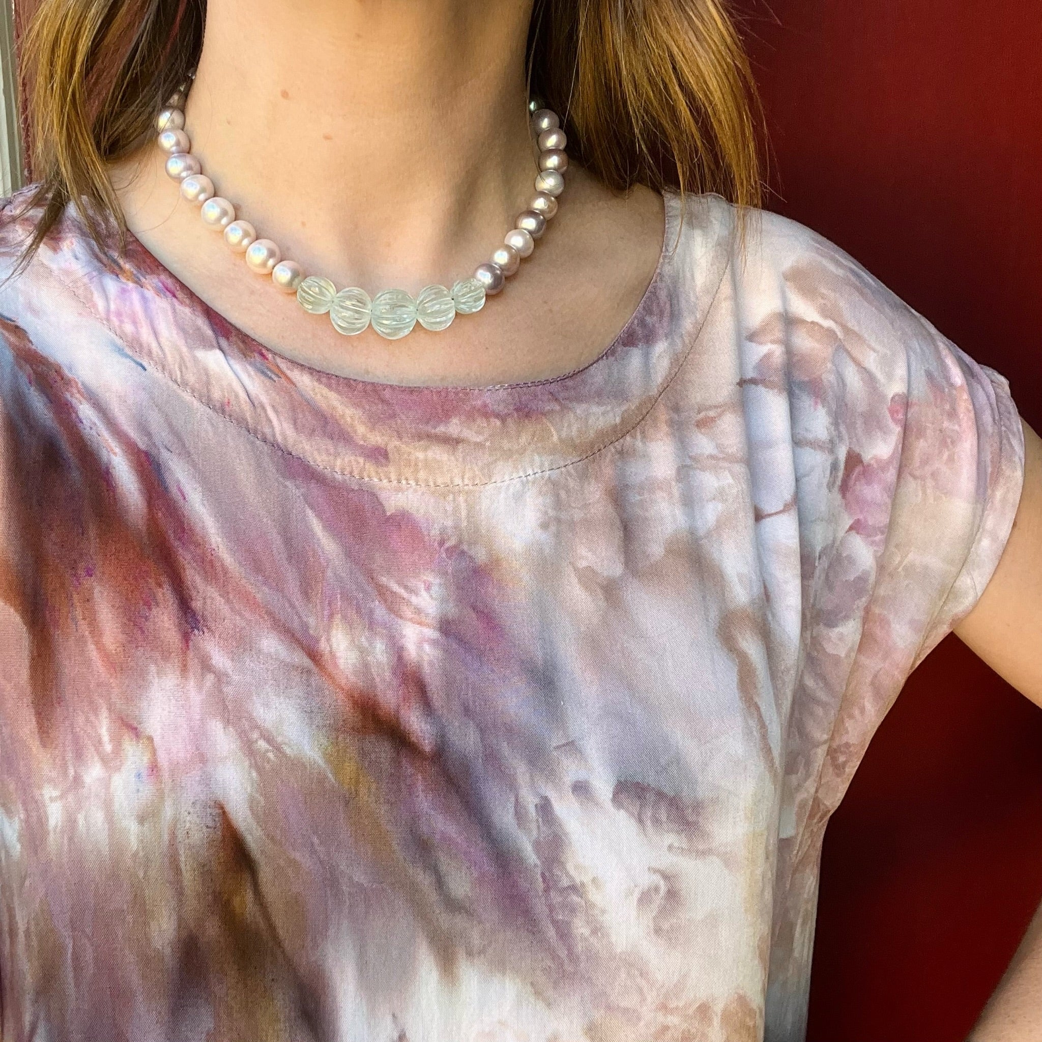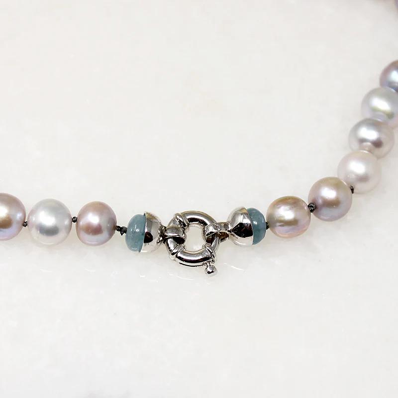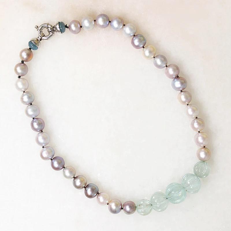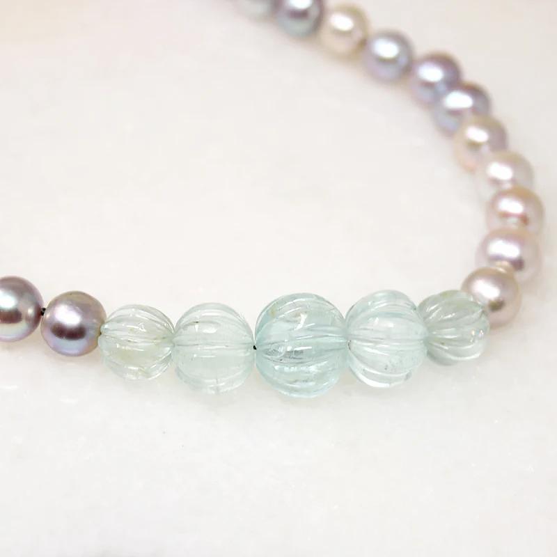 A choker of silvery-gray pearls and aquamarine beads with the soft pastel tones of a misty morning at the beach. Iridescent pearls are hand knotted on blue silk, along with five graduated melon beads carved from ice-blue aquamarine. Marine-blue aquamarine rondel beads finish the piece, capped in white gold and supporting a chunky 14k white gold bolt ring clasp. Bring out your inner mermaid with this dreamy necklace.