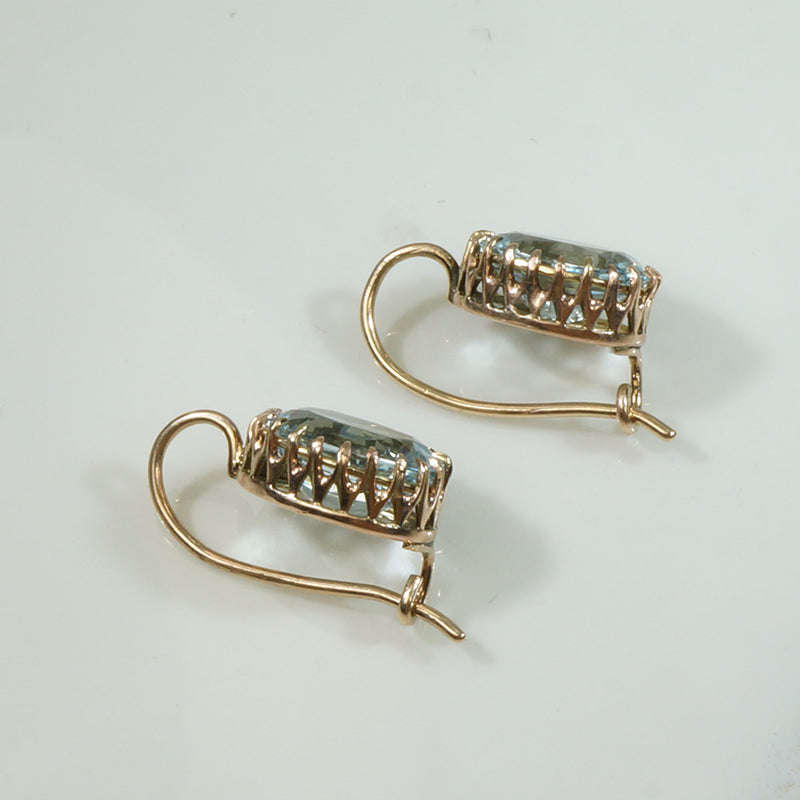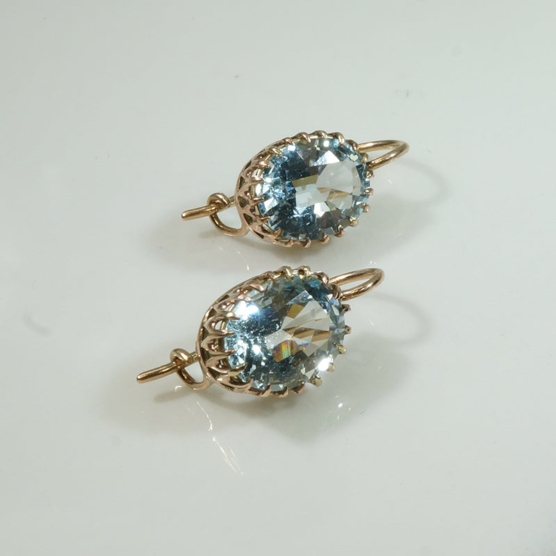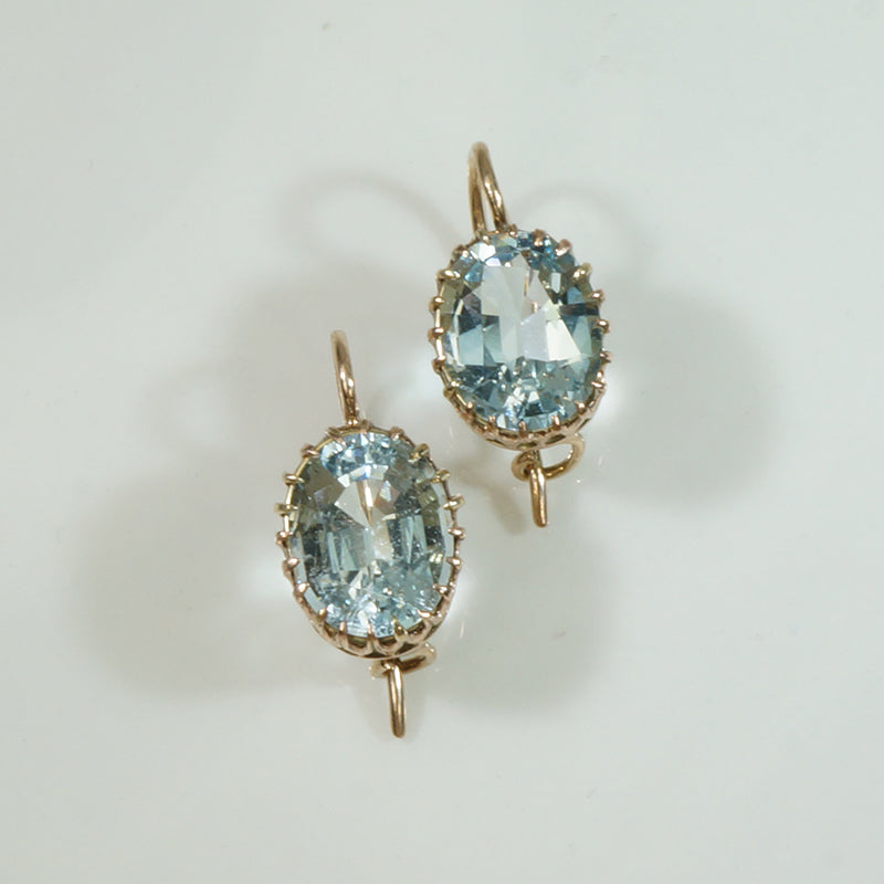 Antique Aquamarine Earrings, the beautiful blue natural oval gems are held in claw settings that allow all the light in and show their sparkle so nicely. The settings are that lovely old gold color, somewhere between yellow and rose, with ear wires that hook into a c-clasp at the base. The natural old aquamarines have a total weight of 4.65 carats and the gold is 14k. Circa 1860.