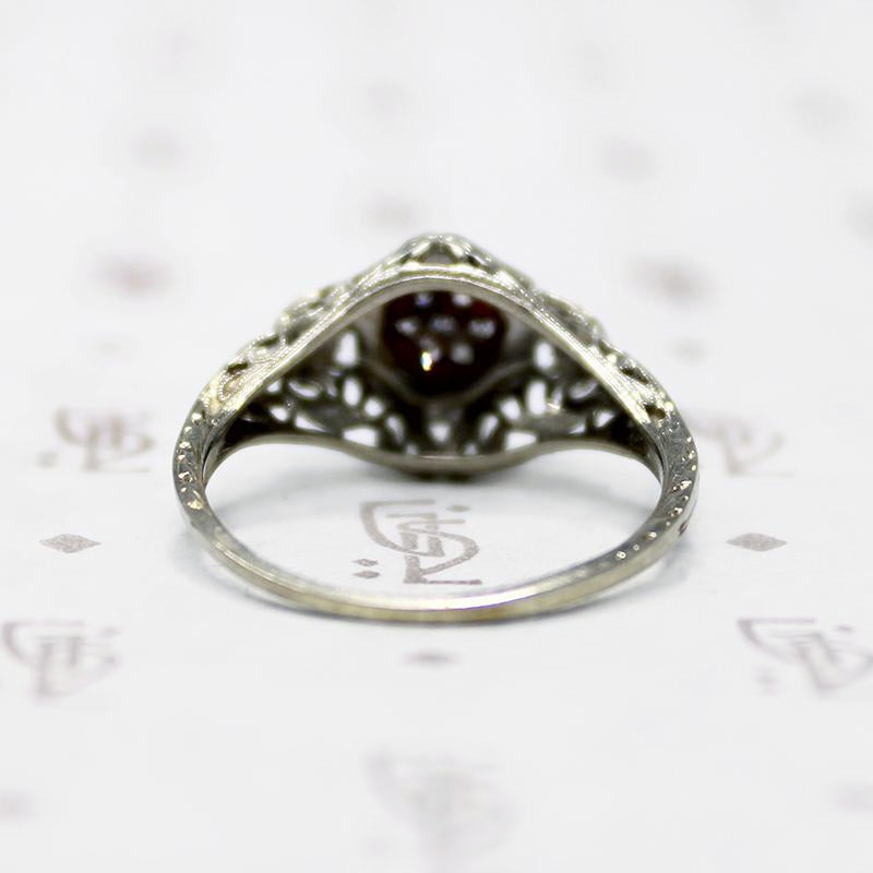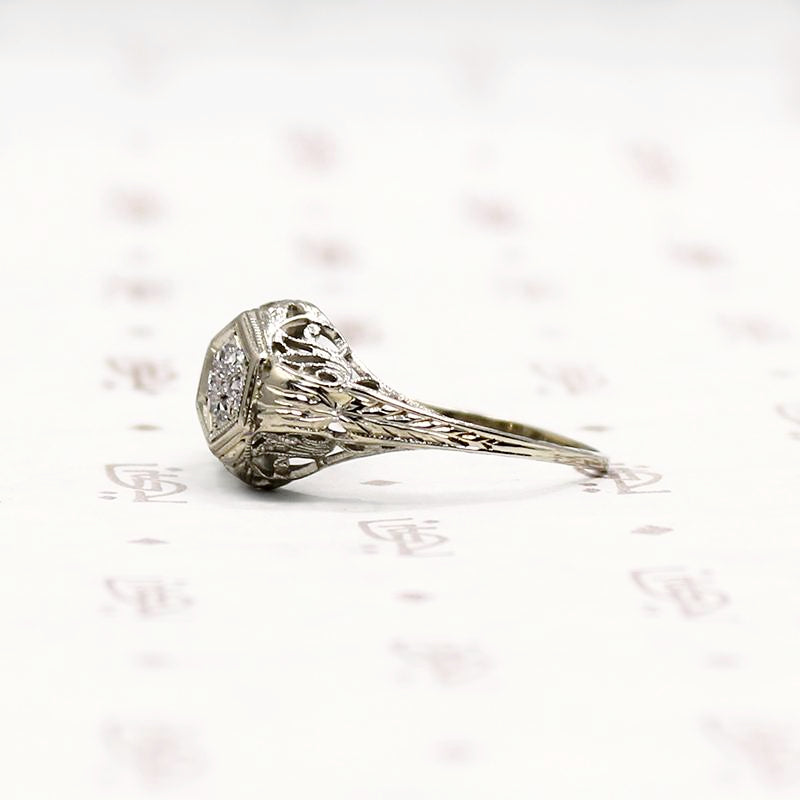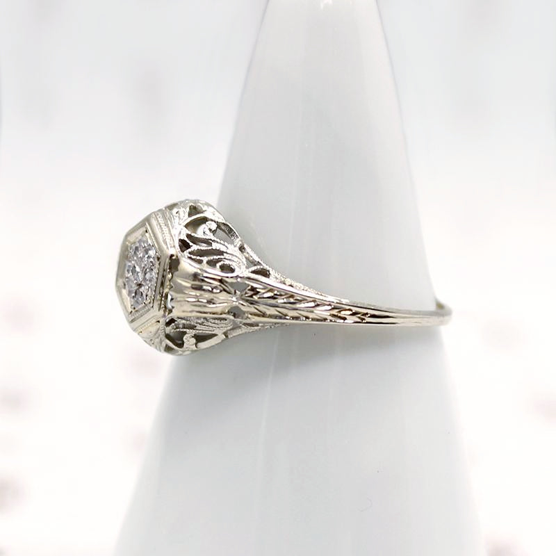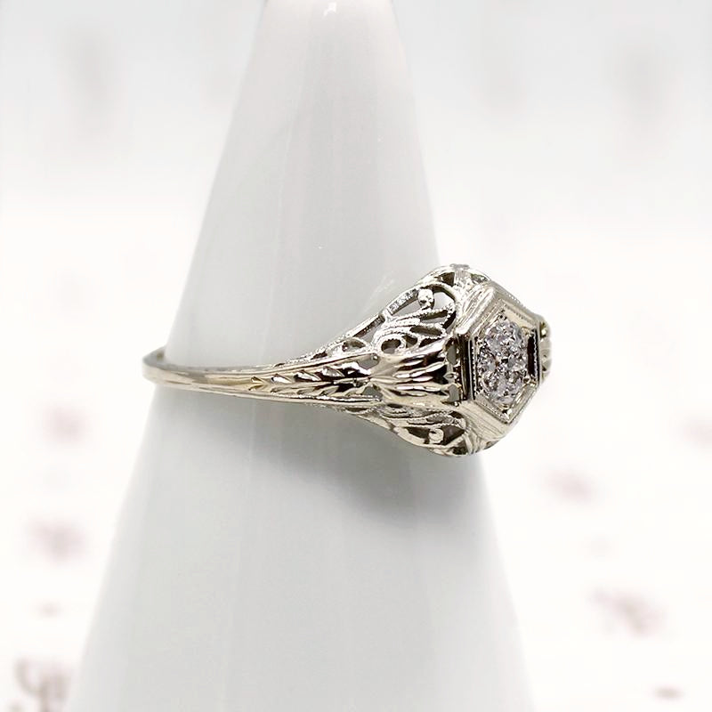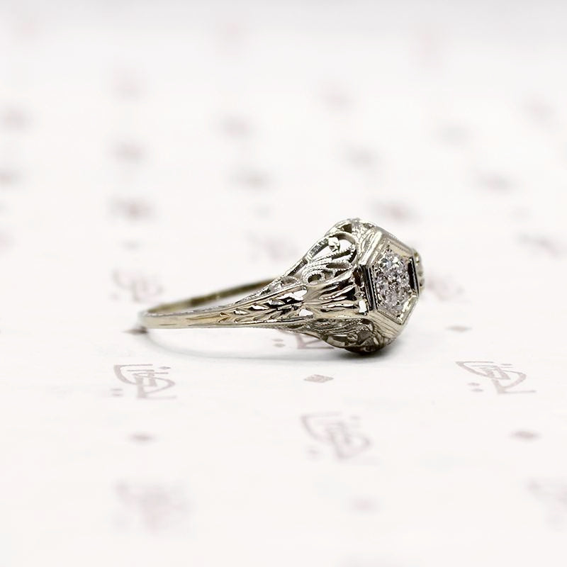 A classic Art Deco ring is set with an unexpected cluster of small, twinkly diamonds. The cluster of diamonds packs a sparkle-punch typically reserved for a larger stone. I just invented the term sparkle-punch and I think it is quite evocative. The diamonds are set in a hexagonal head supported by lacy 18k white gold filigree. This would make a lovely and unusual engagement ring. Circa 1920.