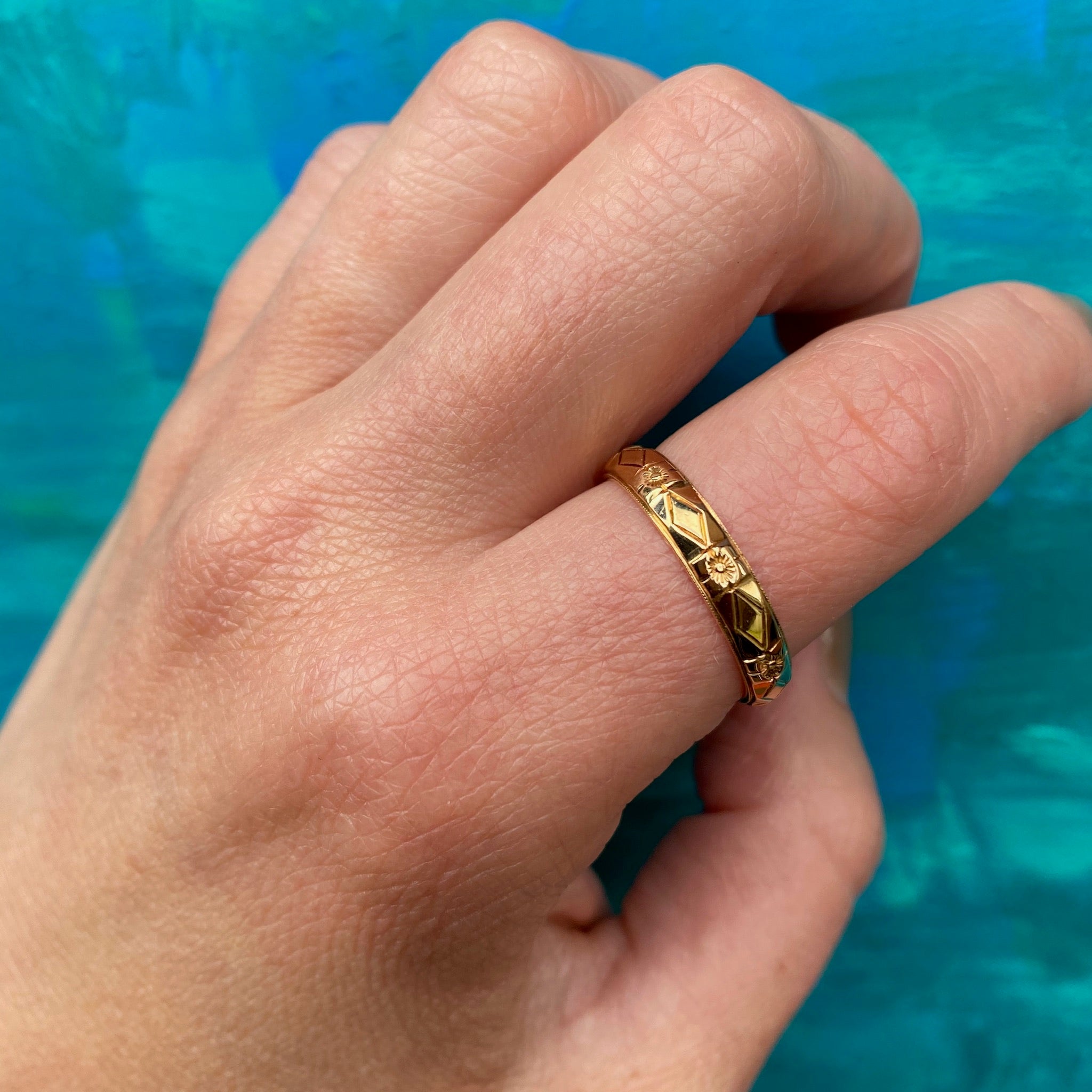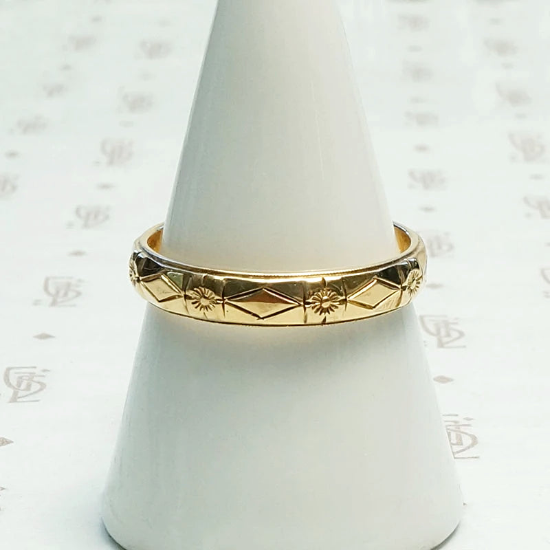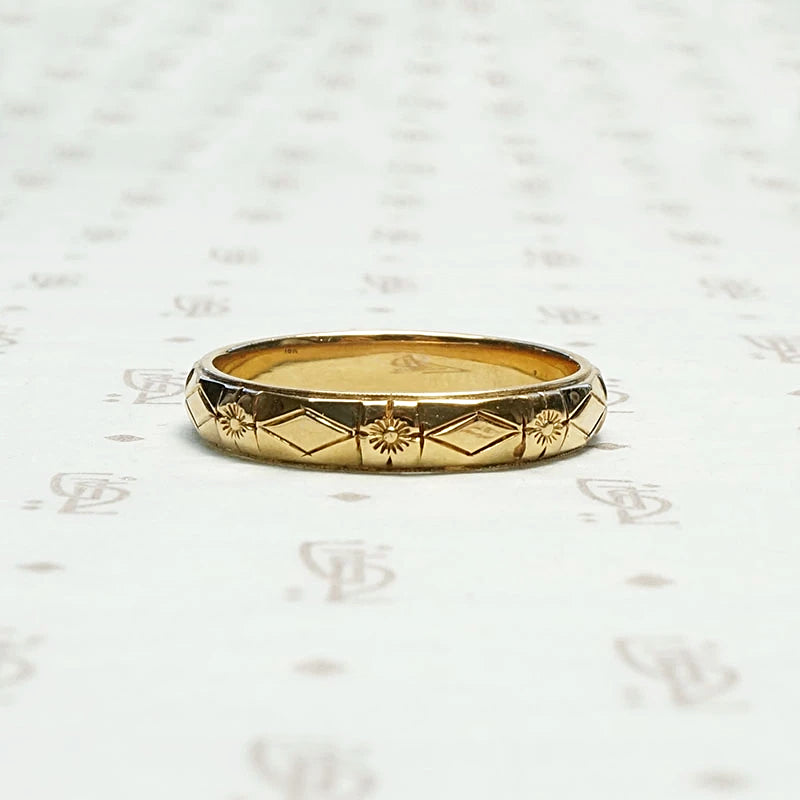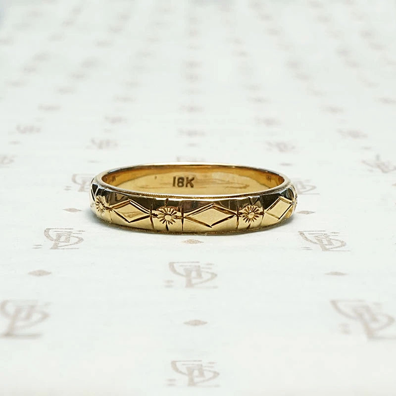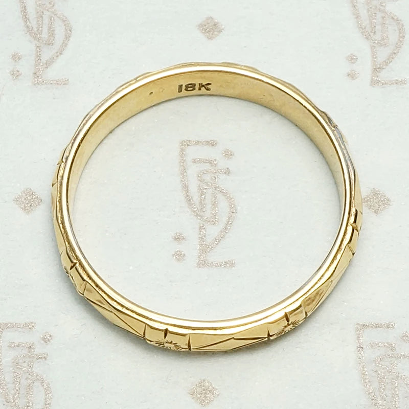 This handsome 18k rosy gold wedding band is girded with a romantic forget me not motif. The mellow old gold band alternates geometric Art Deco details with the flowers. This ring will make a lovely wedding band. It is in a rare larger size. For those of you with generous fingers, this one is for you. Circa 1930.