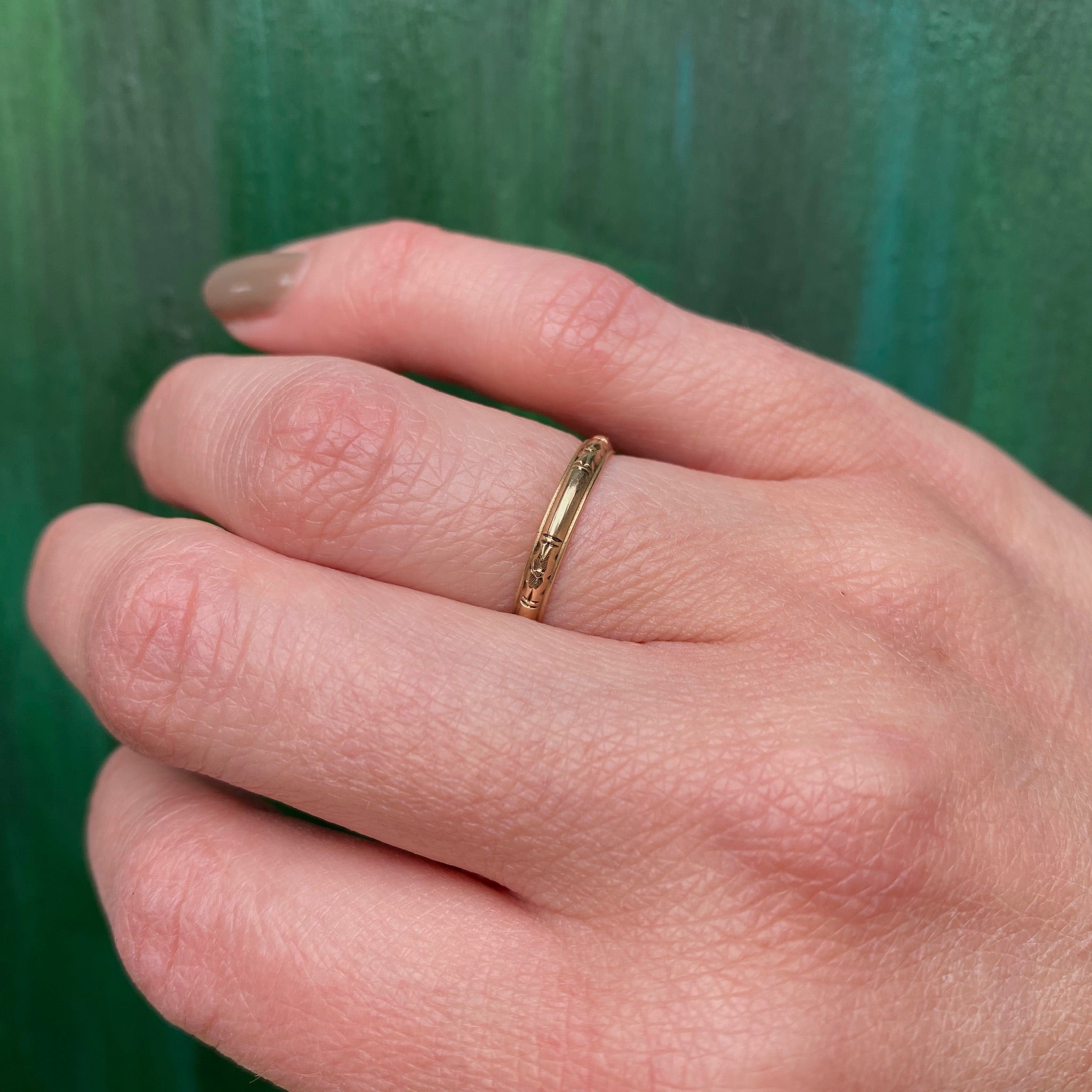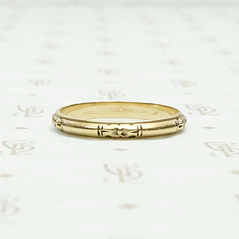This is a very pretty 14k gold wedding band with a forget me not motif. The mellow old yellow gold band has great Art Deco details with carved lines and an elegant edge. This ring will make a lovely wedding band. Circa 1920.