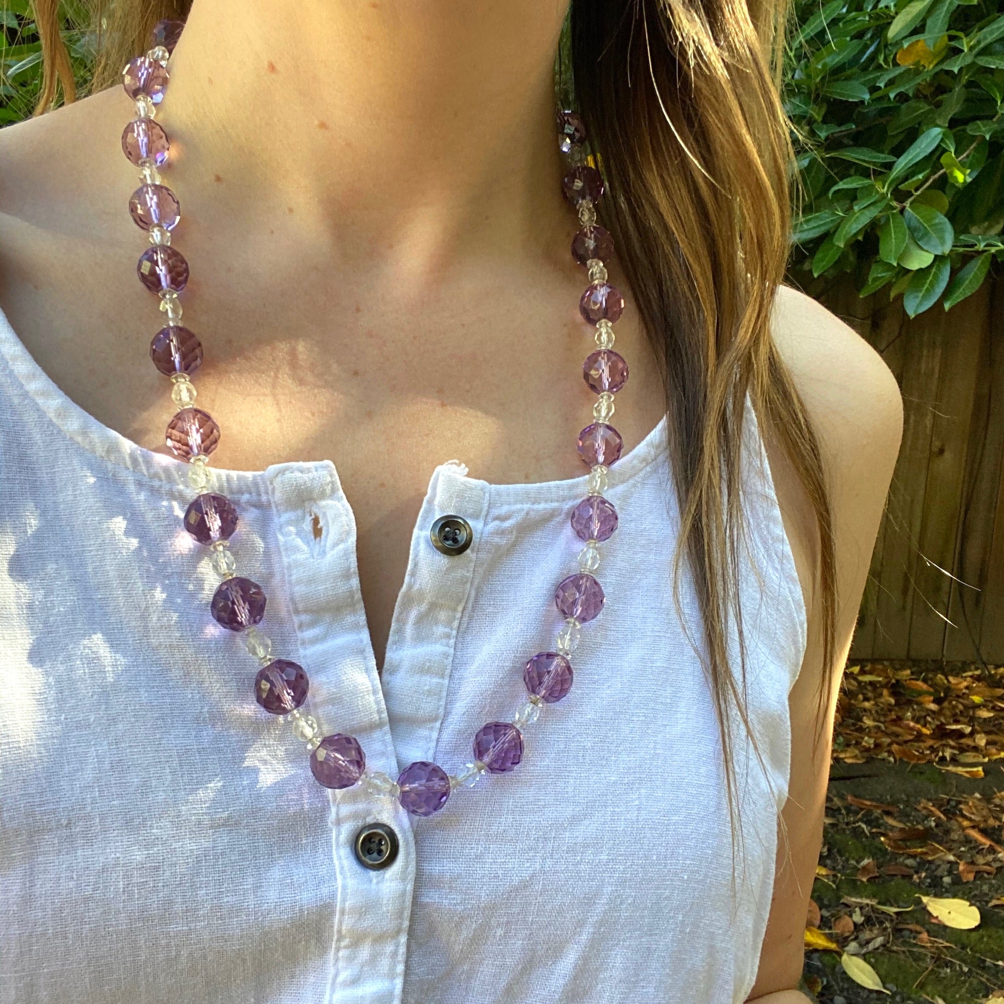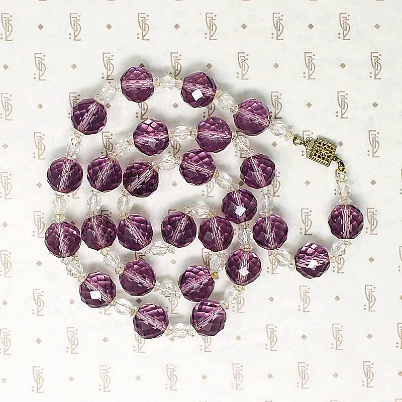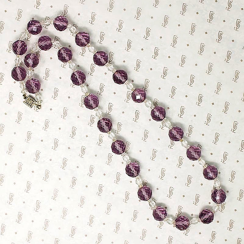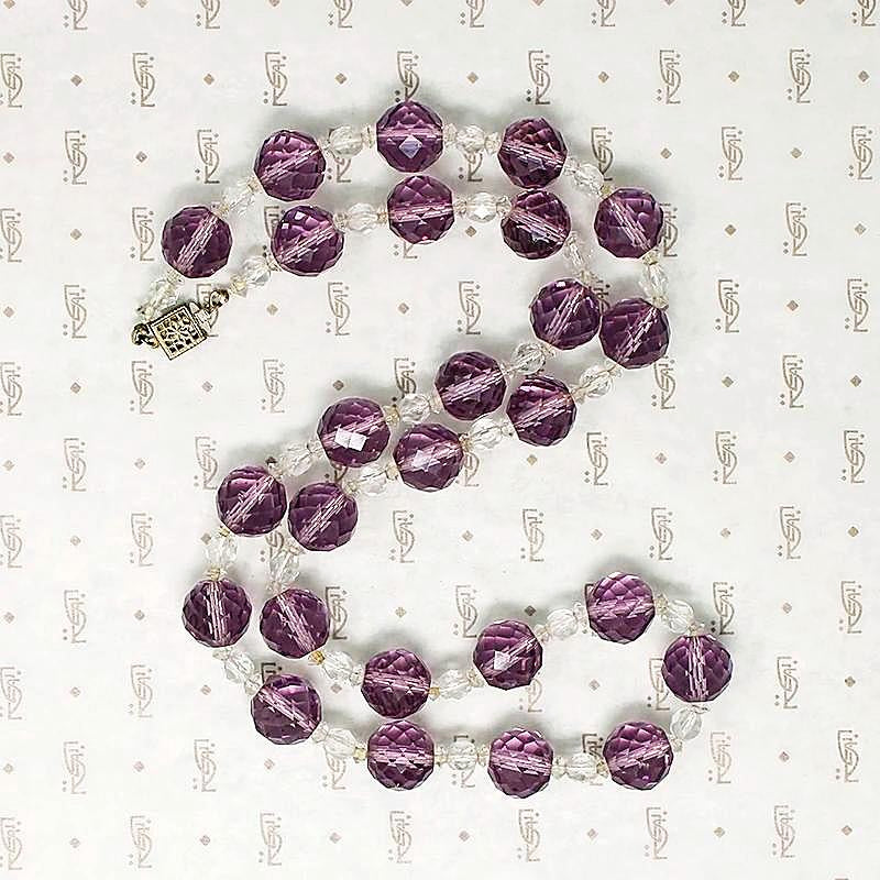 Details.....The necklace measures 26" long. The purple beads measure 13mm and the clear beads are 5.7mm. In Very Good Vintage condition. You should always expect some wear on vintage and antique jewels, we consider it a part of their charm.