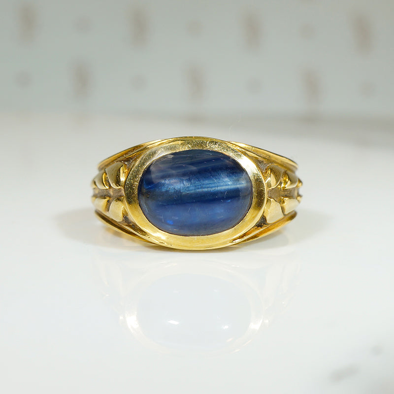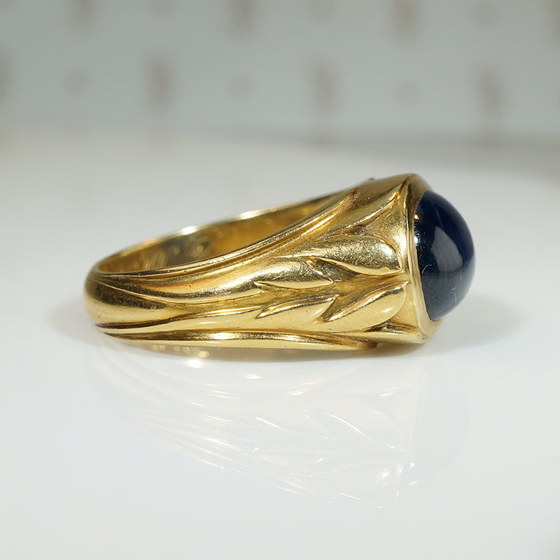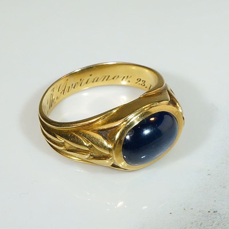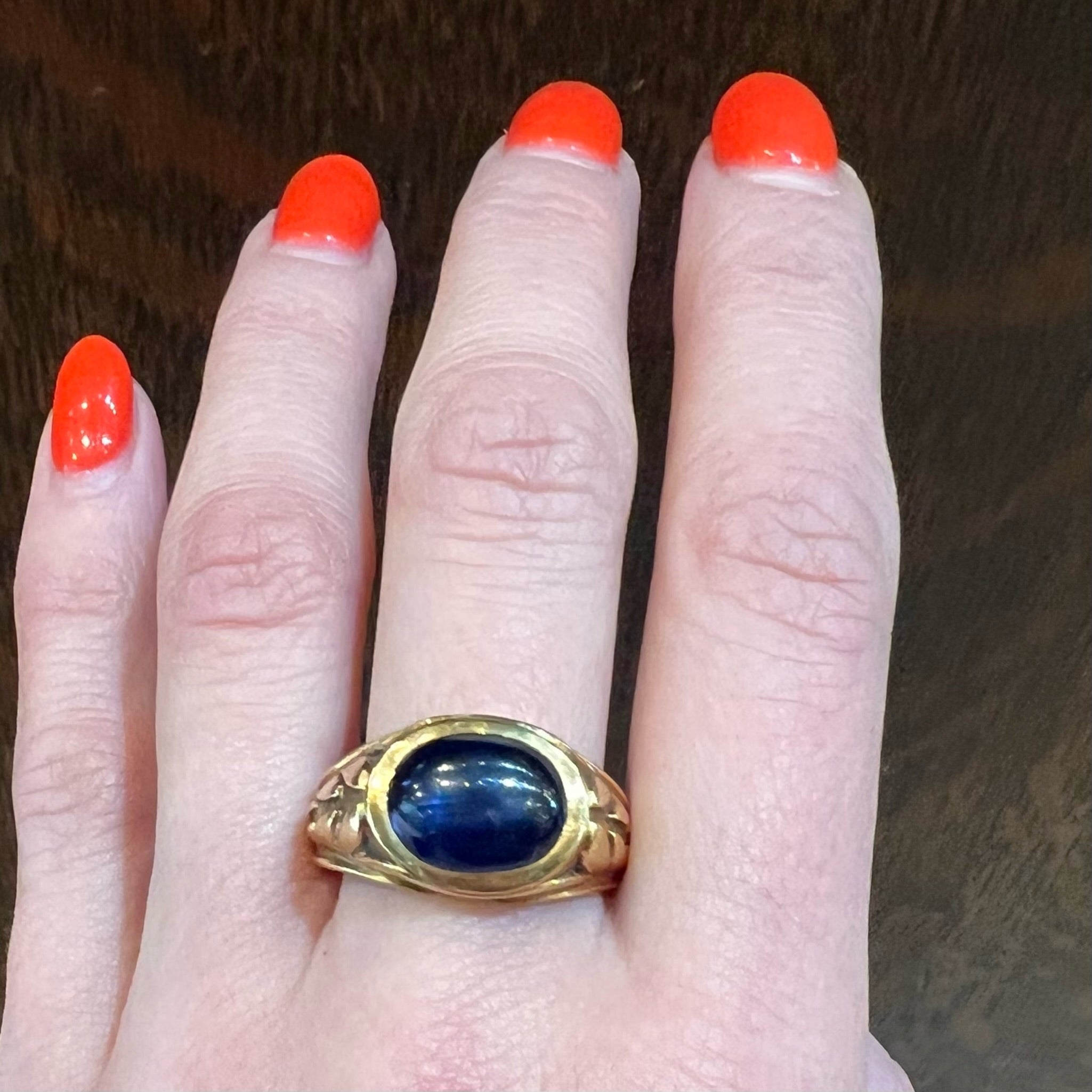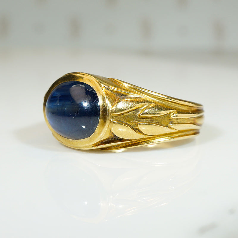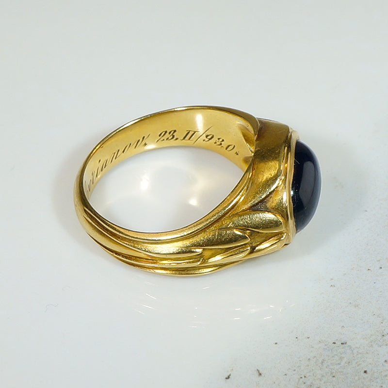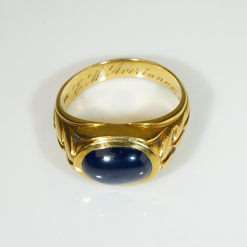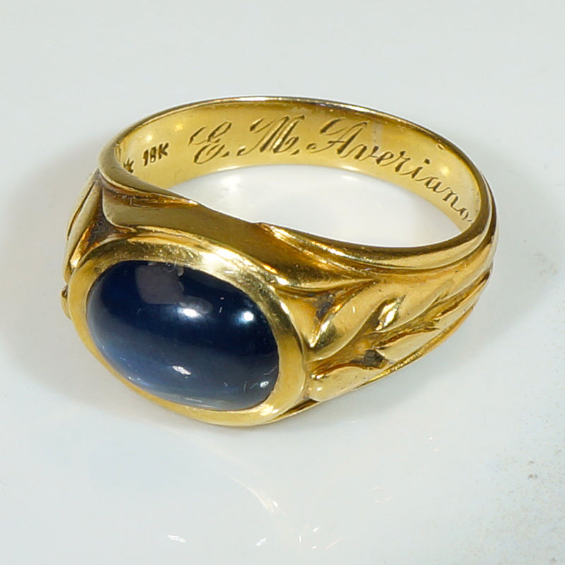 This stunning Art Nouveau 18k gold and cabochon Natural Sapphire ring is so good I can't stop looking at it. Dating from the 1890's with the organic designs this era is known for the inside of the band holds a personal inscription from 1898. The weight of the ring is 14.2 grams, it is in amazing condition, see the pictures for the full inscription.