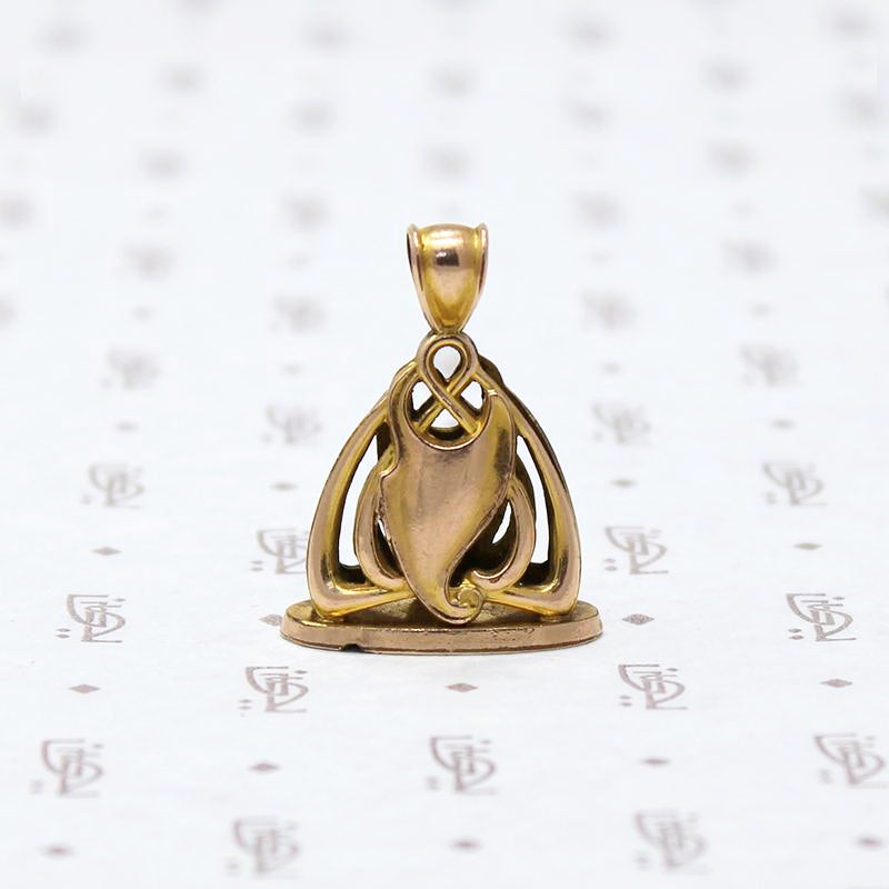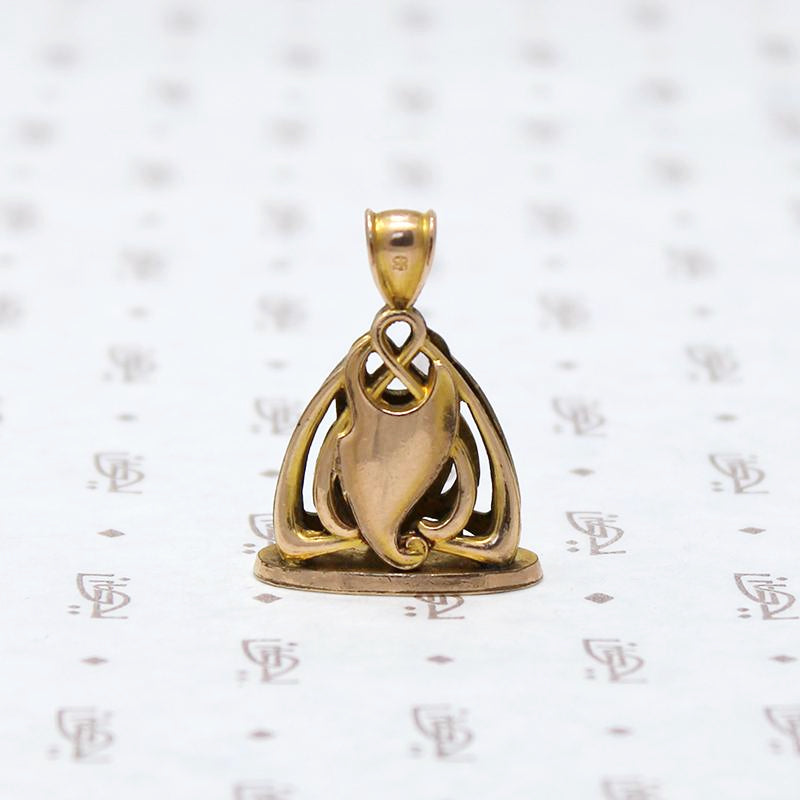 This gold filled fob is rich with Art Nouveau design elements, graceful whiplash lines and stylized natural elements. This piece shows some wear and the uncharted bottom is chippped. Wear this Victorian Revival fob as a lovely charm or pendant on one of our lovely Ancient Influences married chains and take your Chain Game to the next level. Circa 1940.