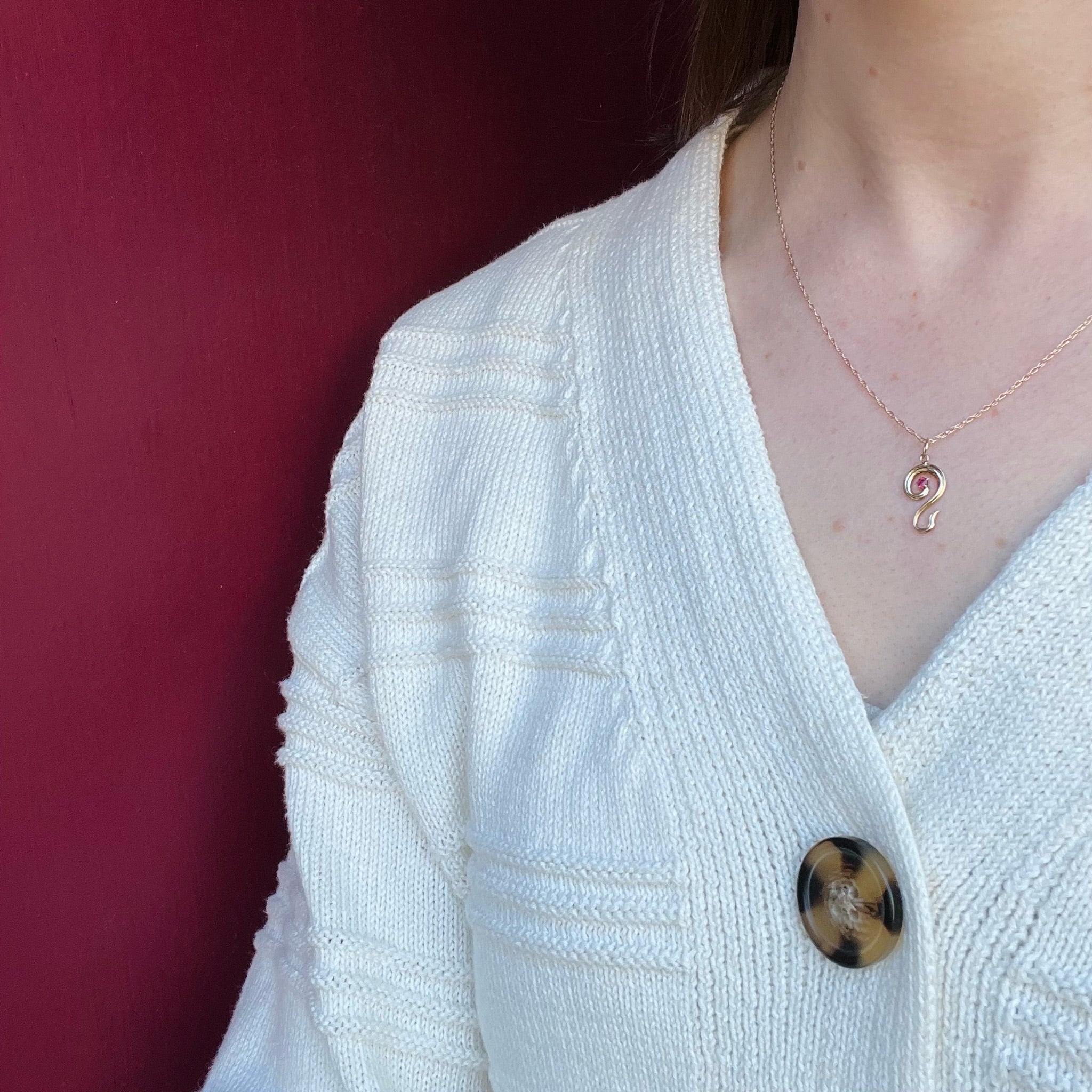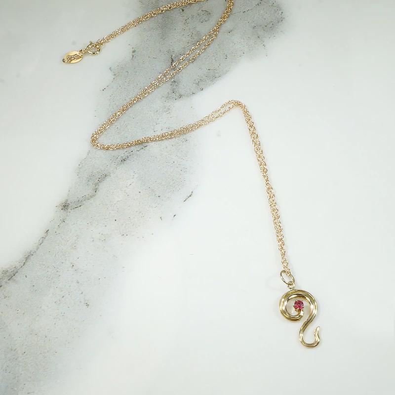 A wee ruby sits at the heart of curving whiplash lines. This pretty Art Nouveau pendant resembles a tiny snake or a curling tress of hair cast in gold. This pendant is a conversion jewel, re-purposed from a vintage stick pin into a pendant with a jump ring added for versatility. It hangs on a modern 14k recycled gold rope chain. Circa 1900.