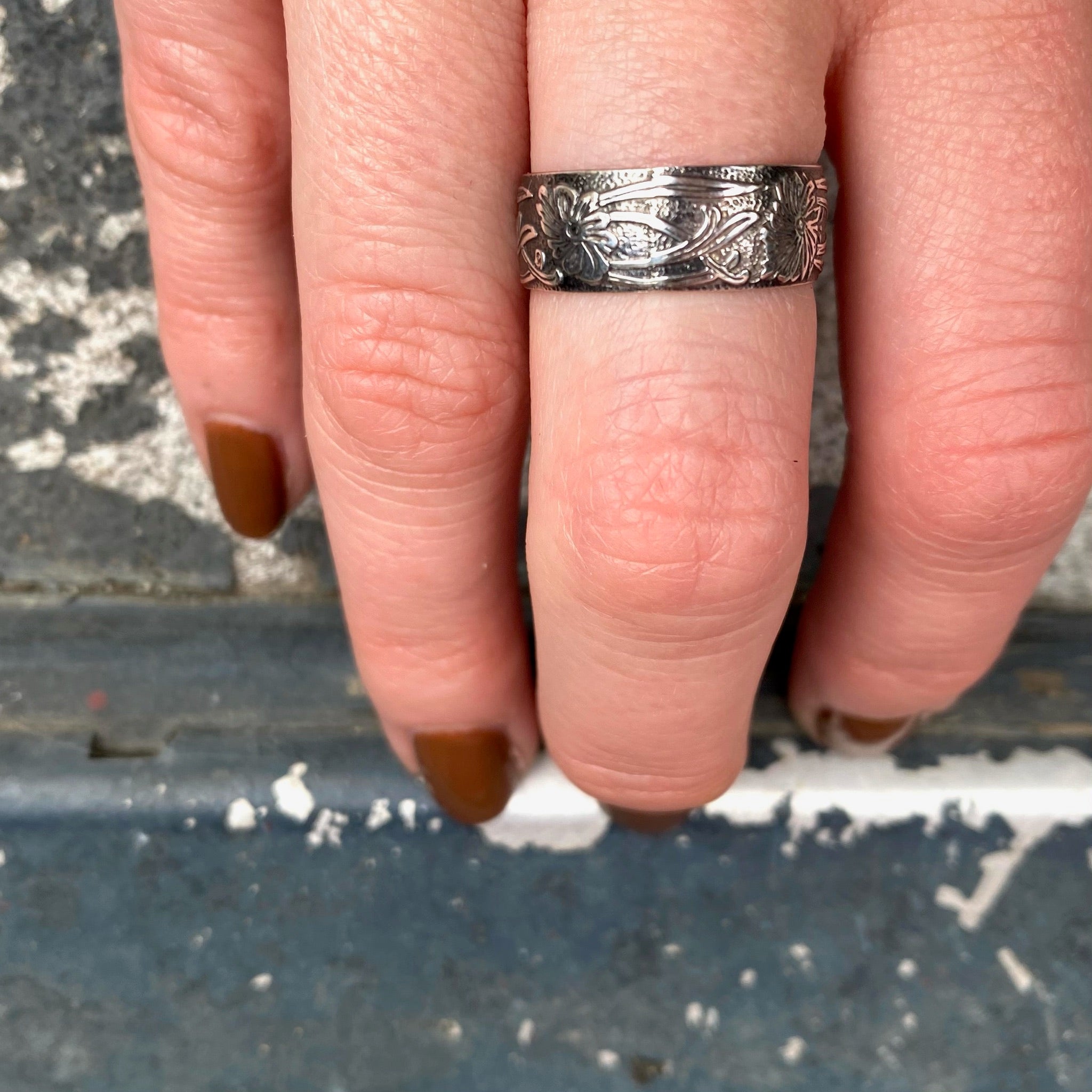 Details.....Currently a size 8. For a fee, silver rings can usually be sized within two sizes. Please contact us for sizing information about this ring. The band measures 7.4mm wide.