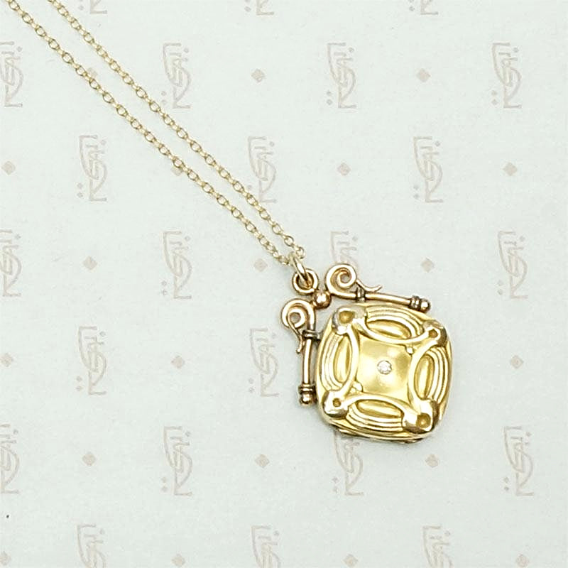 This lovely Art Nouveau locket is faced with a graceful geometric design accented with a white paste stone. The locket is held in a decorative, scrolling frame with an integrated bale. The interior of the locket is marked with a heart containing the initials "W&H CO," "Pat Aug 2 04" is stamped below. The interior glass and frame are missing. Circa 1904.