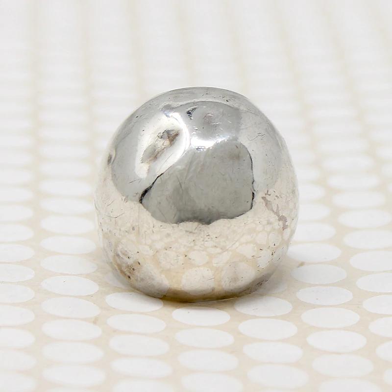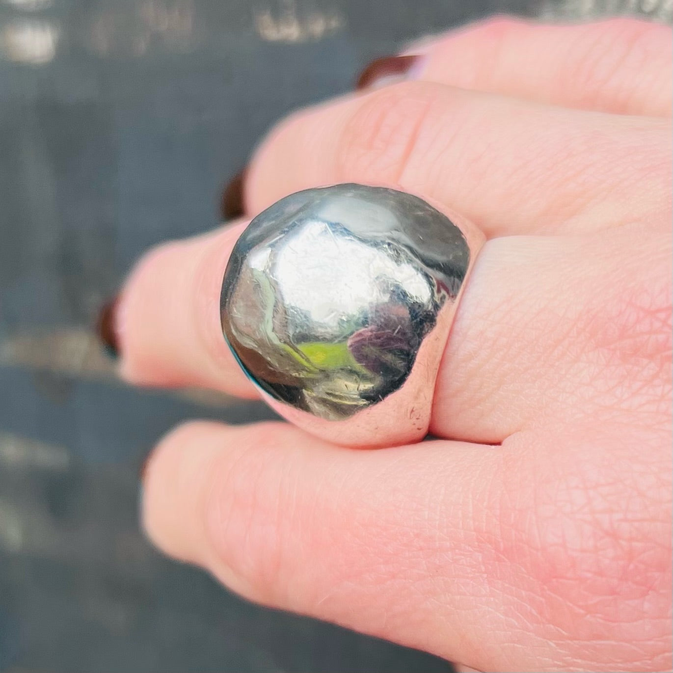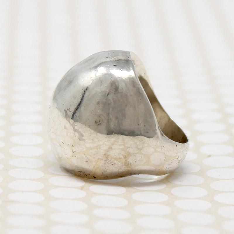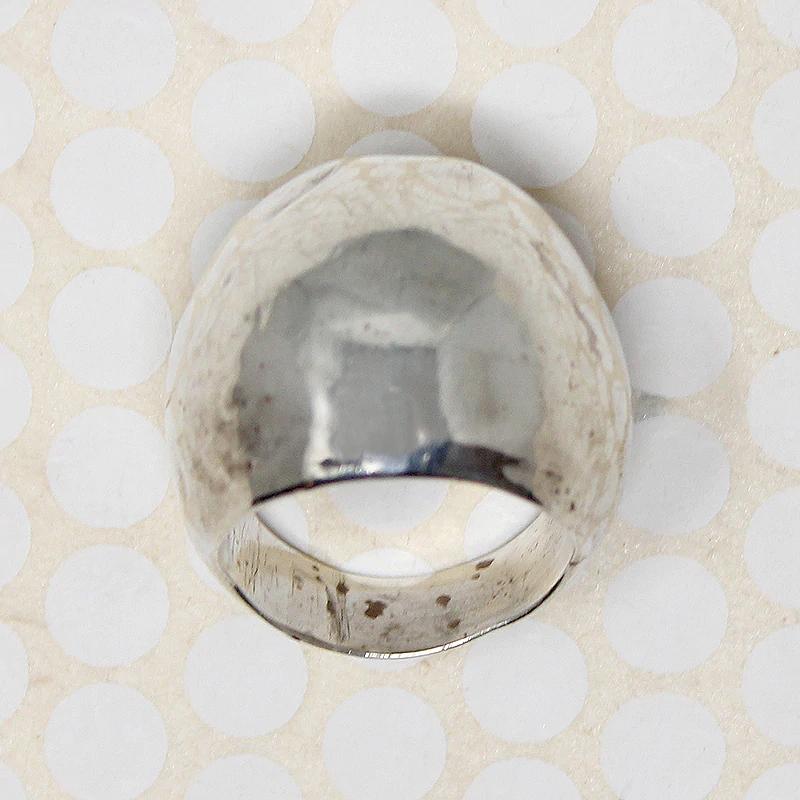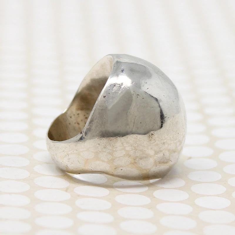 A bold sterling silver dome ring with an artfully dented finish. Very Modernist, this dramatic ring will go with everything. The dome is hollow making the ring light weight and comfortable to wear. Circa 1980.