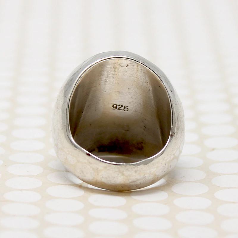 Details.....Currently a size 7.75. For a fee, silver rings can usually be sized within two sizes. Please contact us for sizing information about this ring. The front of the band measures 26mm wide, the back measures 7.1mm, and the profile is 9.5mm tall. In Very Good Vintage Condition. You should expect all vintage and antique jewels to show some wear, we consider it part of their charm.