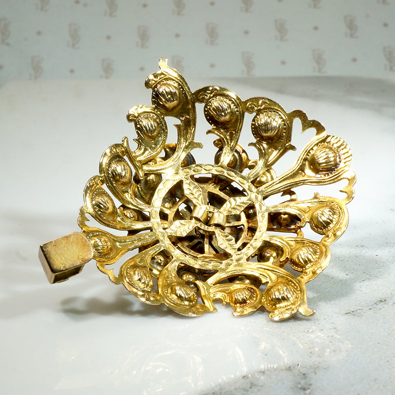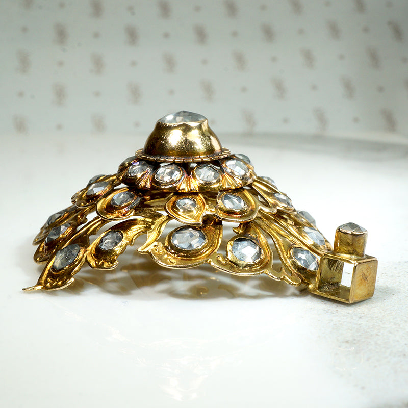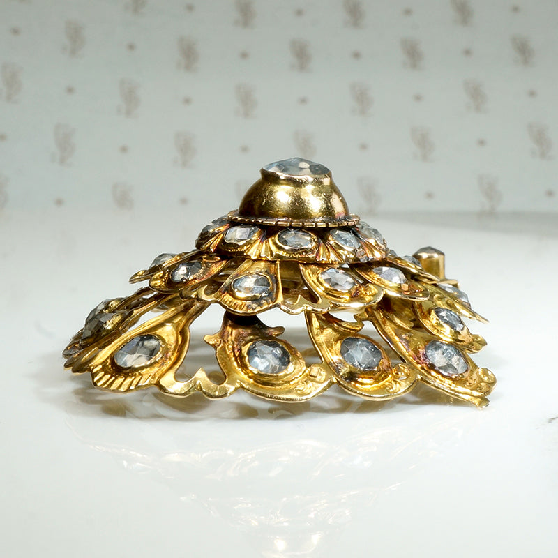 Utterly breathtaking, this is the finest use of white sapphires we have ever seen. This generous Georgian pendant features a trove of rose-cut white sapphires set in tiers of 14k gold. A central sapphire is collet set raised over layers of pierced and engraved gold petals. Each petal is set with sapphires of varying sizes. A large square bale is set with a final sapphire. Turn the pendant over, and you will observe the jewel is exquisitely engraved on every surface. A rich bloom enhances the gorgeously worked gold. The gems are foiled in closed-back settings, creating a moody, mystical effect. Historically, this astonishing pendant would have been worn on a ribbon, but it would also look great on one of our Ancient Influences married chains. Circa 1800.