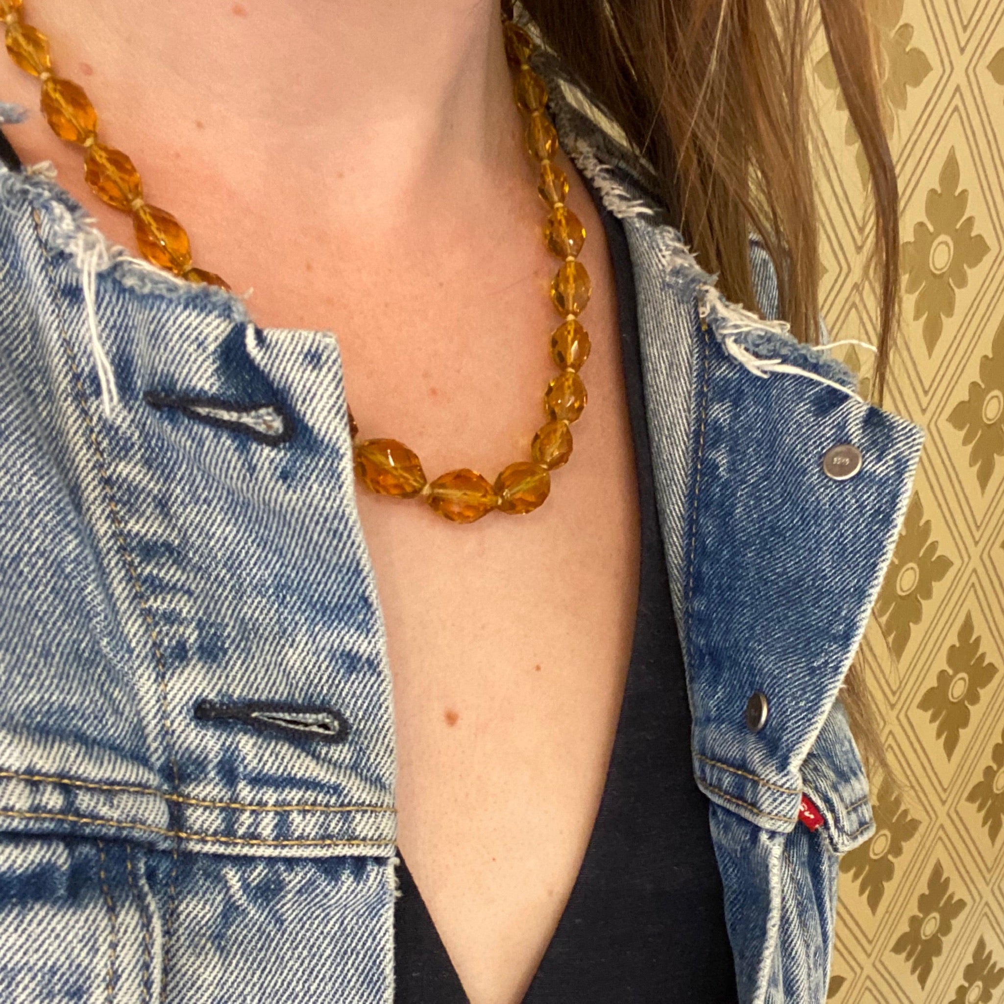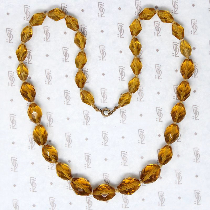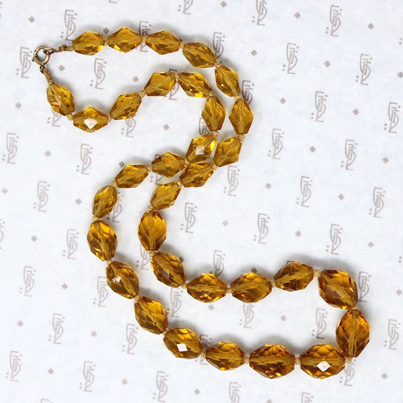 Warm, whisky-colored graduated glass beads are hand knotted on gold silk. The necklace is finished with a brass C-clasp. This Art Deco era necklace will be perfect paired with autumnal sweaters. Circa 1920.