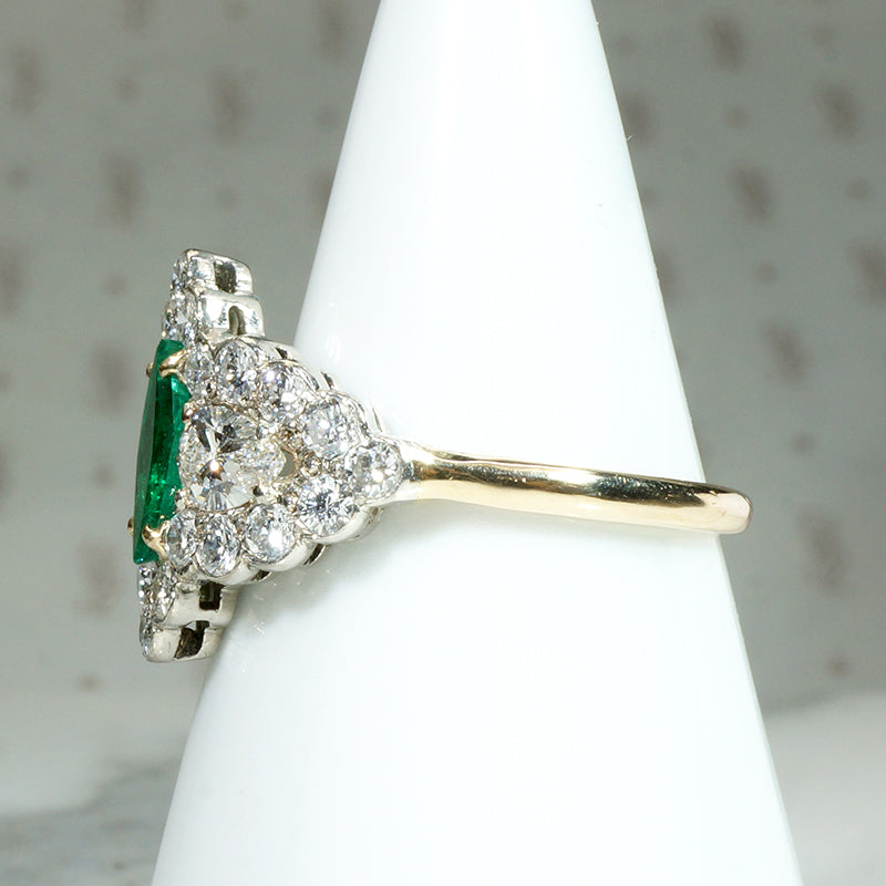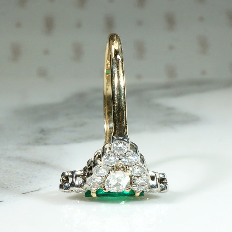 Inspire awe with this incredible marquise emerald and diamond two-tone 14k gold ring. The .72ct emerald is prong set in yellow gold at the center of the ring. Two .35ct pear-cut diamonds flank the verdant emerald. The top of the ring is framed by an entourage of 24 brilliant cut accent diamonds, creating a navette effect. The diamonds are set in white gold, maximizing their color and sparkle. The marvelous gemstones sit over the yellow gold body of the ring, with a low-profile gallery and a tapered band. The generous 1.58tcw of dazzling diamonds highlight the intense green color of the emerald. You won't be able to tear your eyes away from this stunner. Circa 1930.