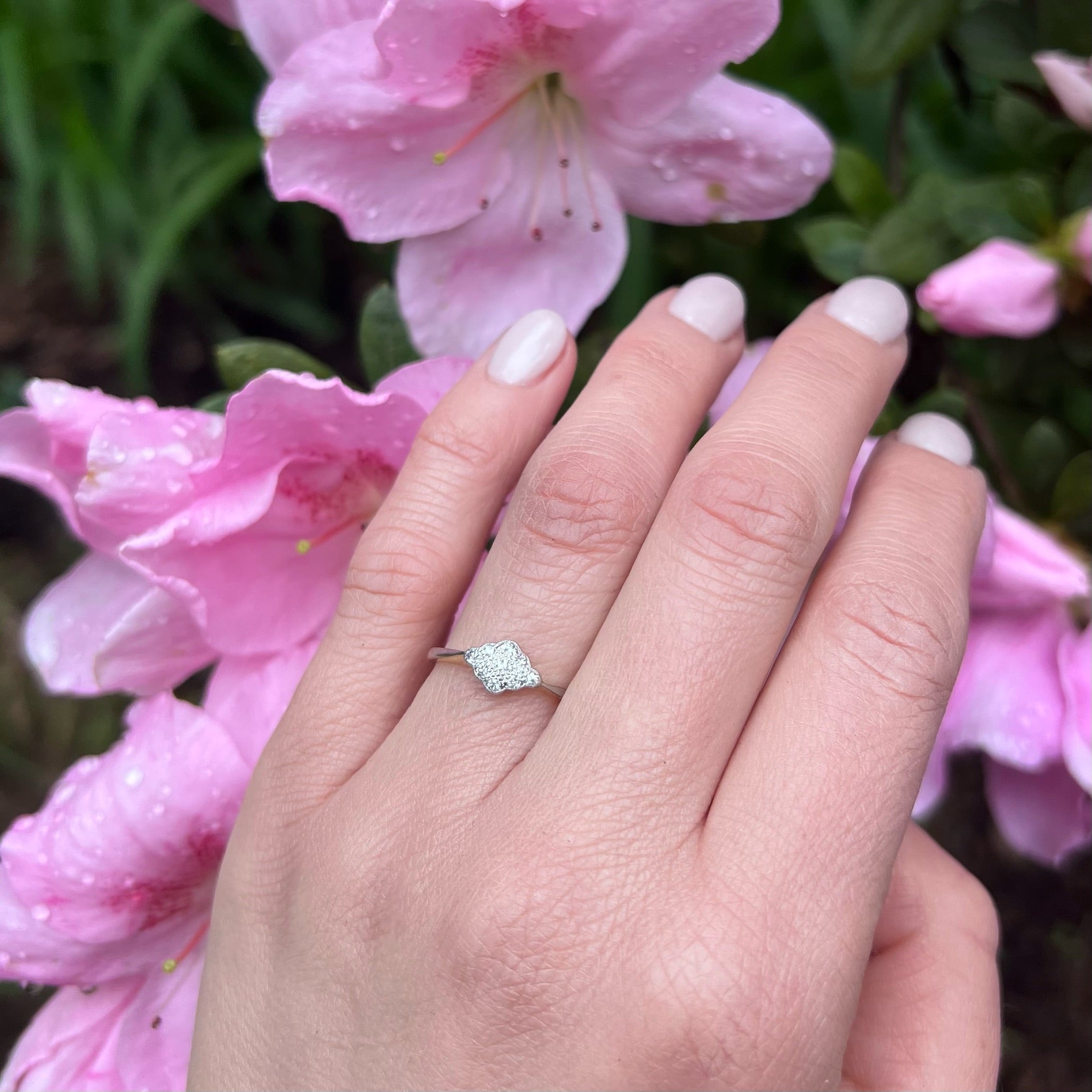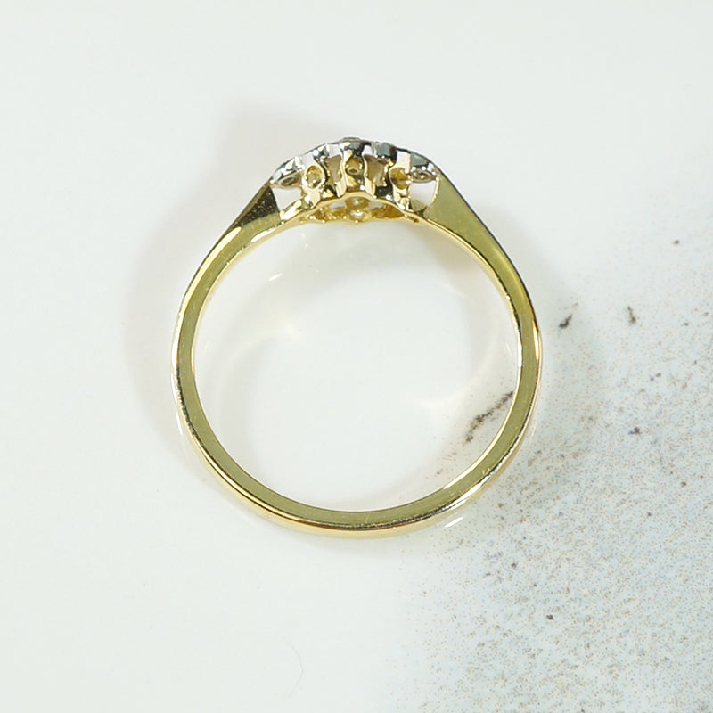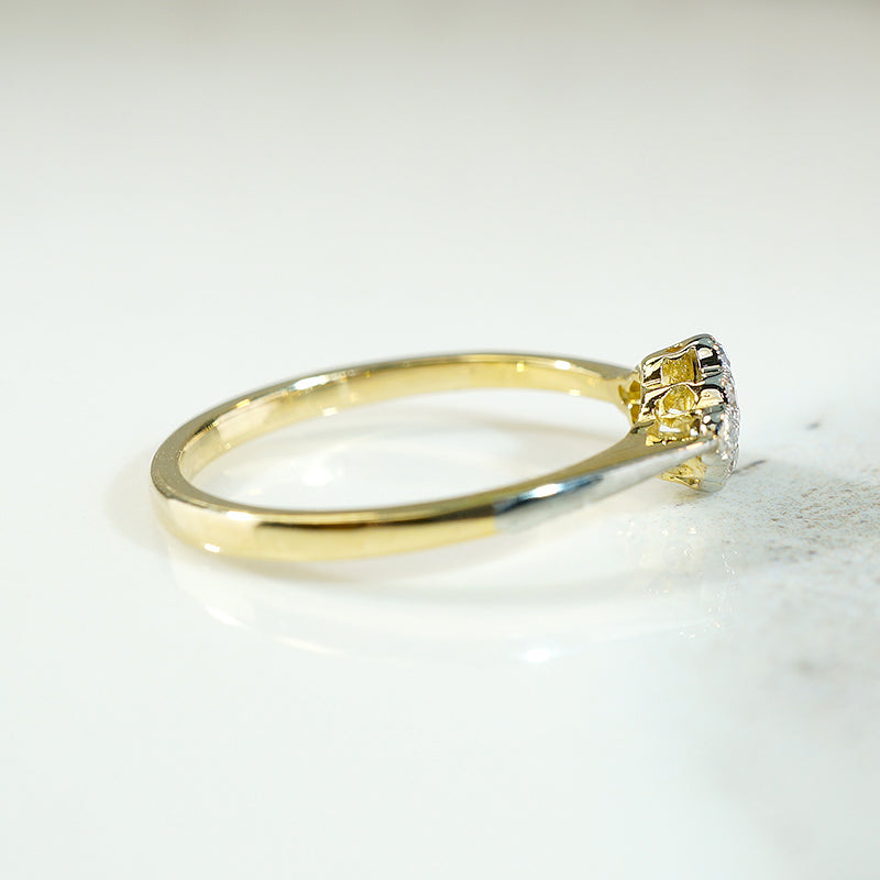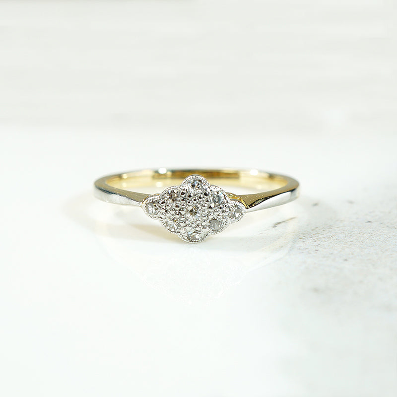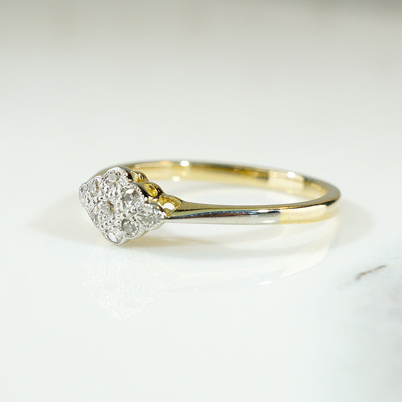 This baby navette ring was made using the luxurious Edwardian technique of layering platinum over 18ct yellow gold. The petite navette of scalloped platinum has an unexpected east/west orientation. The platinum is set with a cluster of little twinkling diamonds, with delicate engraved milgrain surrounding the stones. The platinum is layered over a gallery and shoulders of rich 18ct yellow gold. The pinched shoulders widen gracefully into a narrow band. This antique ring will make a lovely and very wearable engagement ring. Circa 1910.