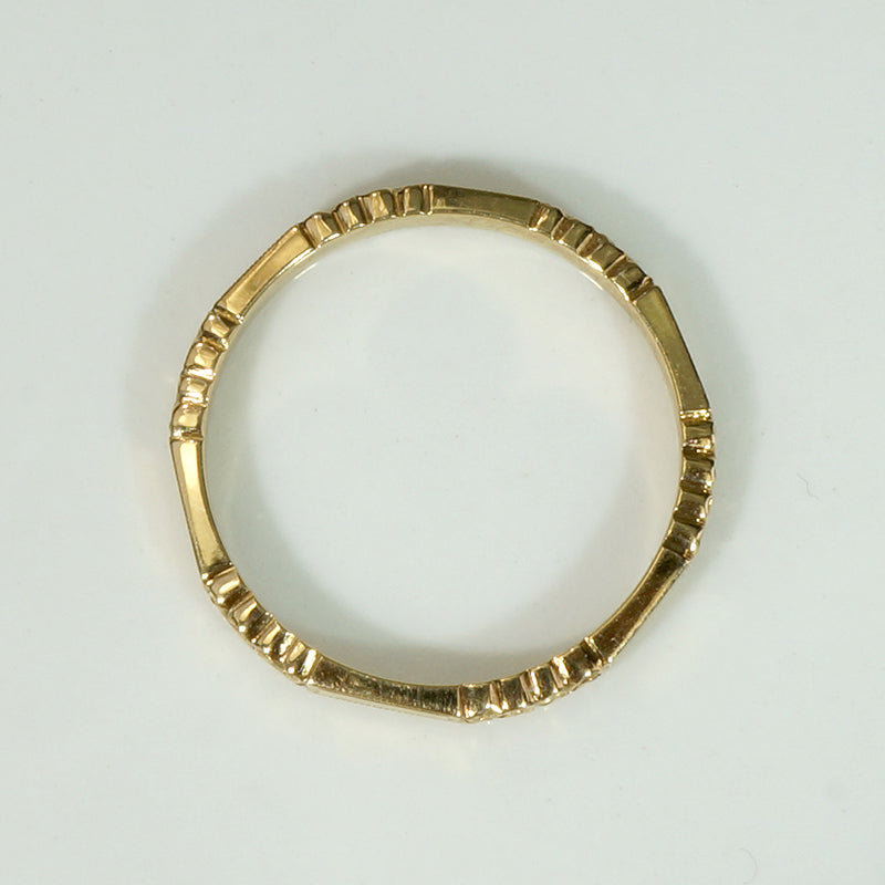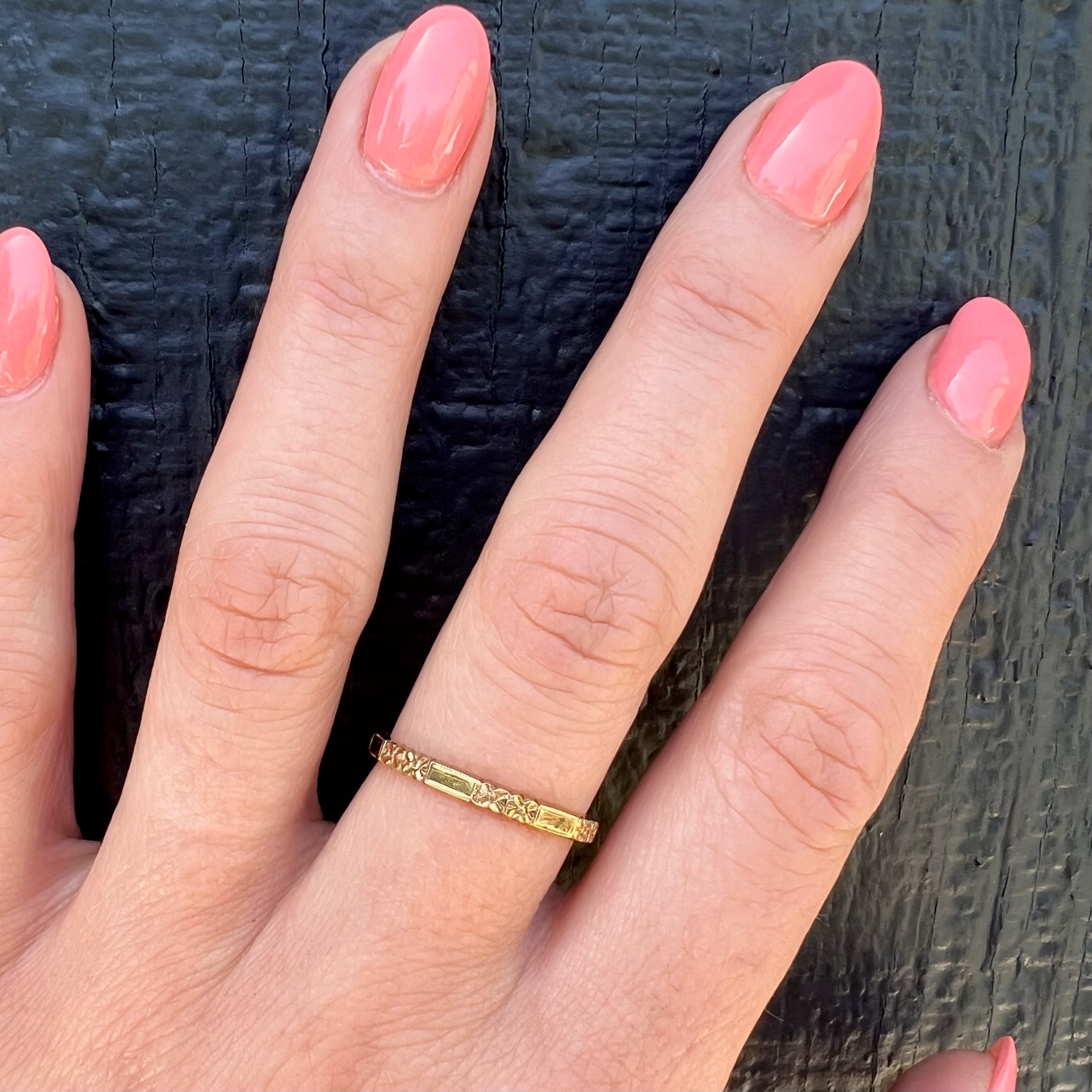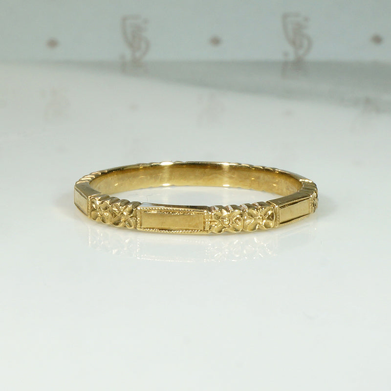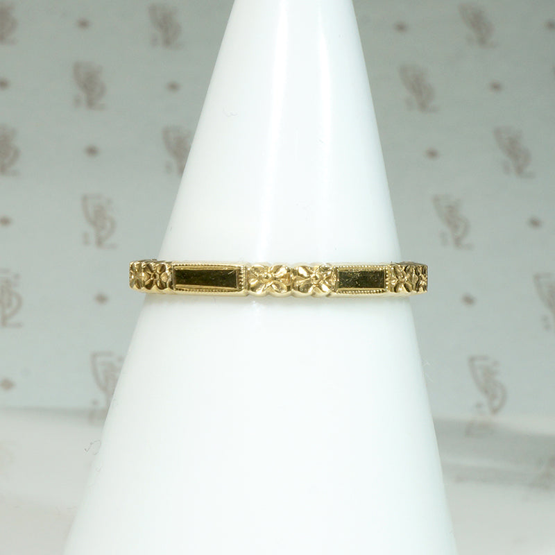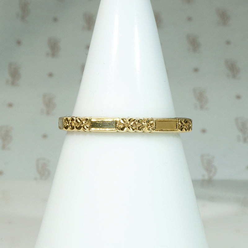 A slender 14k gold band engraved with wonderful Art Deco detail. The band has a pattern of double flowers alternated with shiny bars. Pairing soft florals with crisp geometric elements was a popular trend during this stylish era. The interior of the band is stamped "14k" and "B+B." The band is New Old Stock, true vintage that has never before been sold to the public. You can be the first person to enjoy this wonderful vintage ring. Circa 1930.